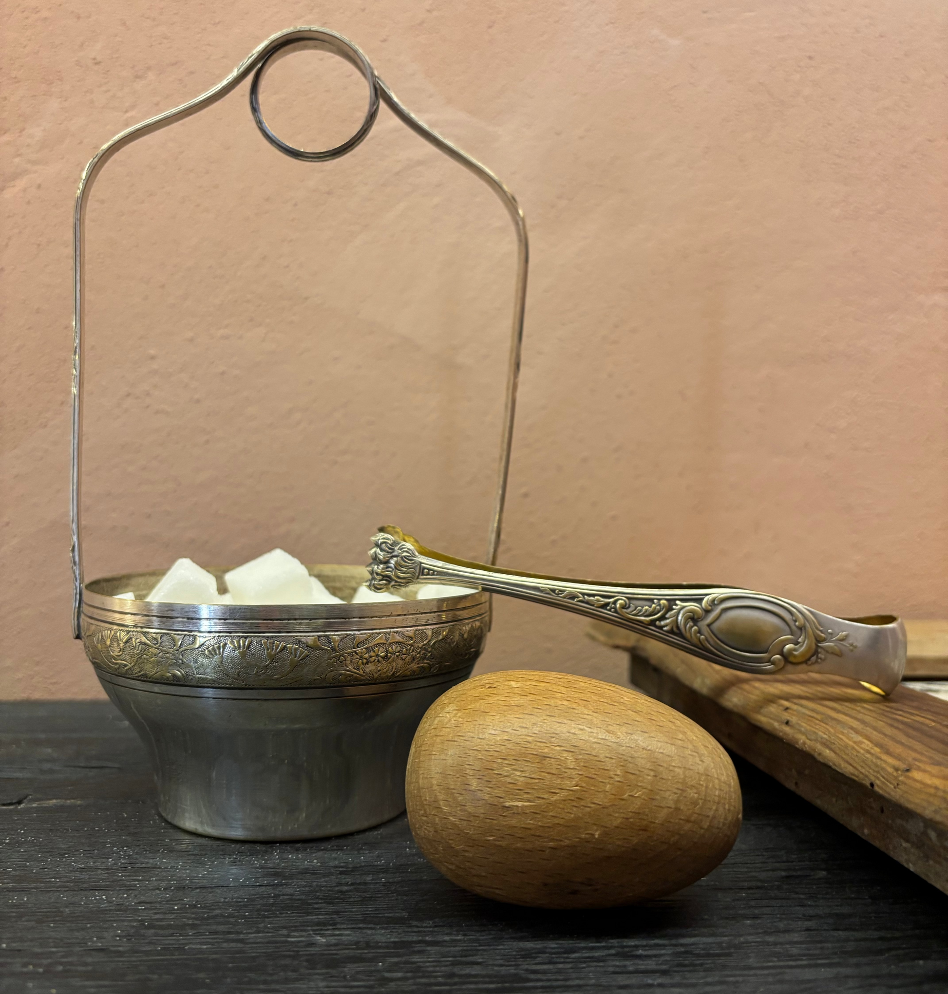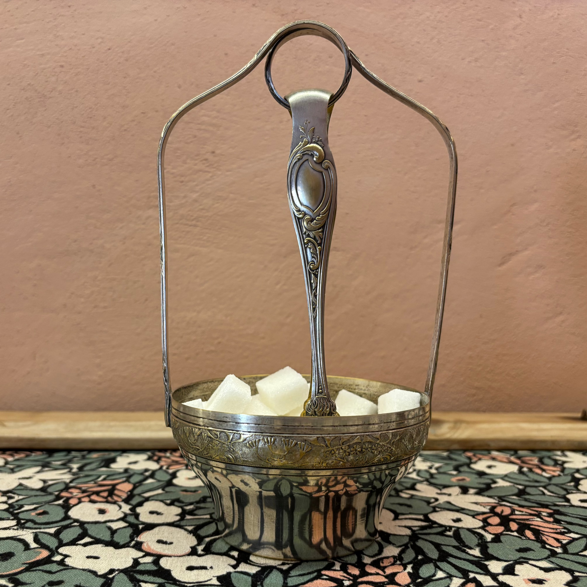 Antiguo azucarero en metal plateado con trabajos de orfebrería, acompañado de su pinza original para terrones de azúcar.