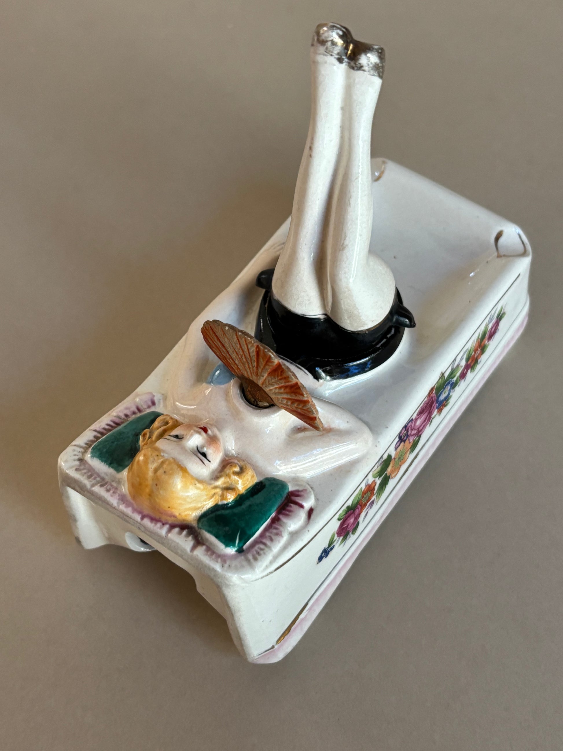 Antiguo cenicero en porcelana. Pin-Up, las piernas son movibles, igual que el abanico que sujeta. En un lateral hay un orificio para apoyar el puro y así da movilidad a las piernas.
