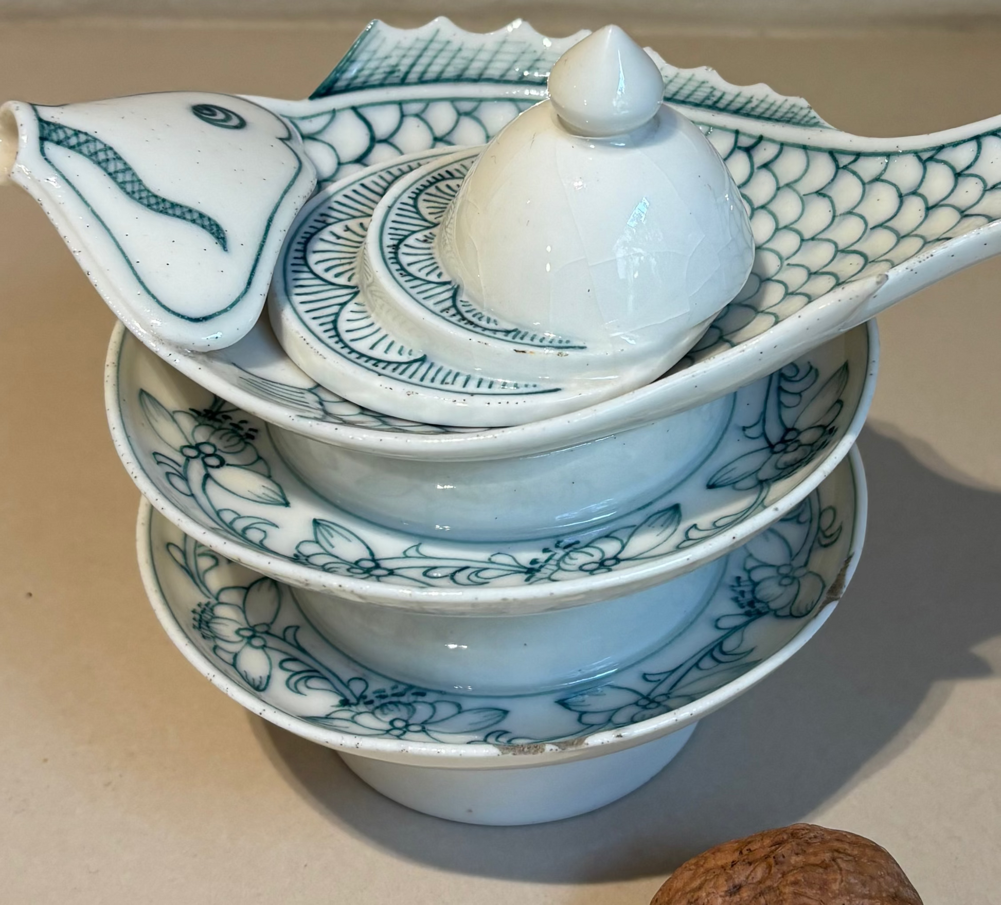 Antiguo recipiente japonés, utilizado como posible salsera, en porcelana pintada a mano.