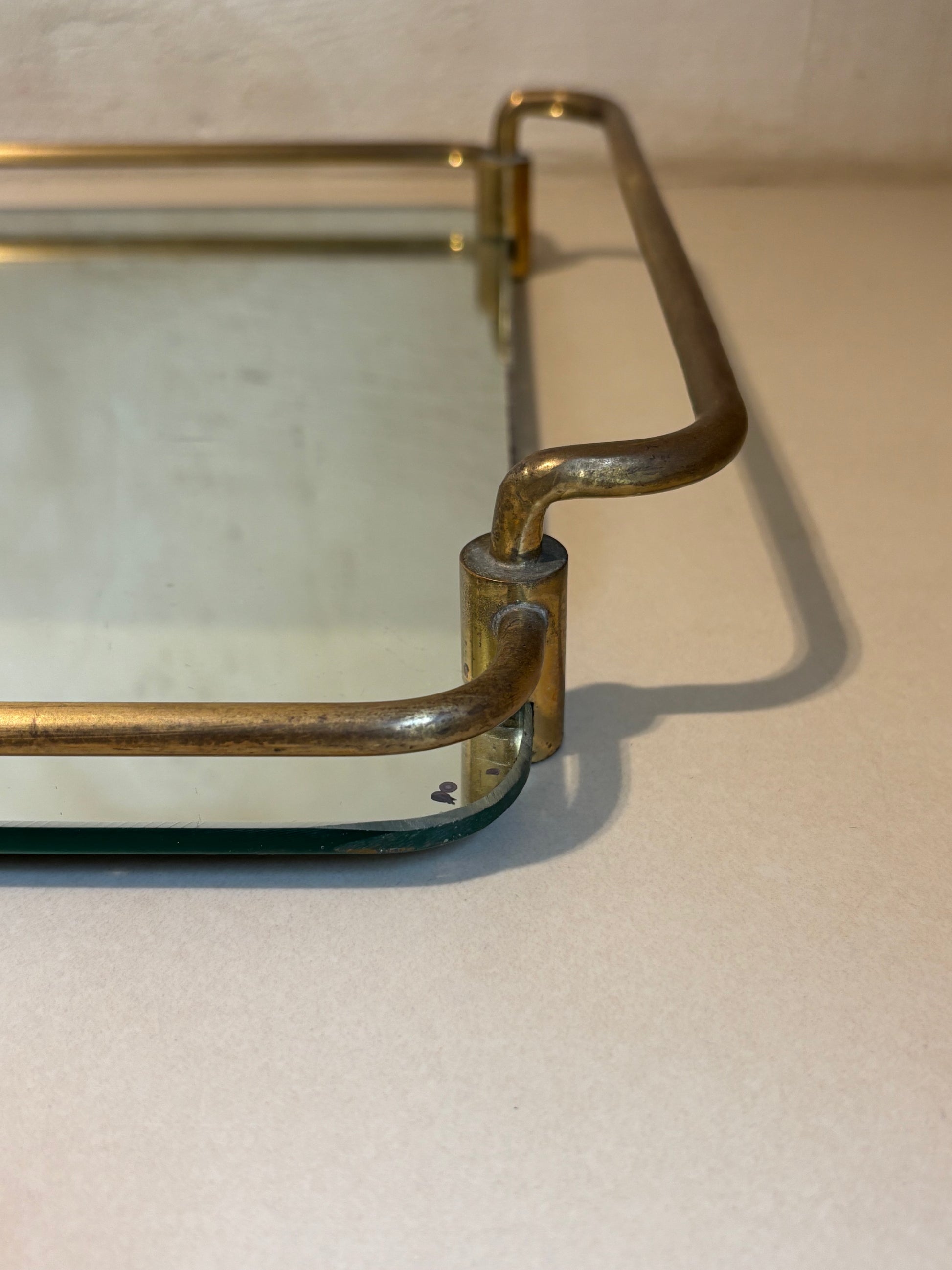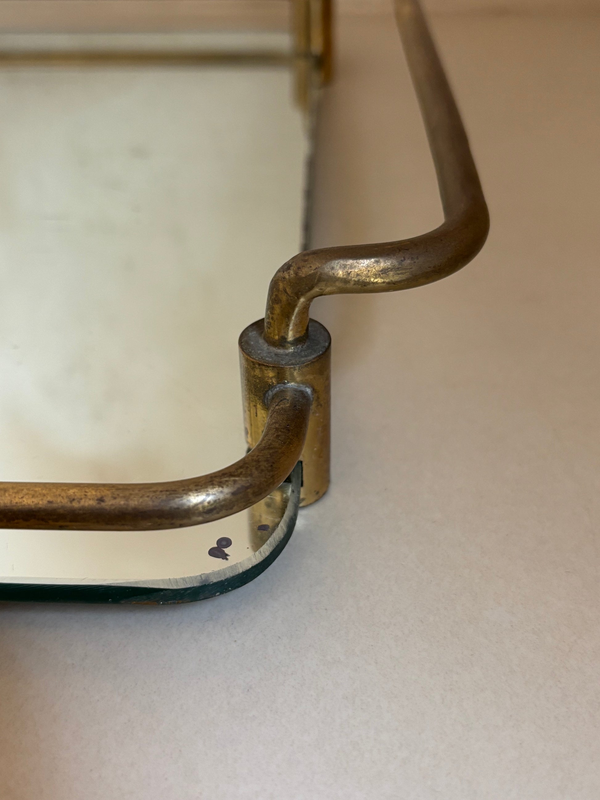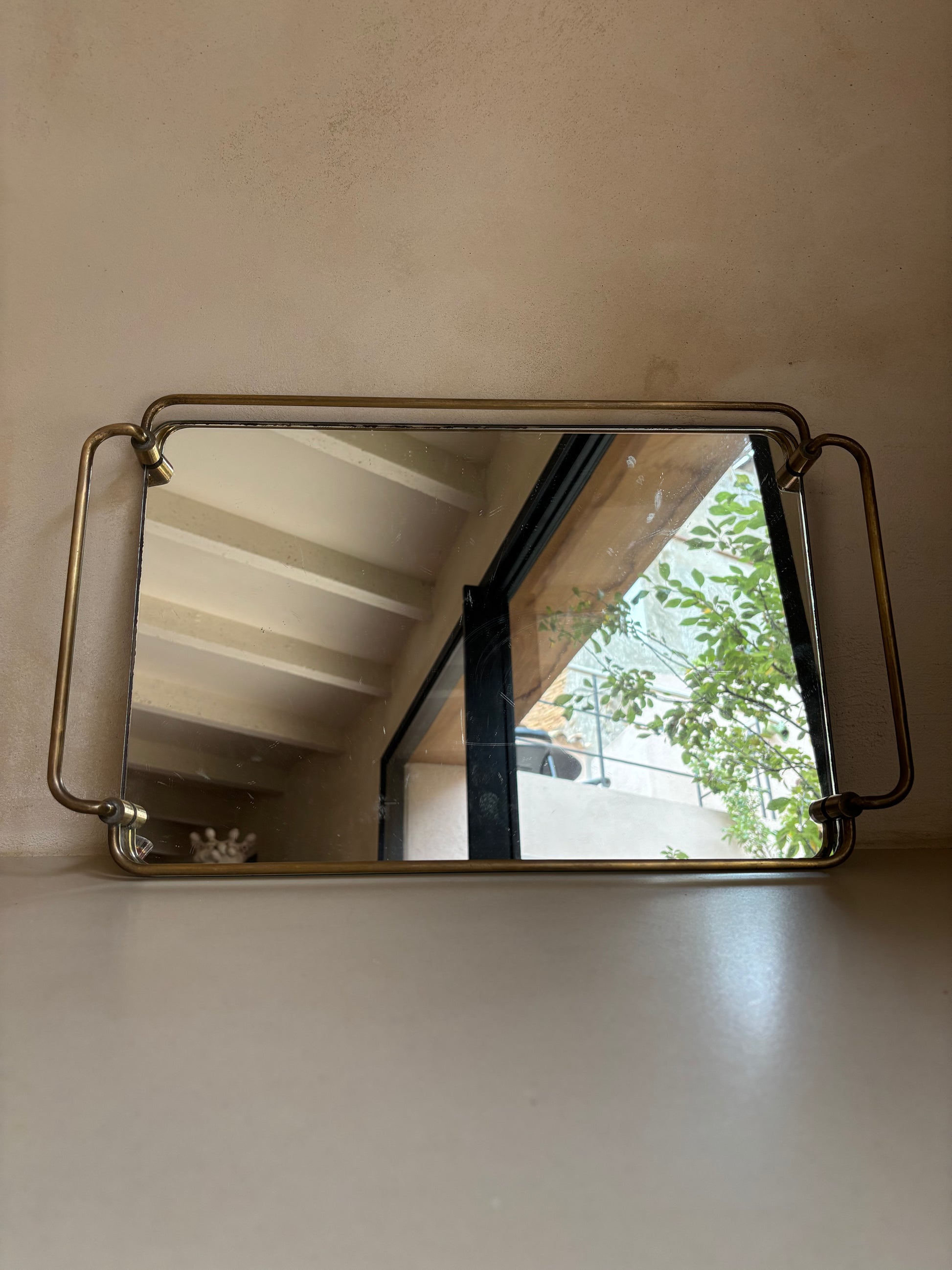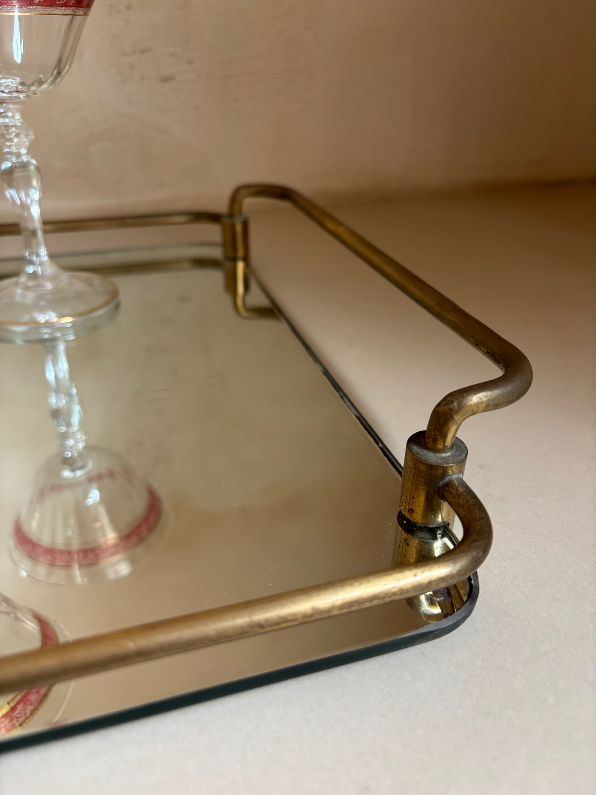 Antigua bandeja rectangular en bronce, con base de espejo que realza el brillo de los objetos colocados sobre ella.