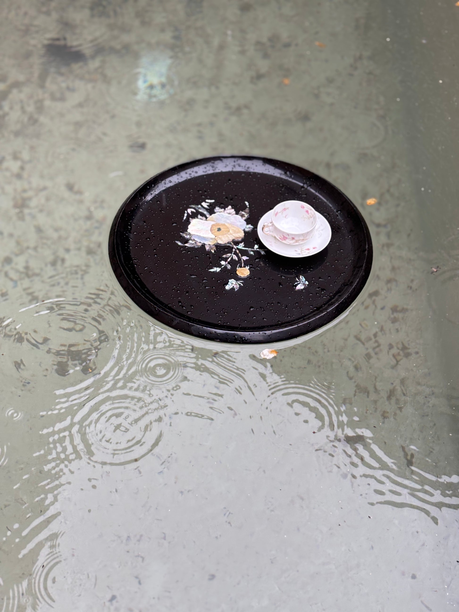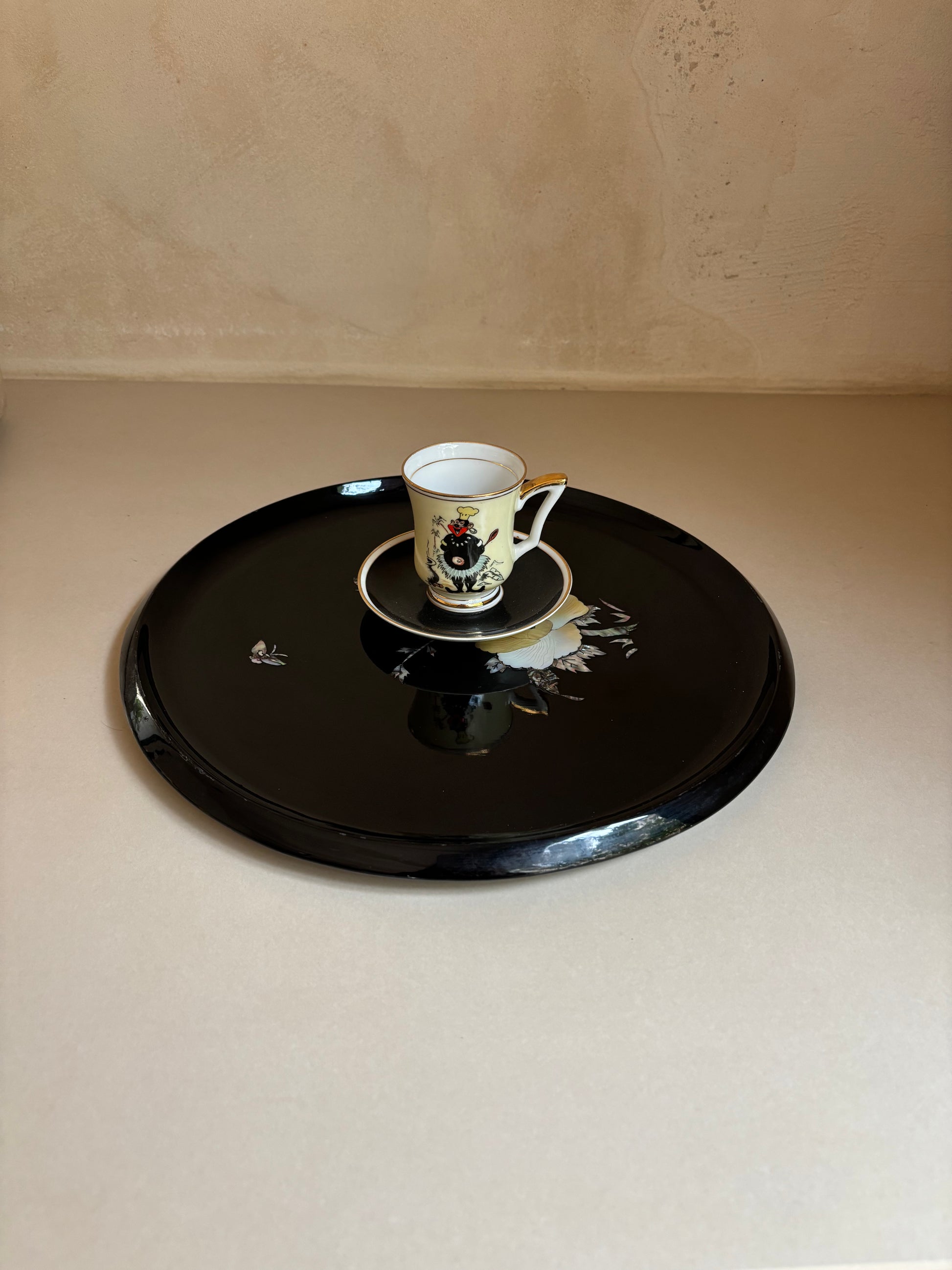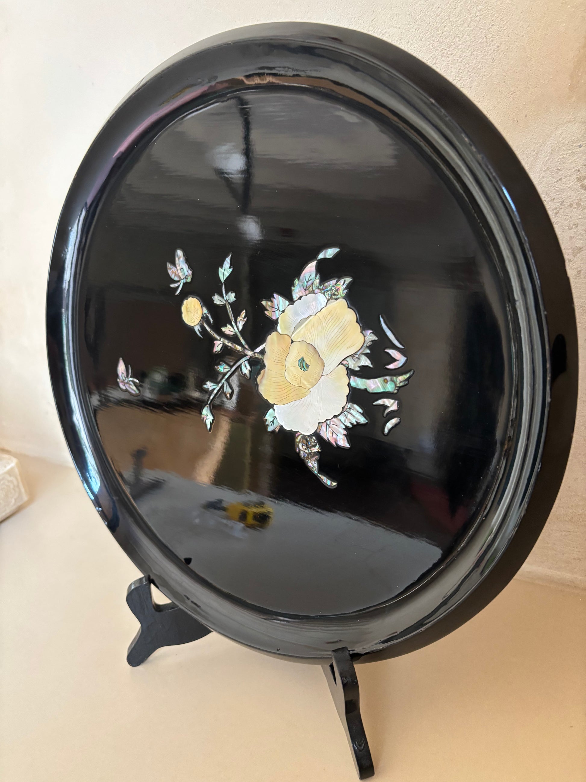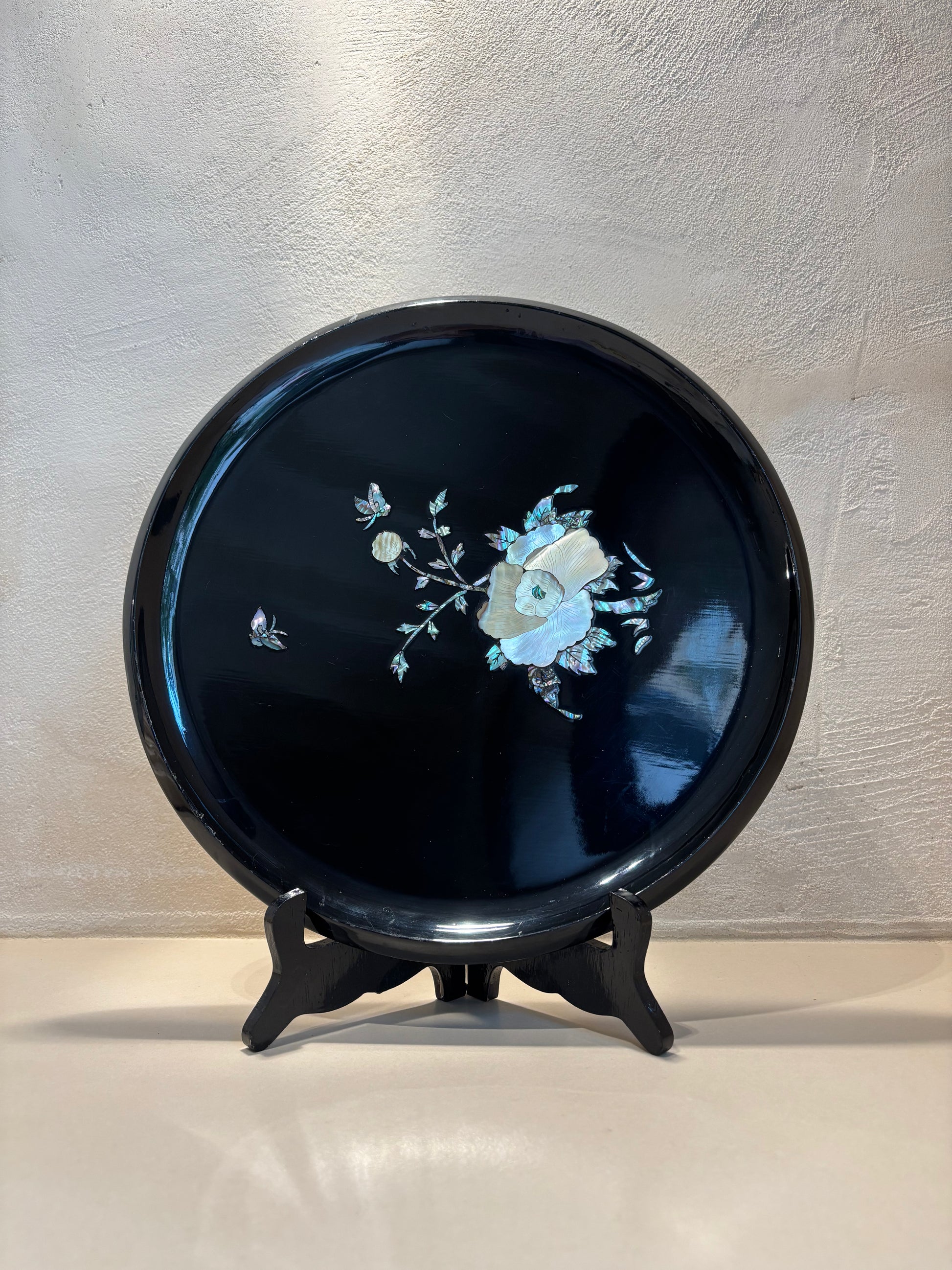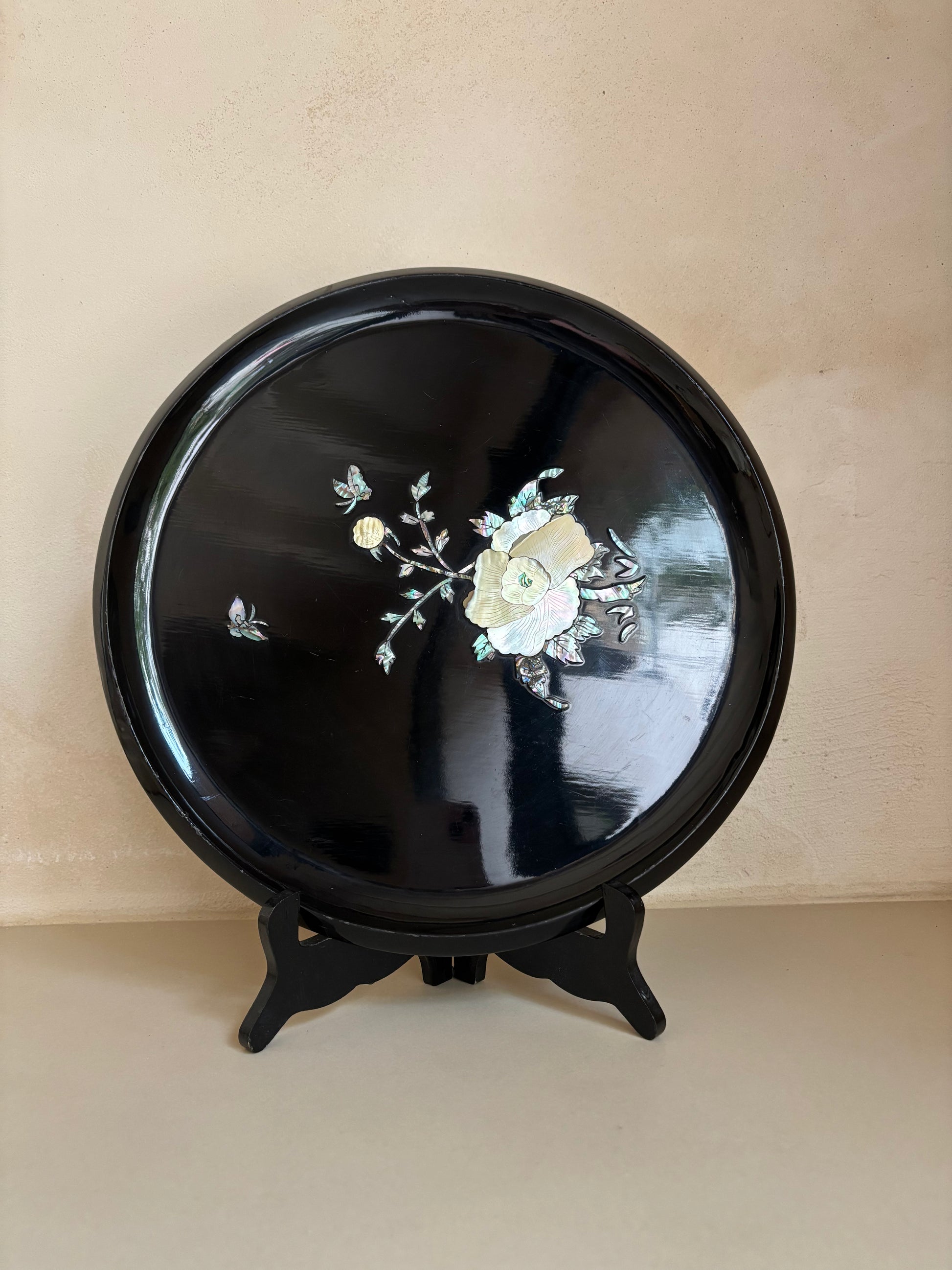 Bandeja de madera lacada en negro, con incrustaciones de nácar hecho a mano realzando el detalle floral.