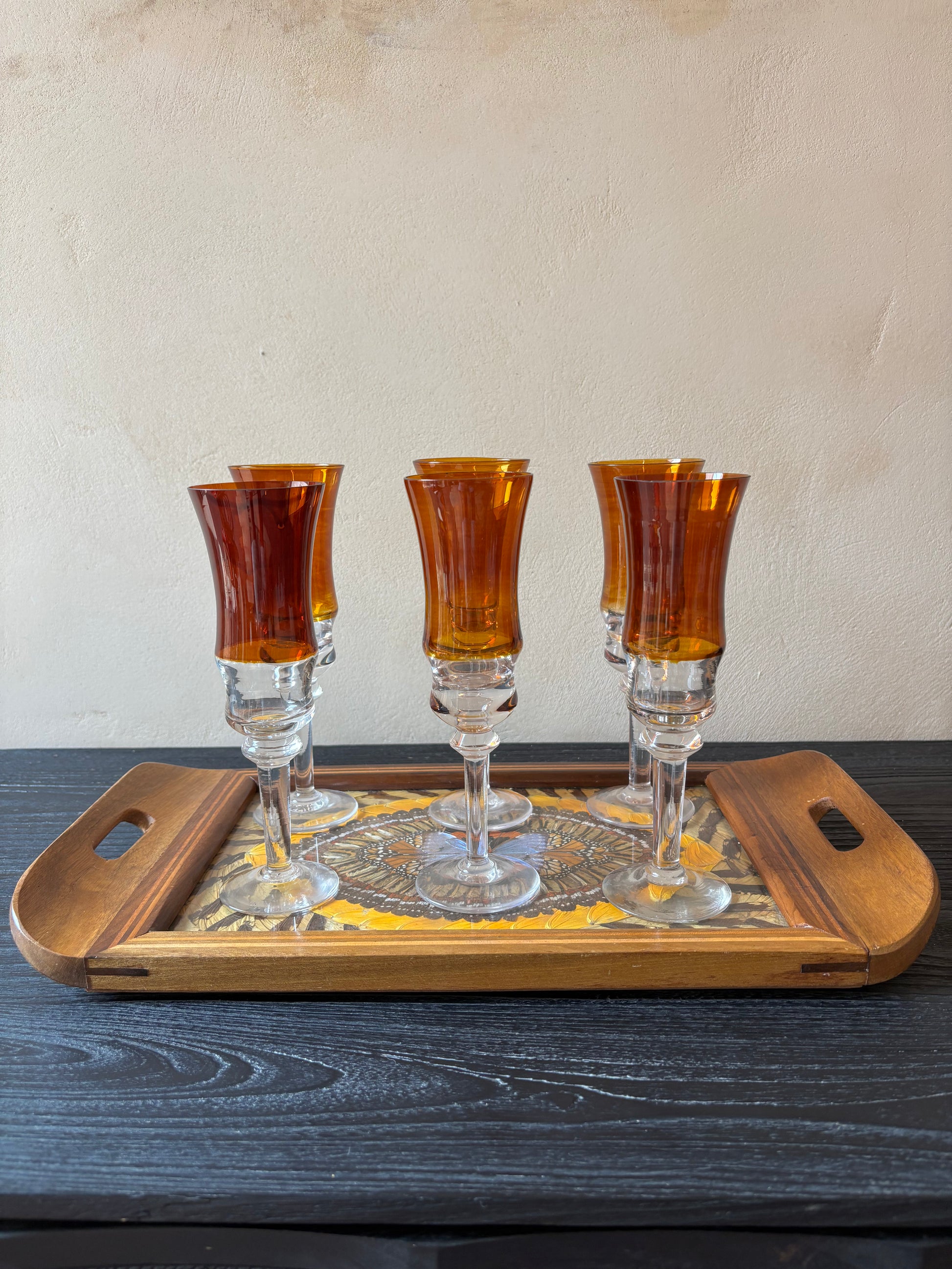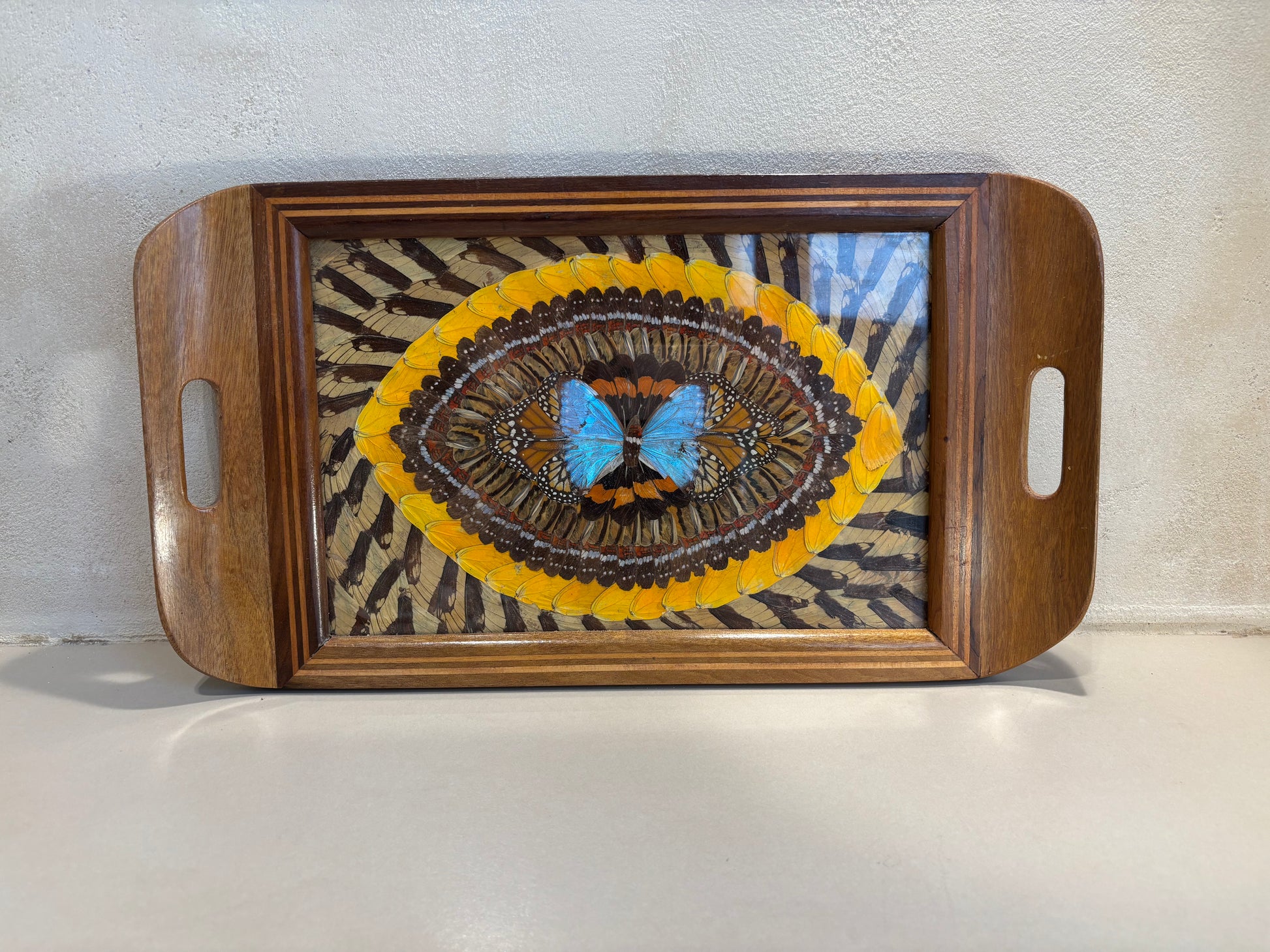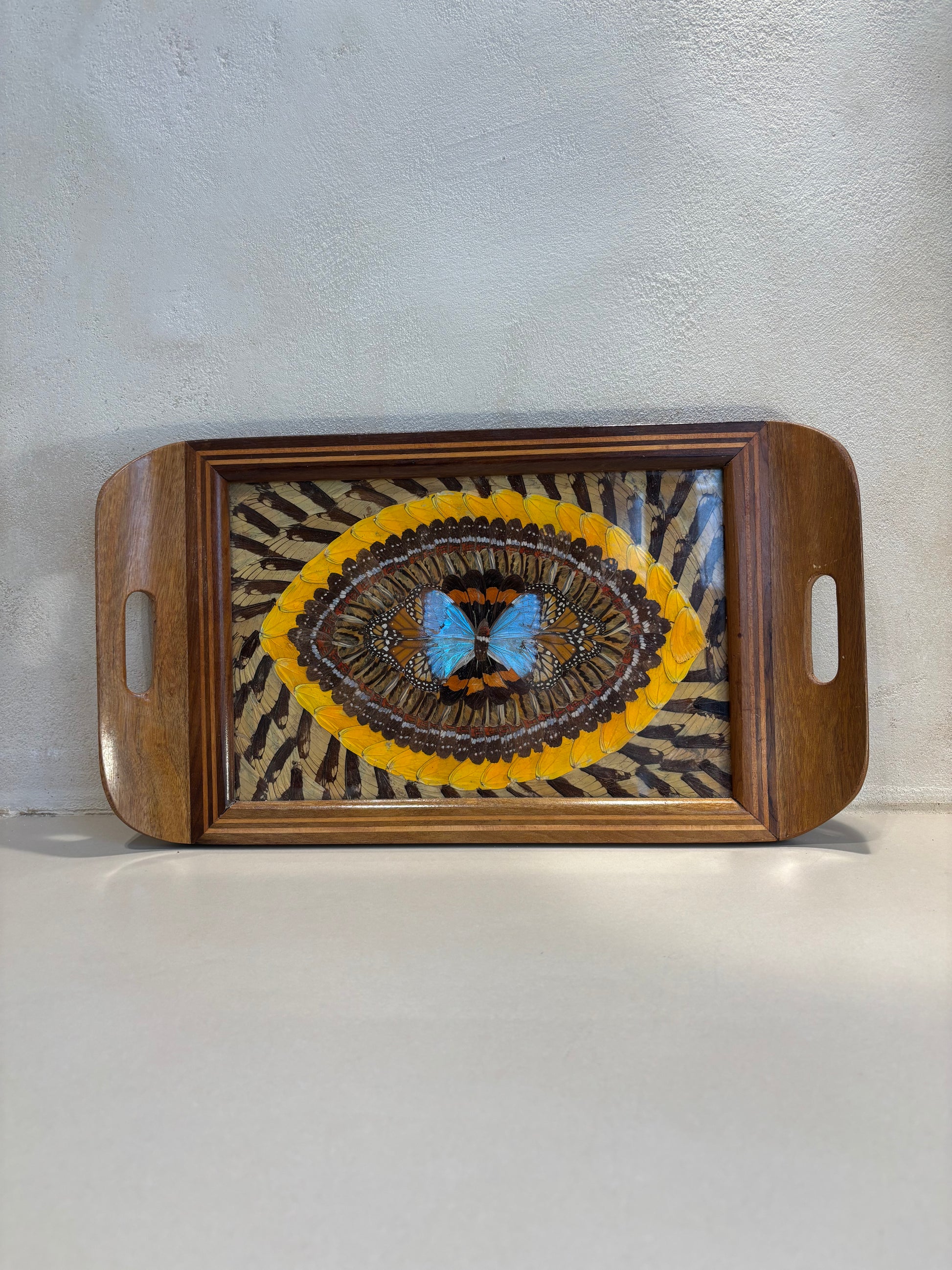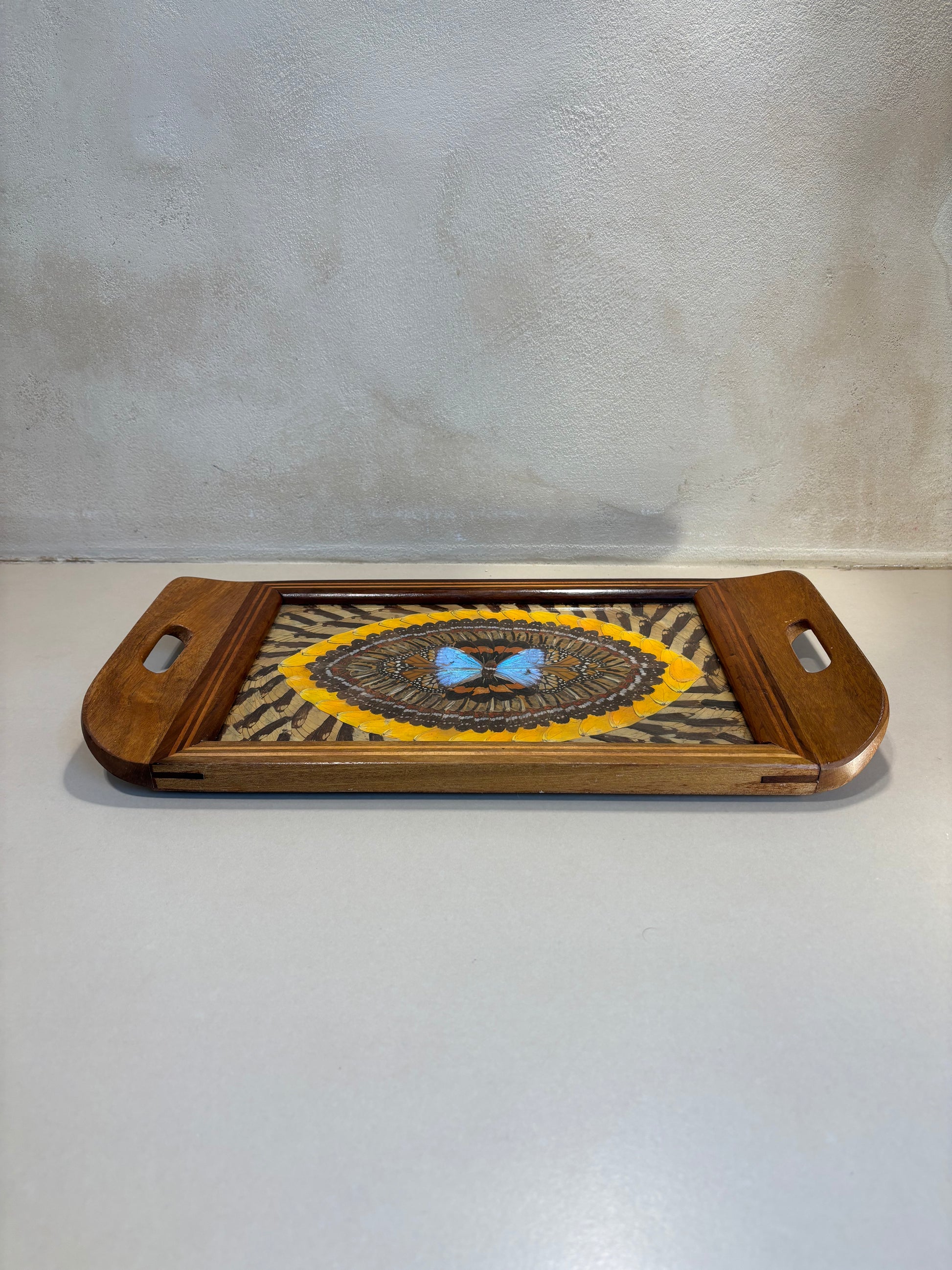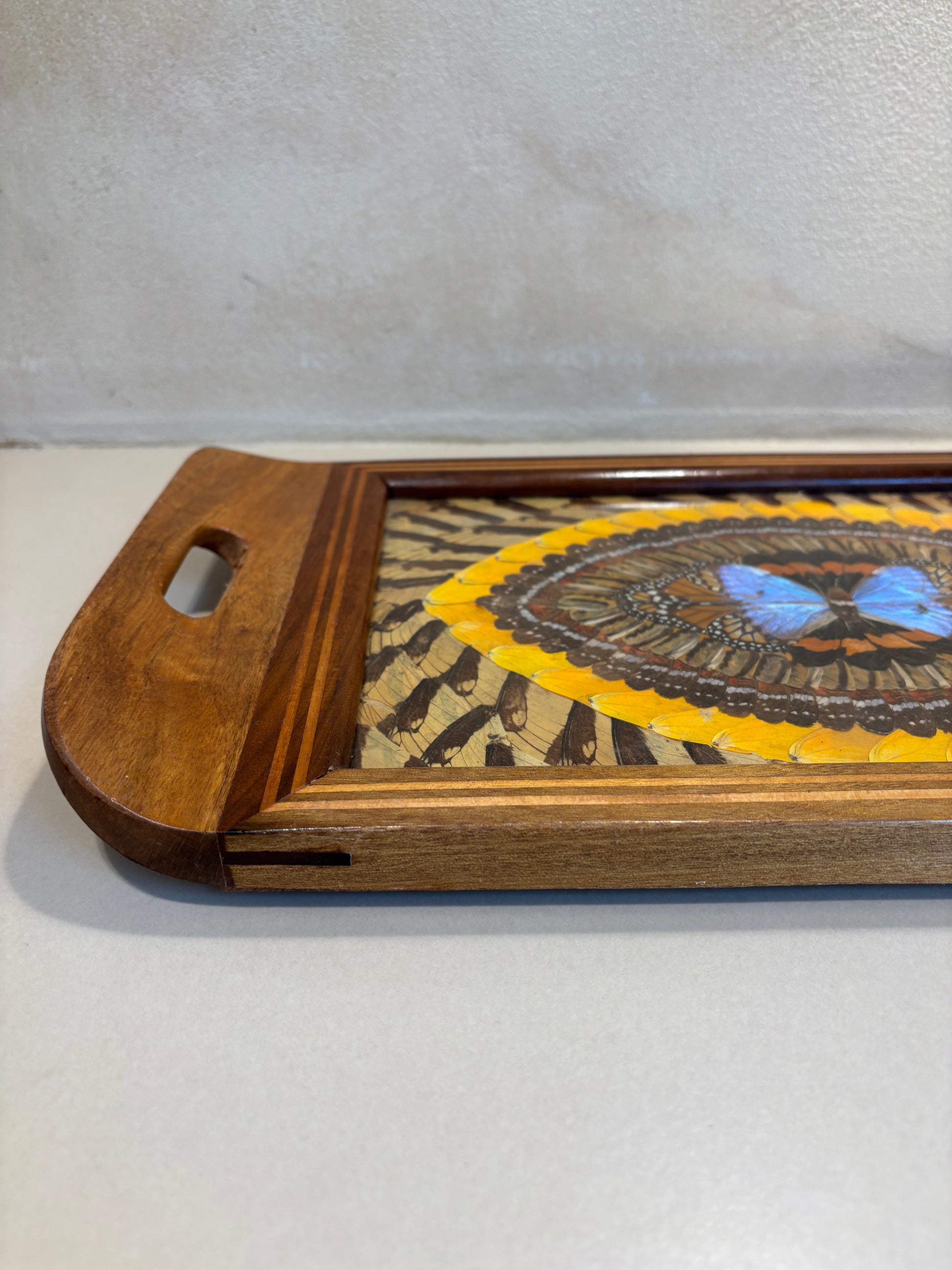 Bandeja vintage de madera de roble y cristal con alas de mariposas formando un dibujo geométrico. Hecha en Brasil.