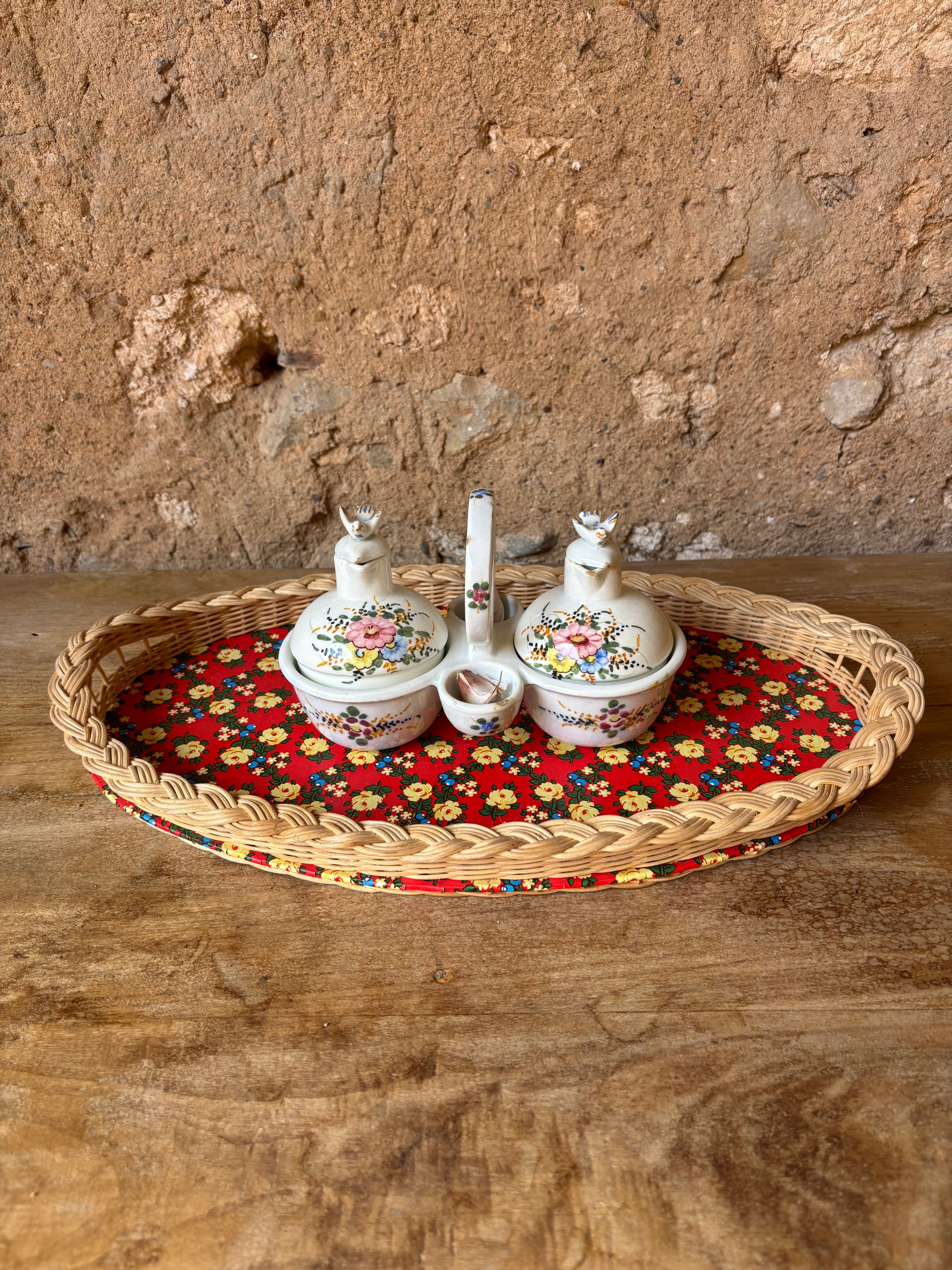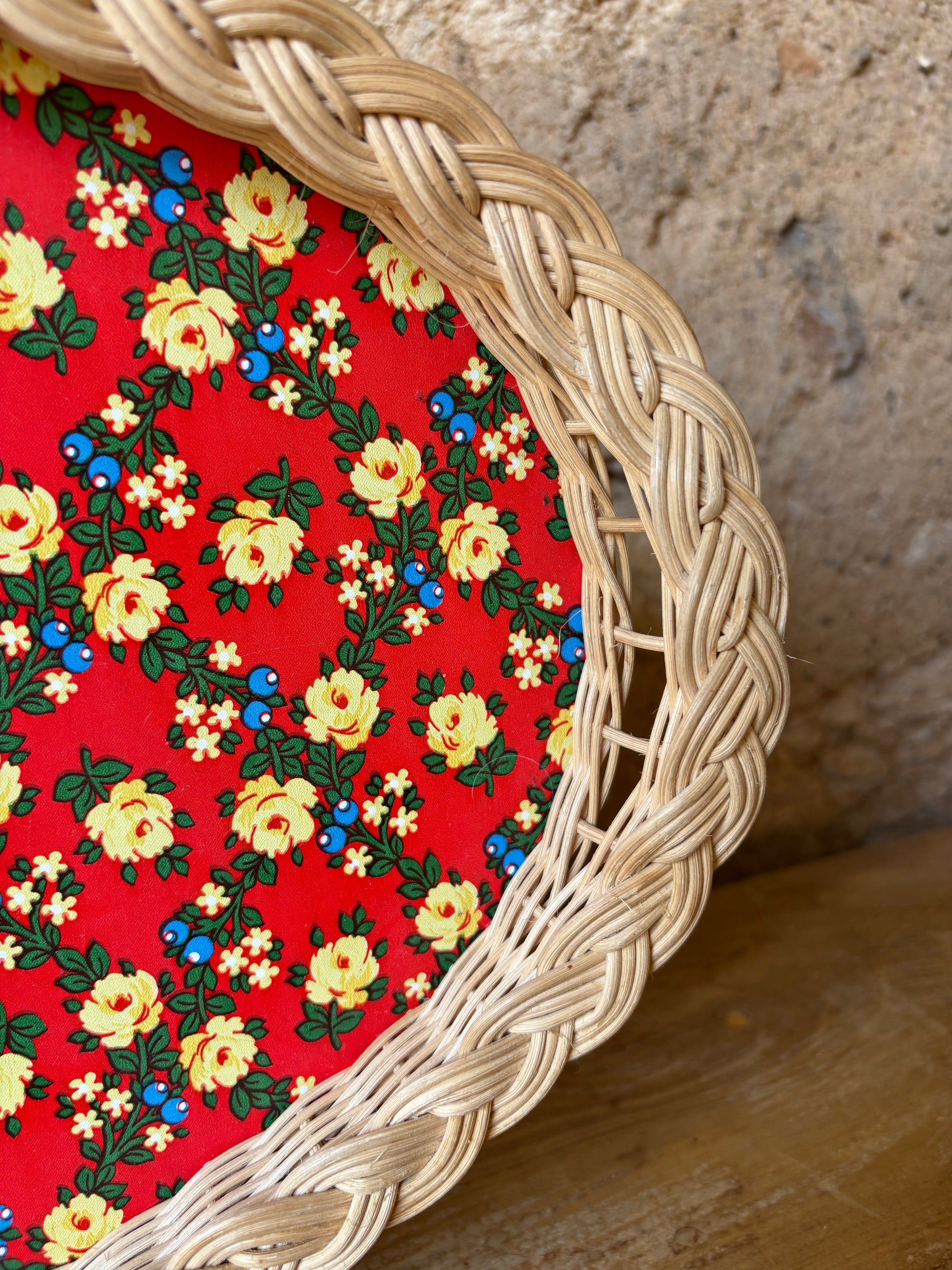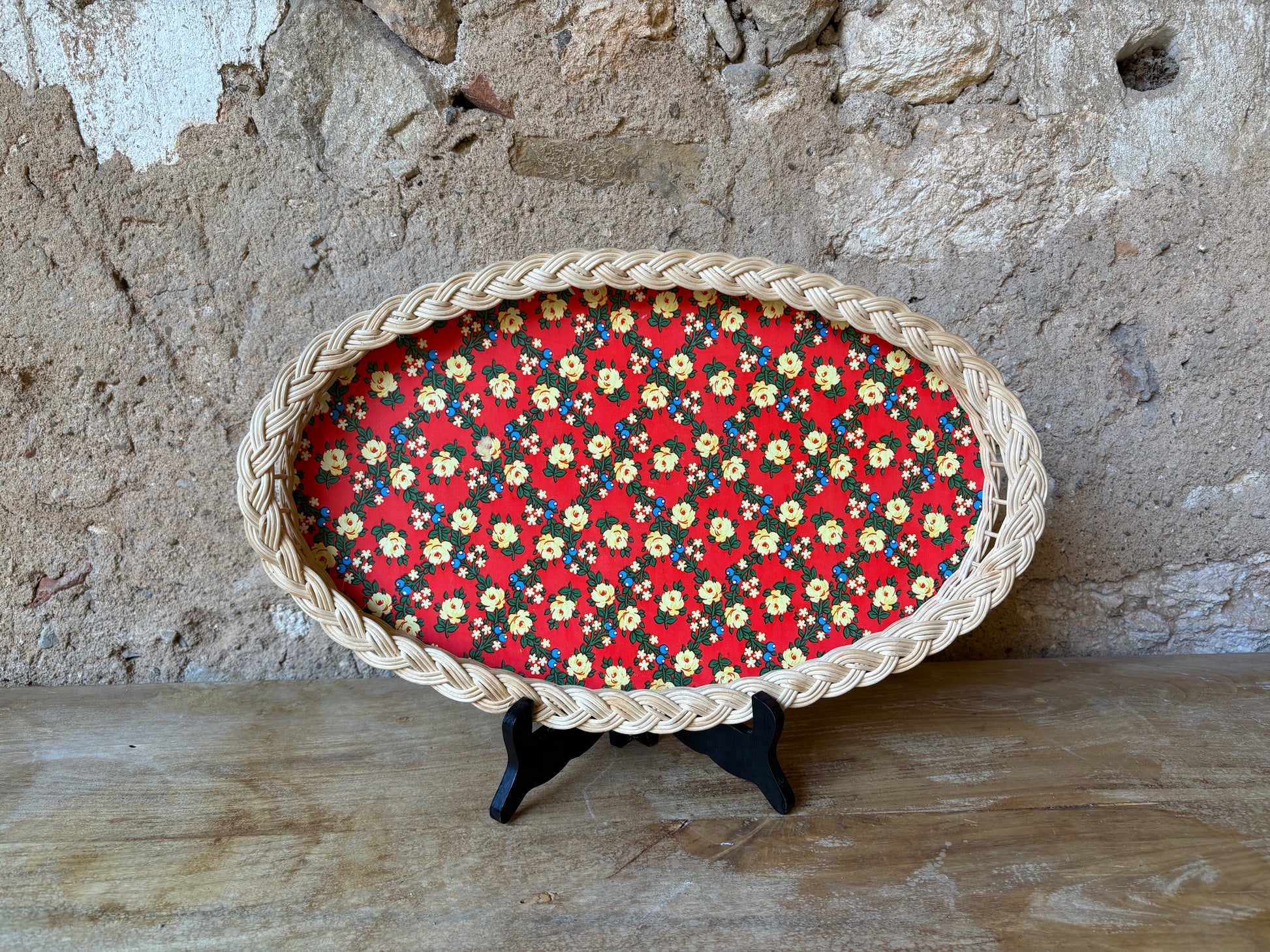 Bandeja ovalada de mimbre trenzado con la base estampada de flores liberty en tonos rojos.