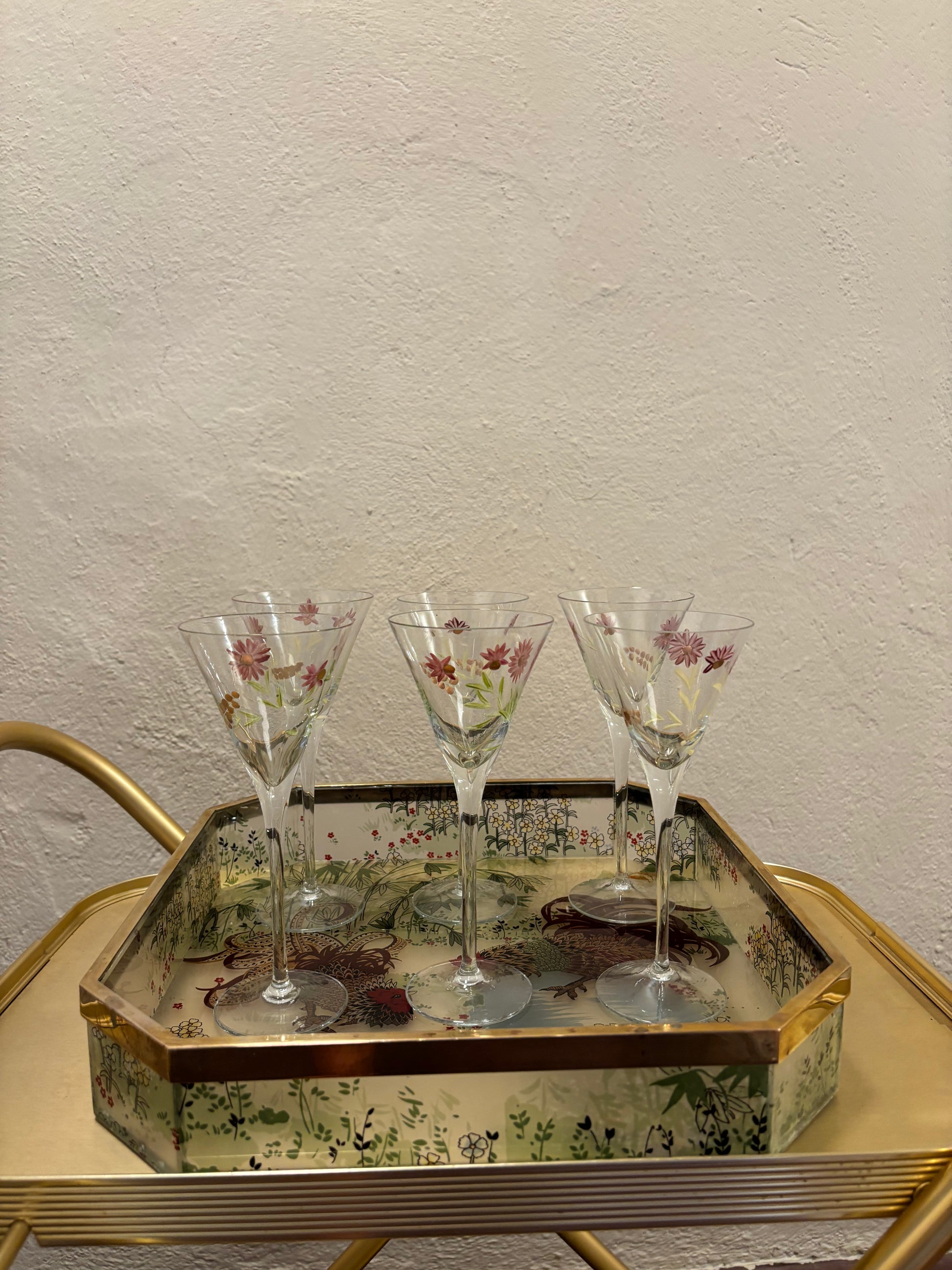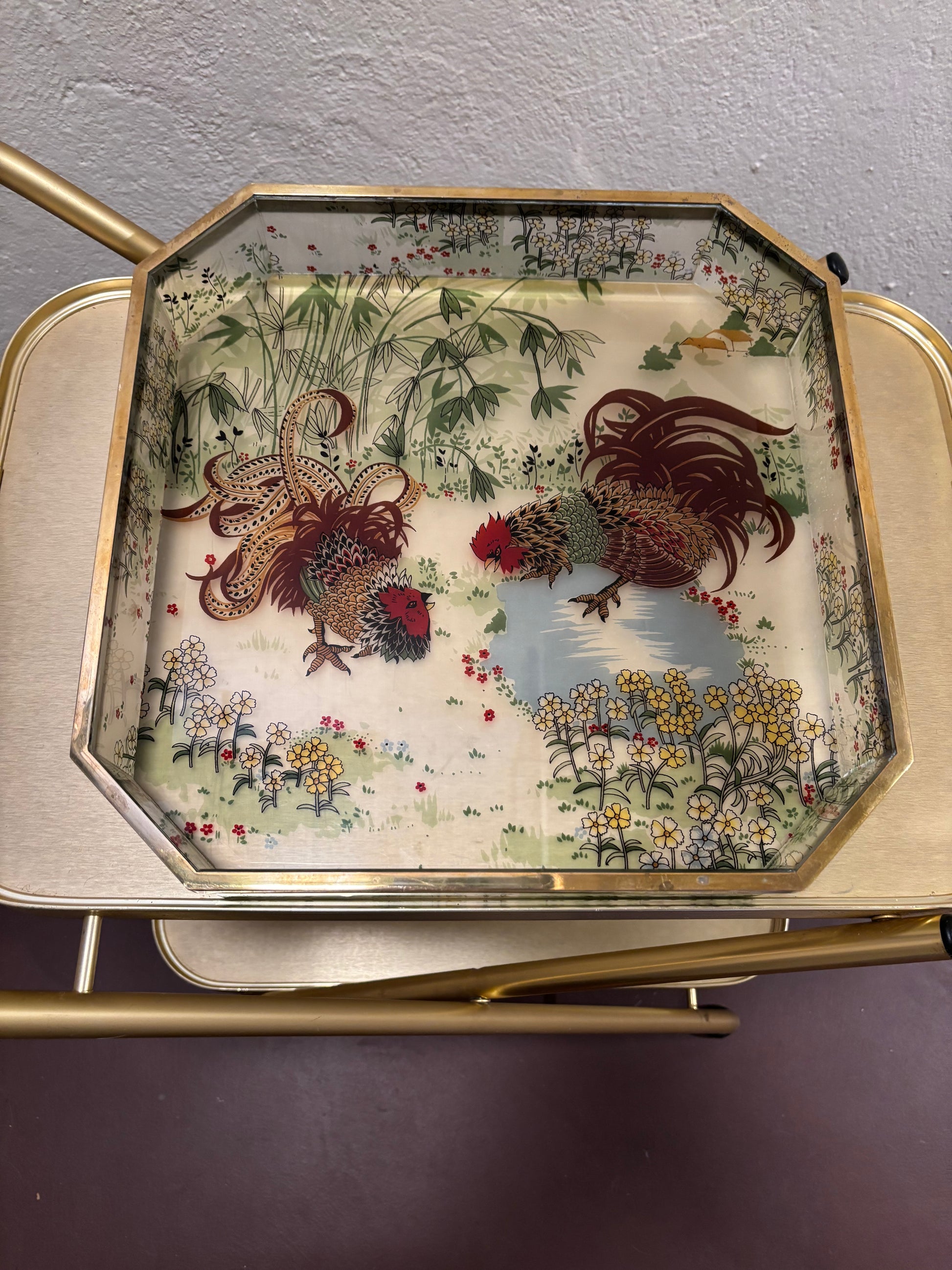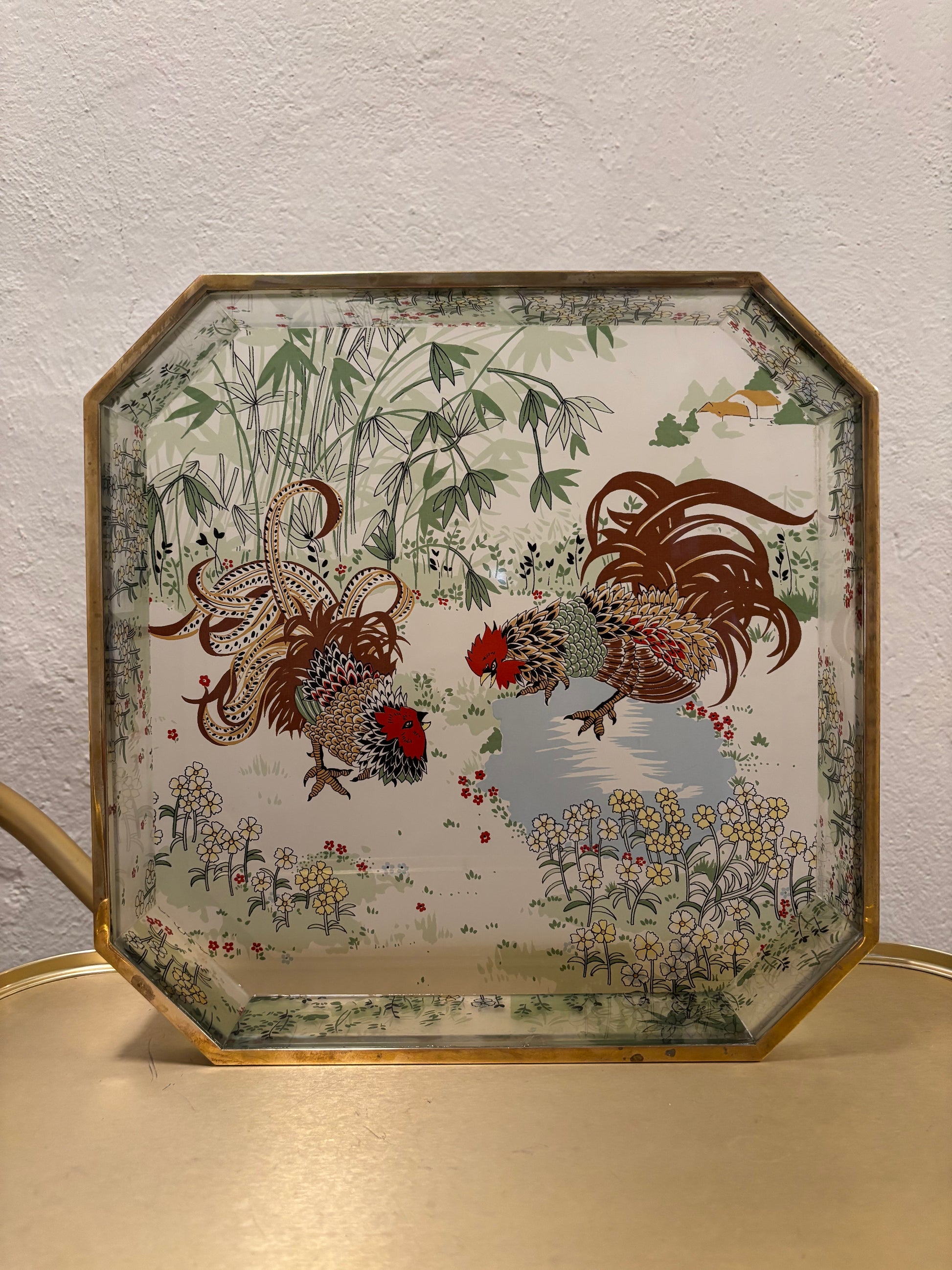 Bandeja cuadrada de servicio, realizada en metacrilato transparente de gran resistencia y decorada con un delicado vinilo estampado de una pareja de gallos en el centro, que aporta un aire distintivo. Su borde está cuidadosamente ribeteado en latón.