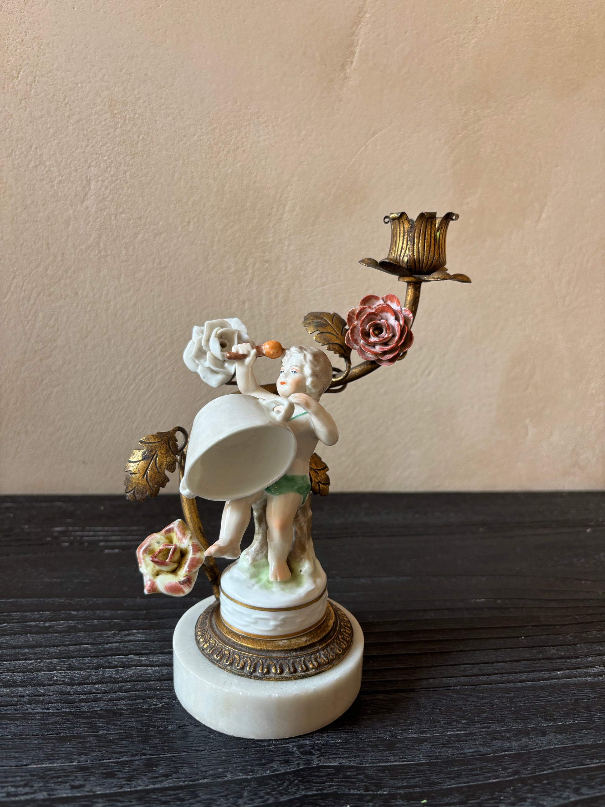 El cuerpo central esta realizado en porcelana finamente decorada con motivos florales y figura de un niño, acompañado de aplicaciones en bronce trabajado artesanalmente. La base redonda es de mármol de Carrara.