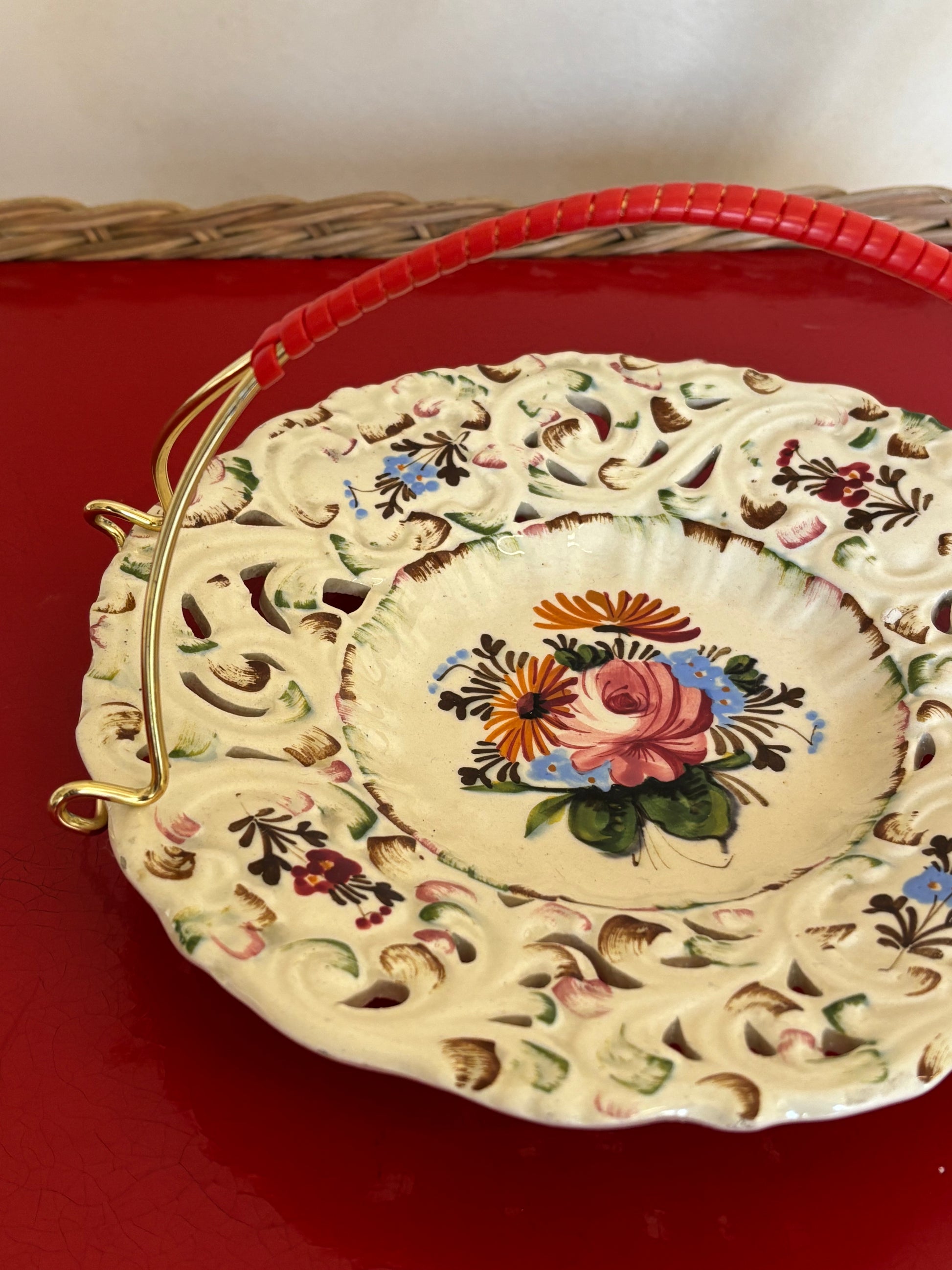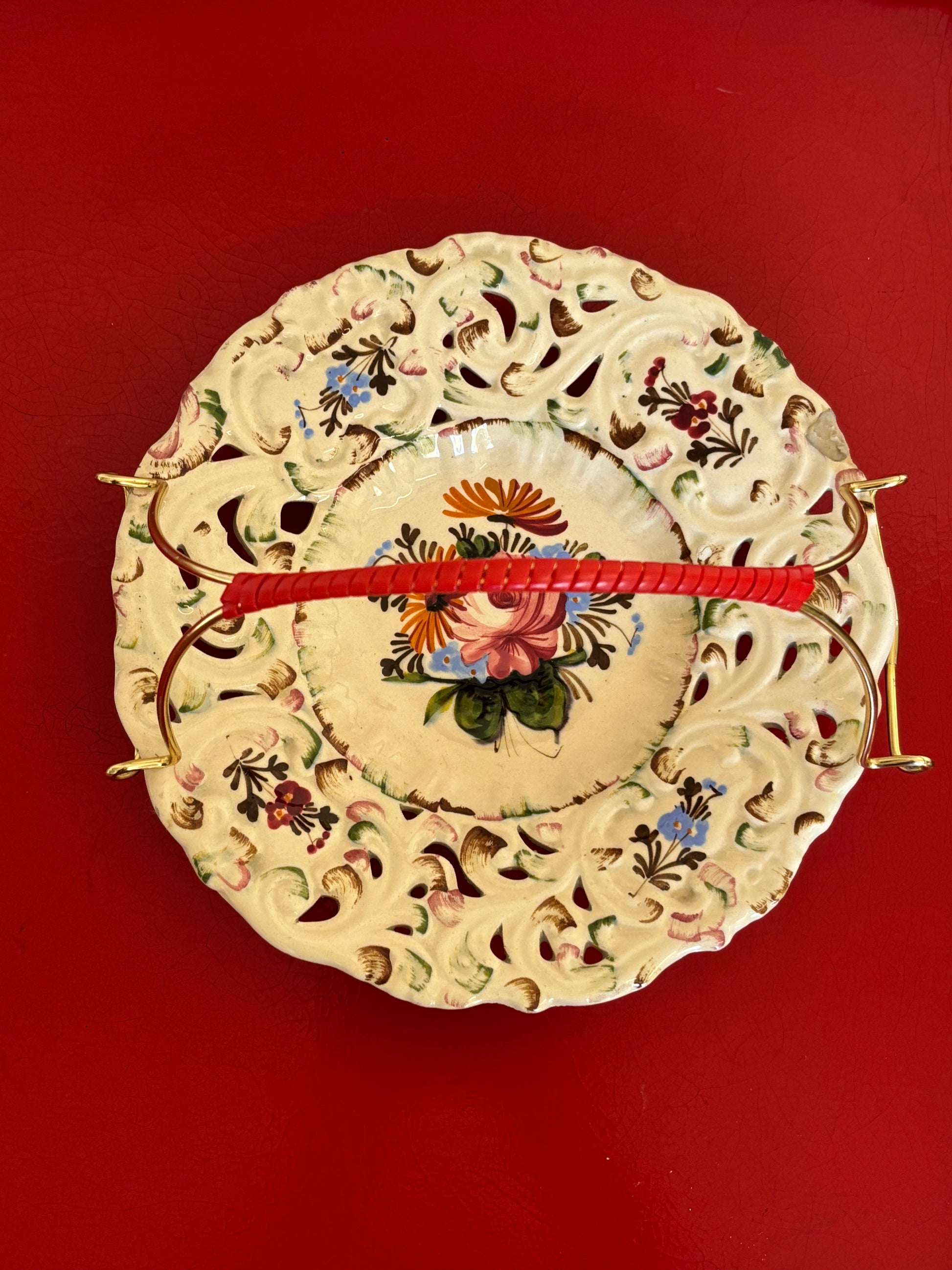 Plato vintage de mayólica floral pintado a mano, con el reborde perforado fabricado en Italia.