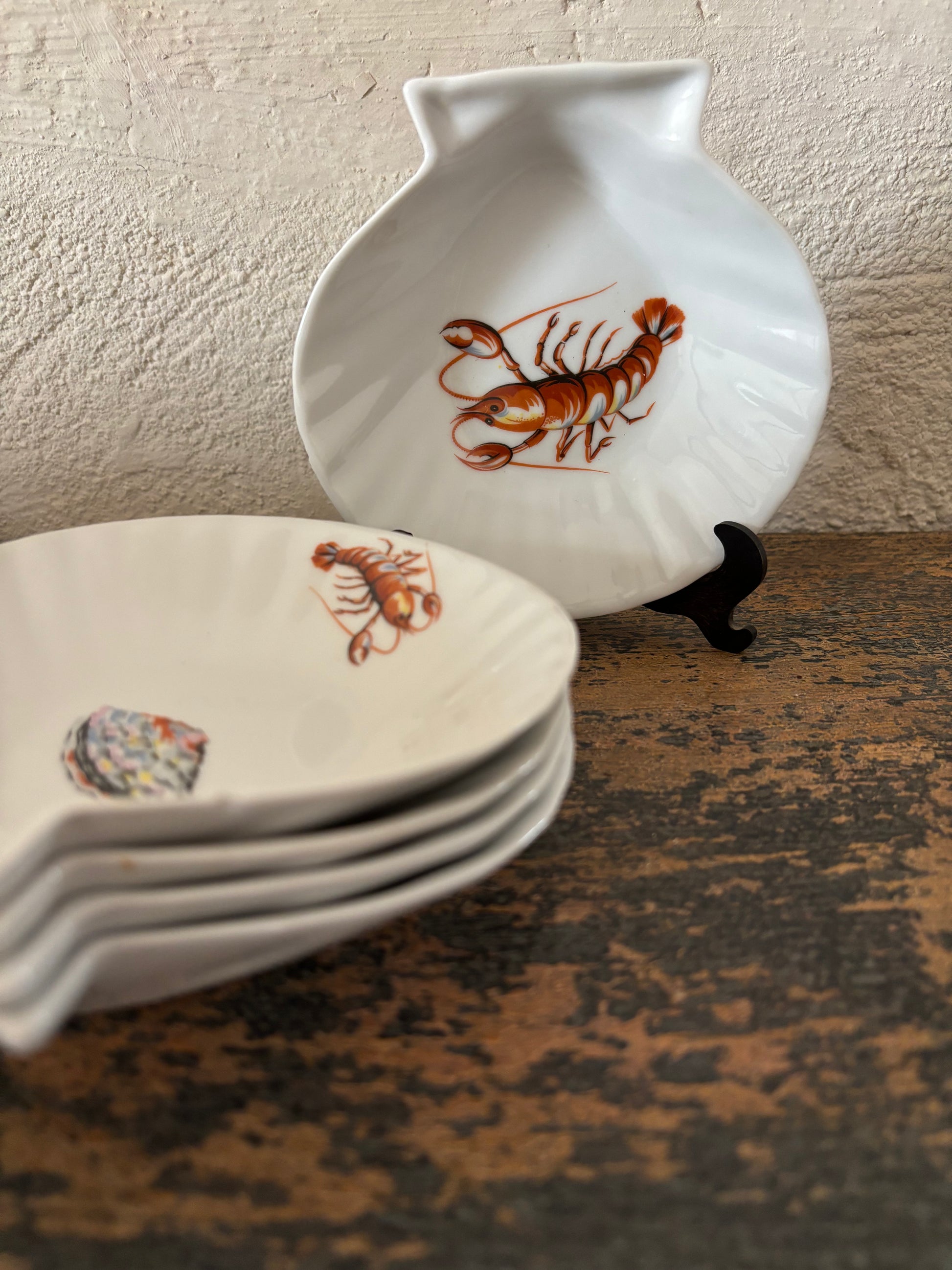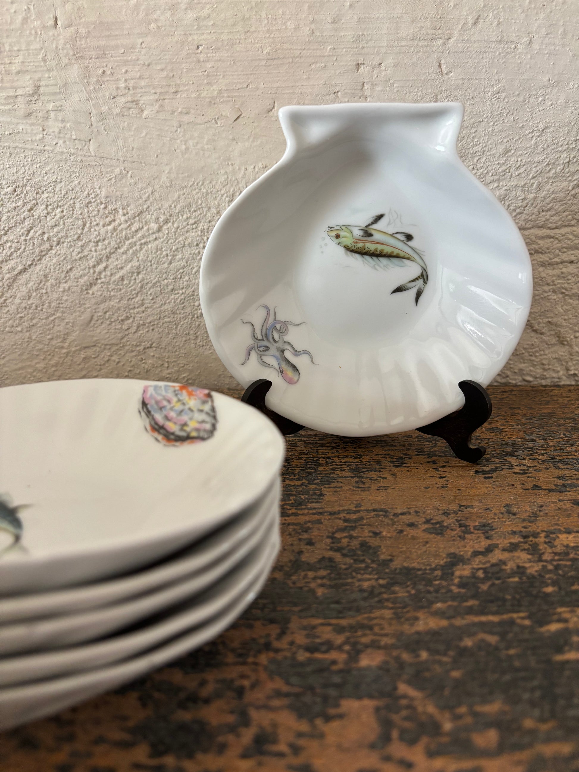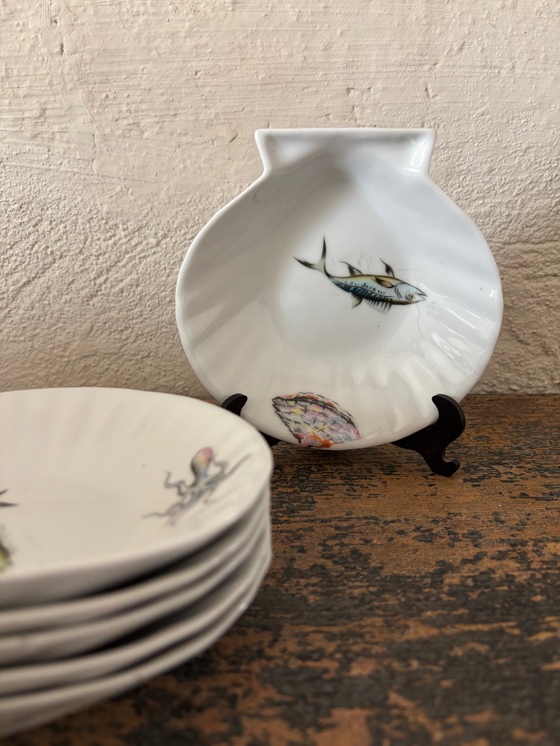 Juego de 6 rabaneras de la firma Española Isard. Cada pieza presenta un diseño único con diferentes motivos de crustáceos. Están fabricadas en porcelana de alta calidad y son aptas para horno.