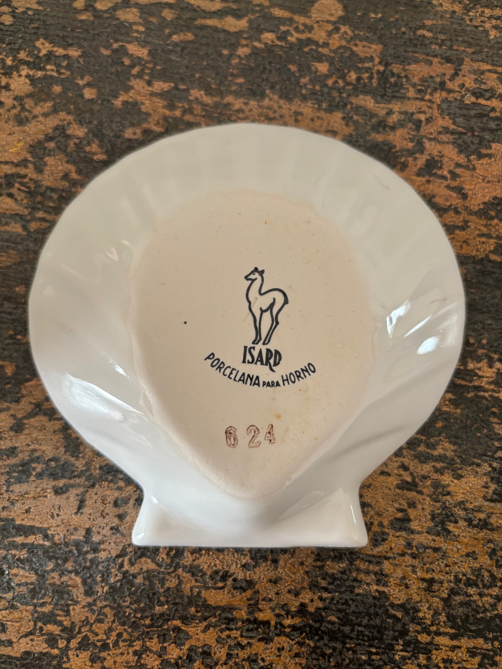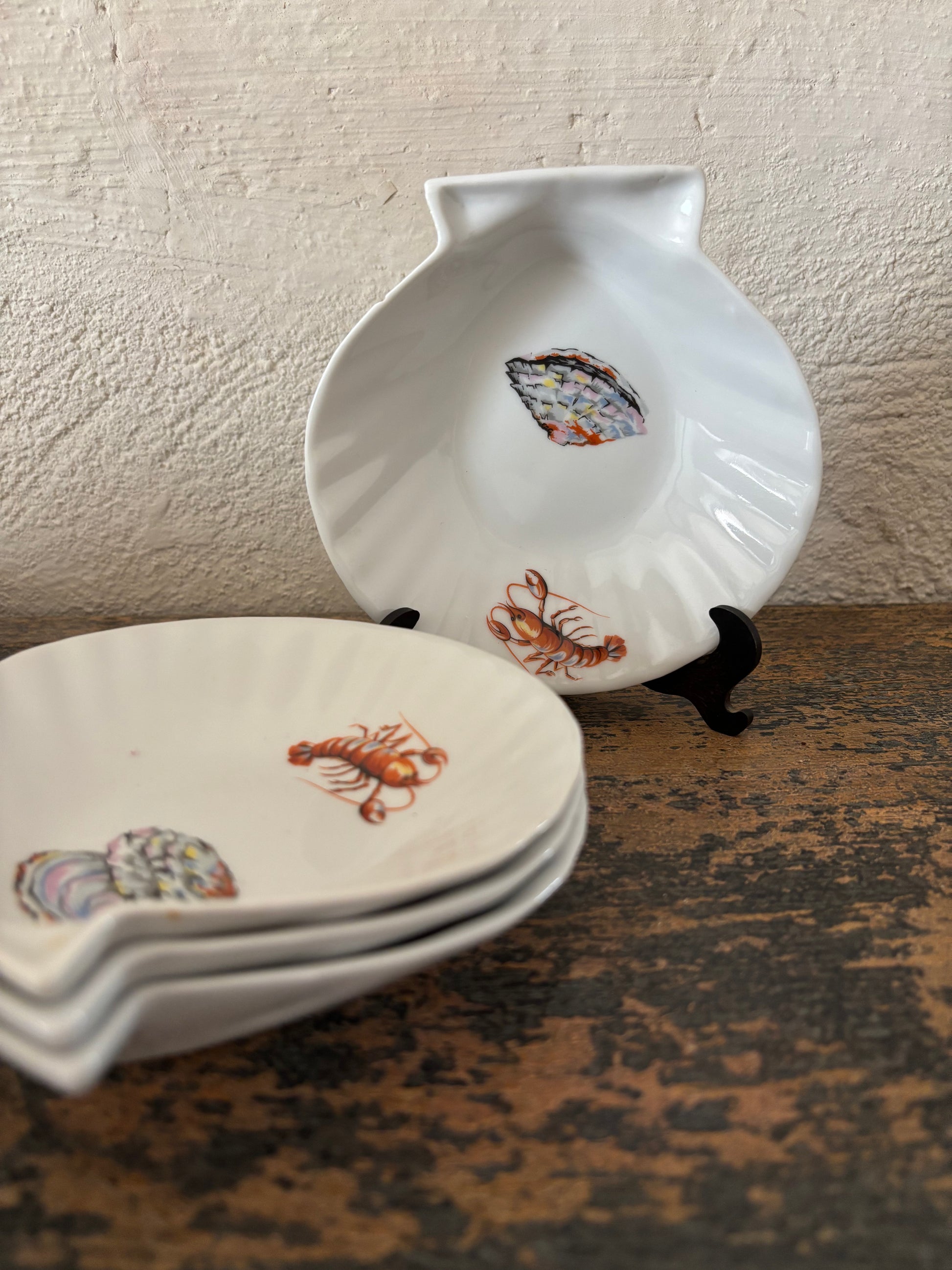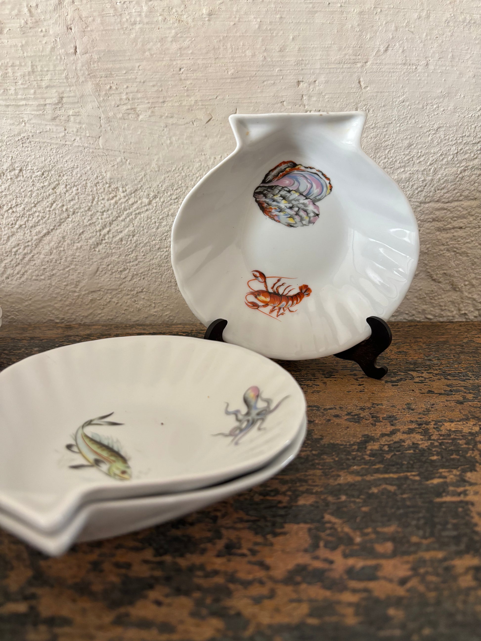 Juego de 6 rabaneras de la firma Española Isard. Cada pieza presenta un diseño único con diferentes motivos de crustáceos. Están fabricadas en porcelana de alta calidad y son aptas para horno.