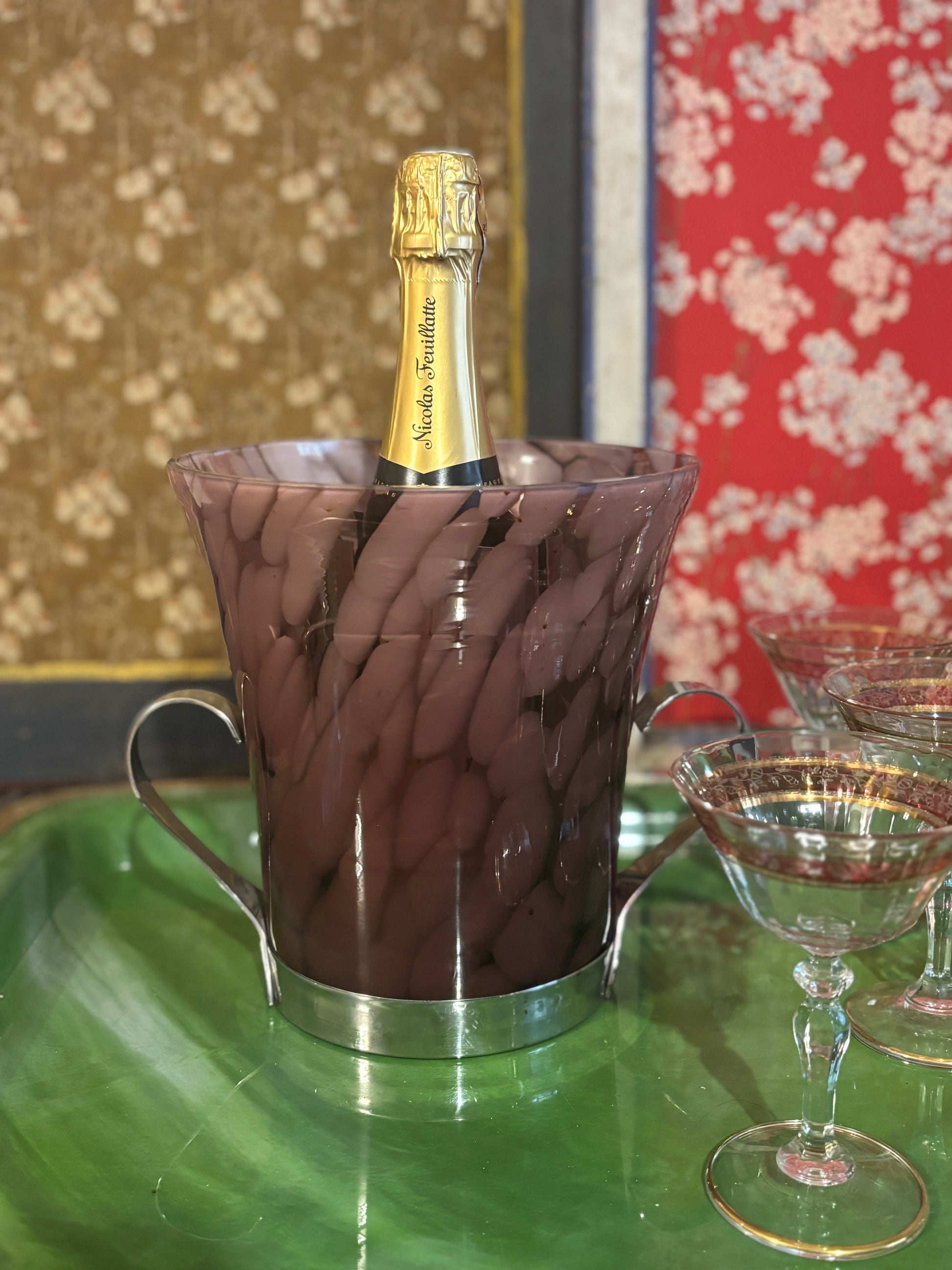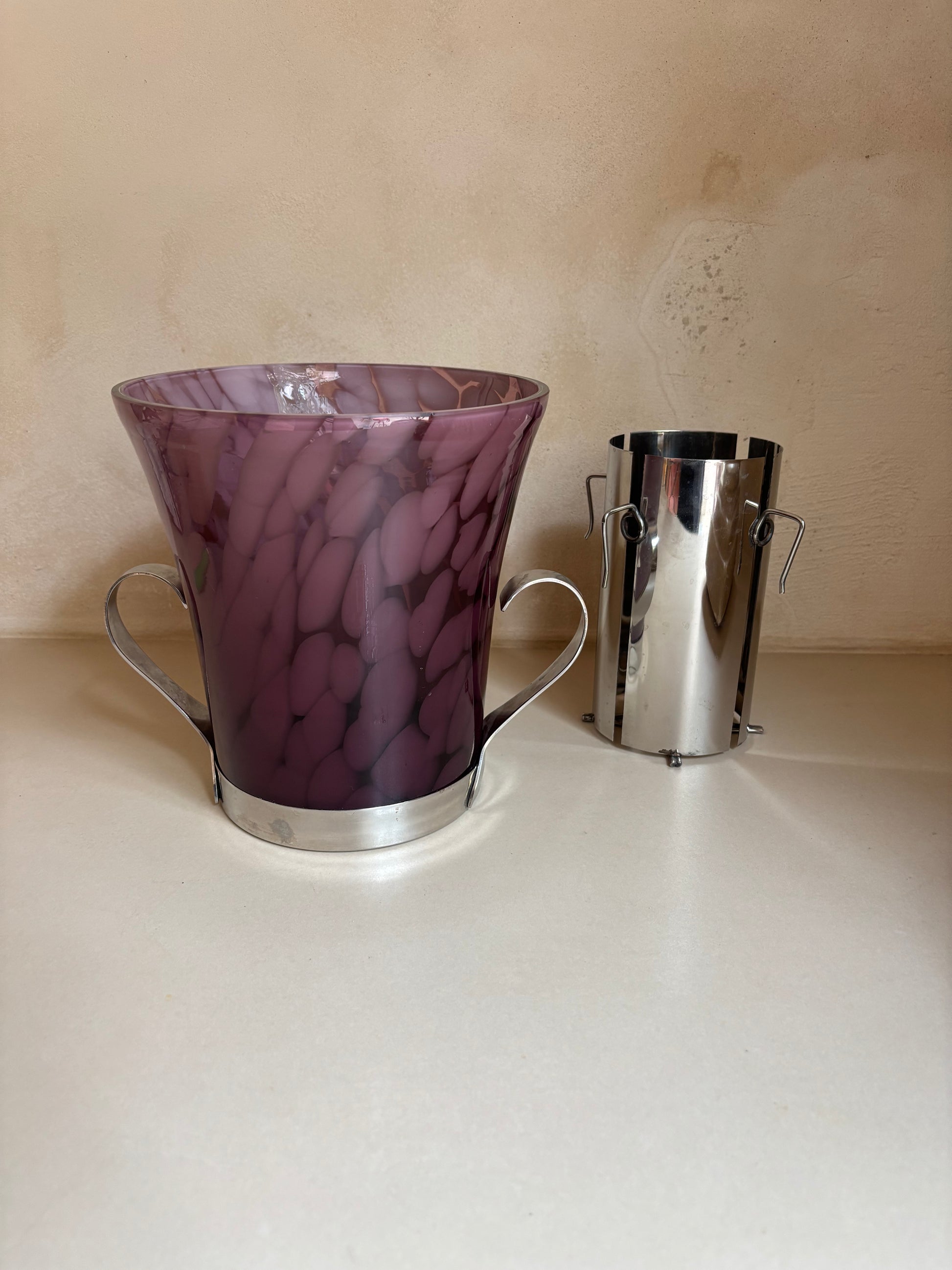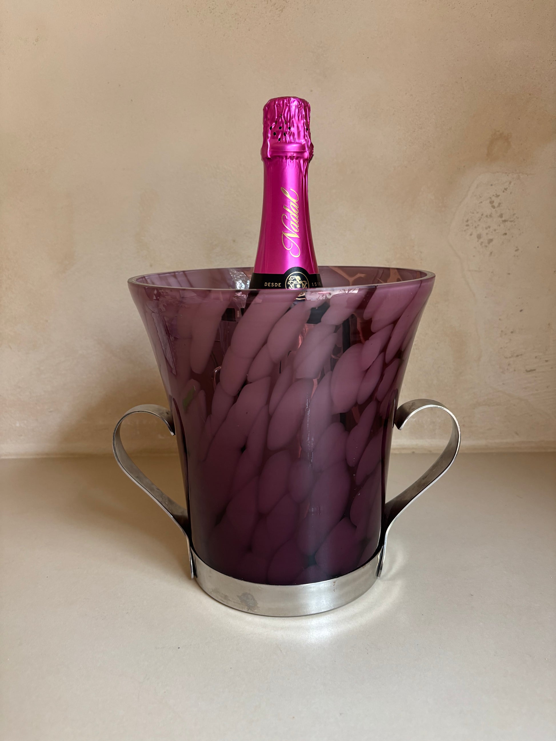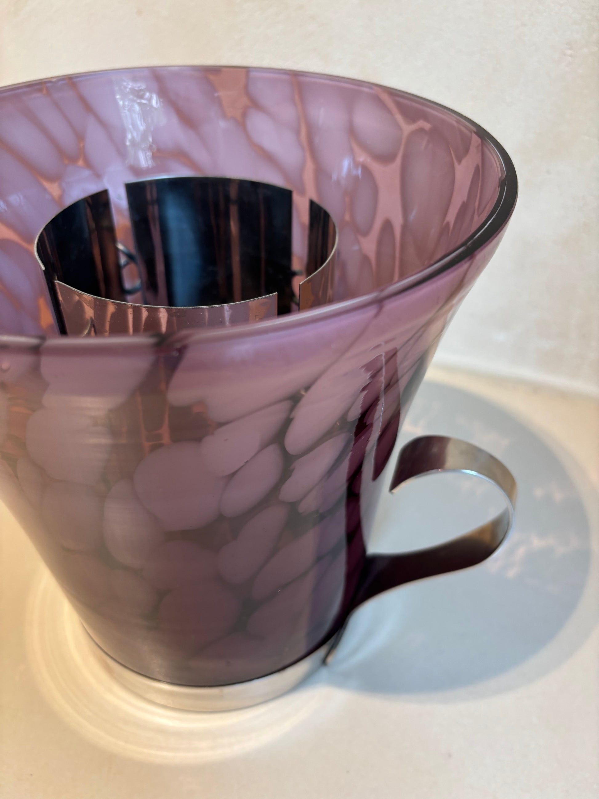 Cubitera exclusiva elaborada en cristal de Murano en unos elegantes tonos morados, con la base de metal plateado.