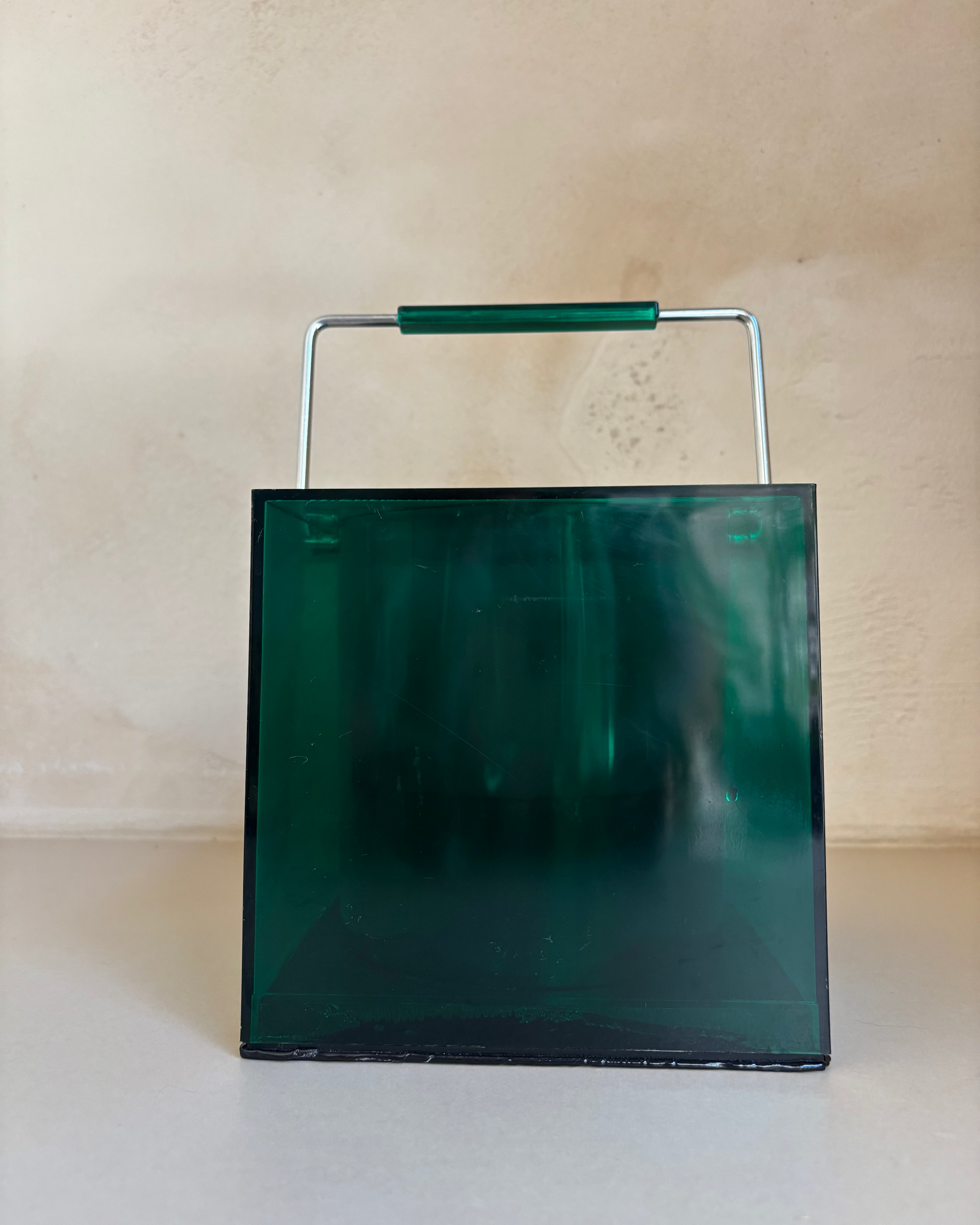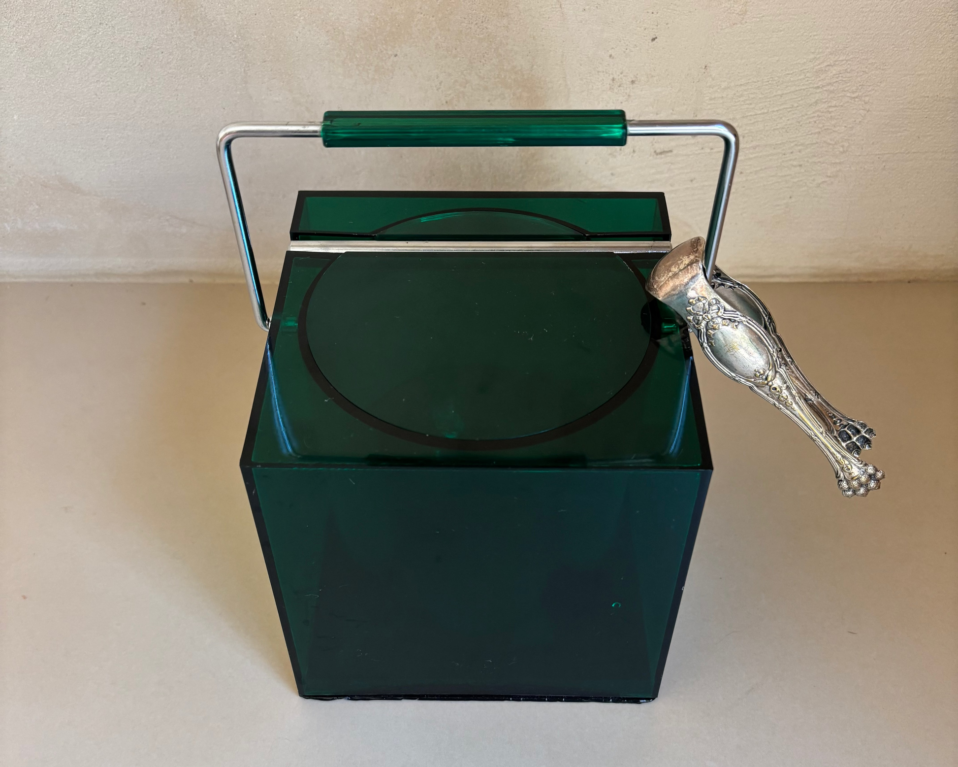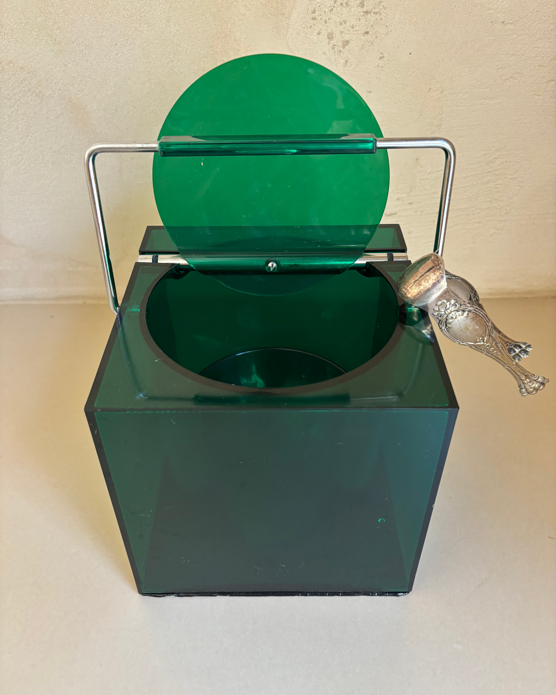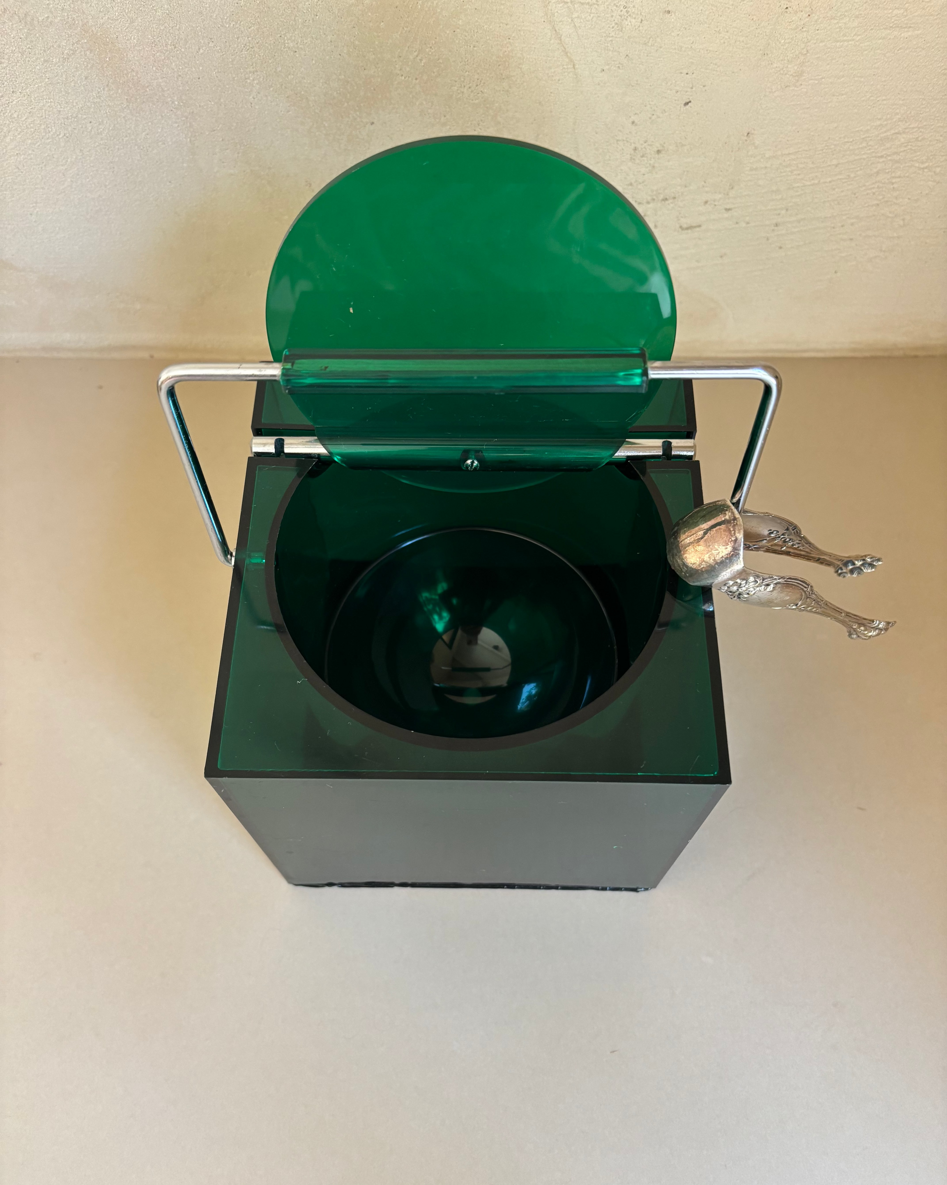 Excepcional cubitera de diseño cúbico, fabricado en metacrilato en tono verde esmeralda, estética retro, influencia por el movimiento Space Age, de mediados del siglo XX.