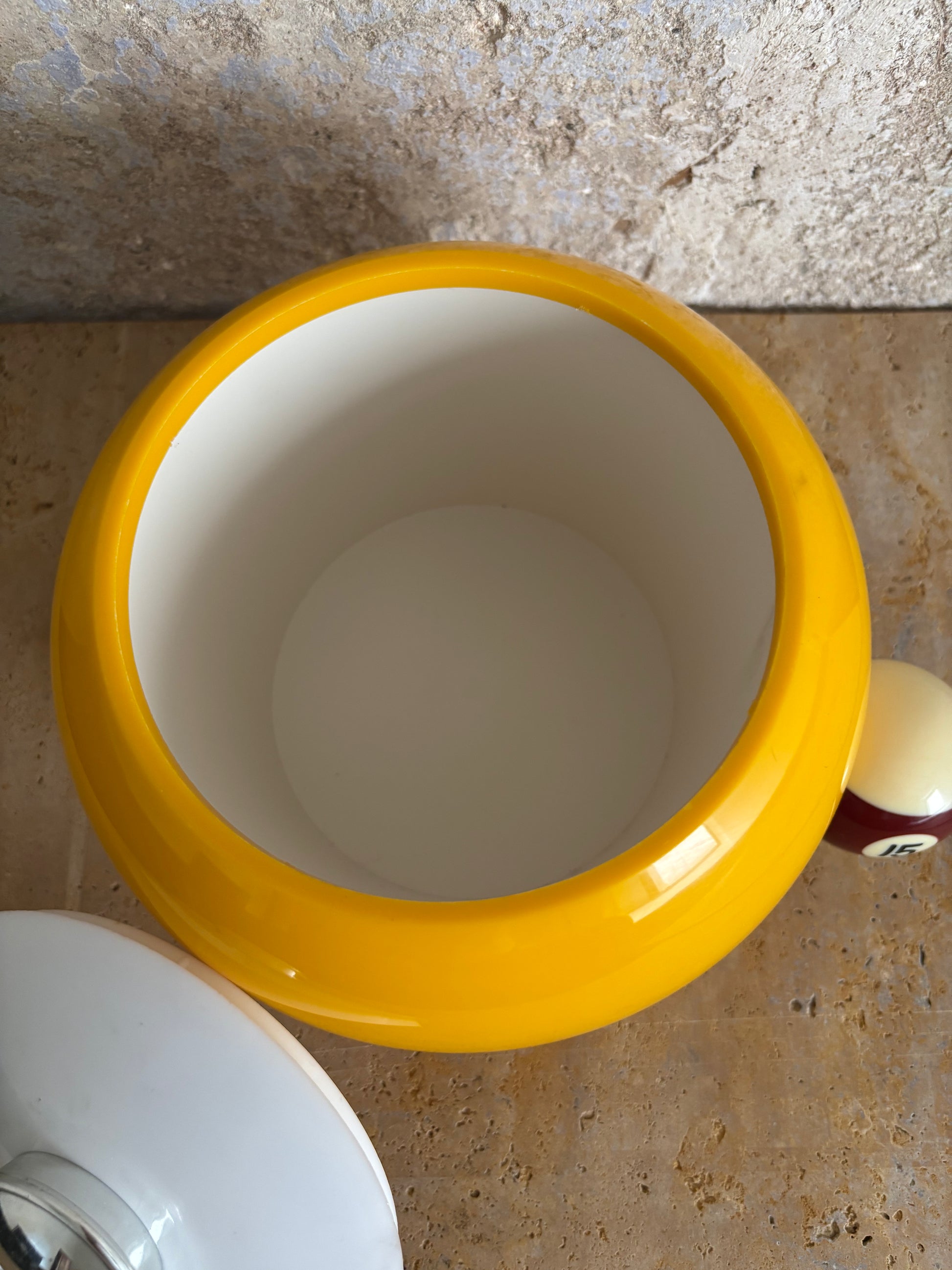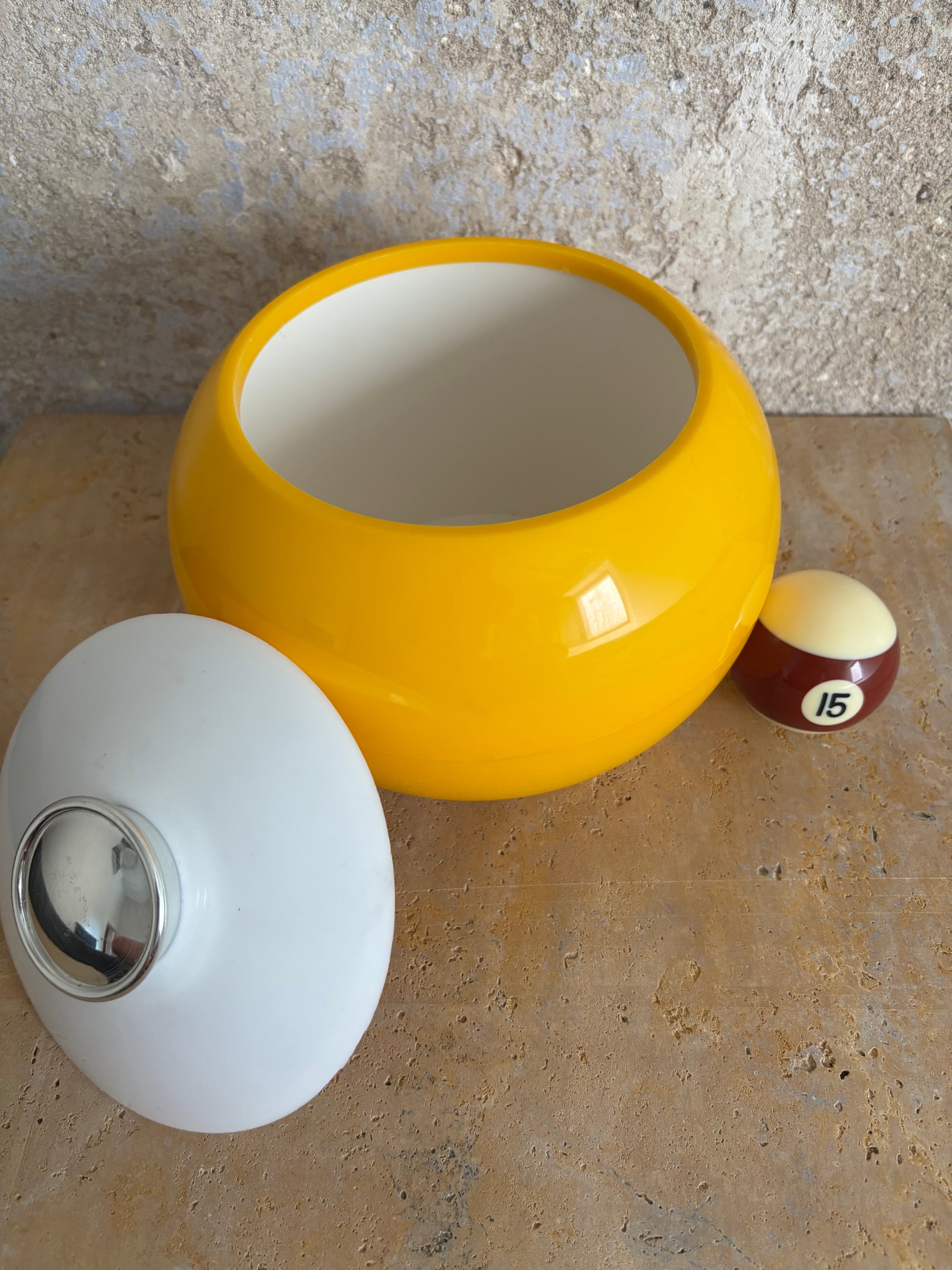 Cubitera en forma de bola de billar, es un excelente exponente del estilo Space Age y la. corriente Pop Art que impregnó el diseño doméstico de la década. Fabricado en baquelita, la primera sustancia plástica totalmente sintética.
