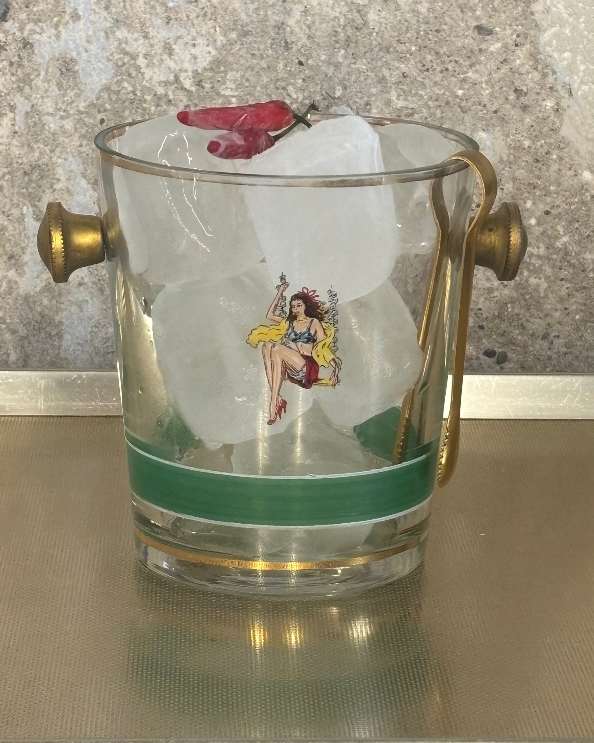 Espectacular cubitera vintage original años 50, fabricada en cristal grueso y transparente, con ilustraciones de Pin-Up, serigrafiado directamente sobre el vidrio. Las asas son de latón dorado.
