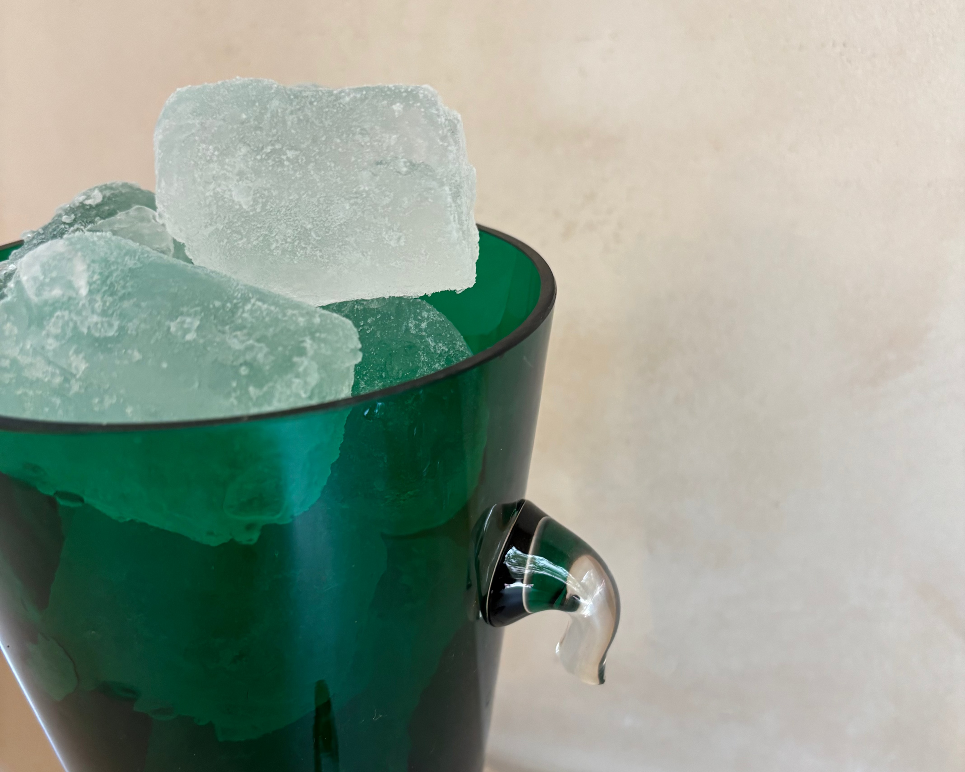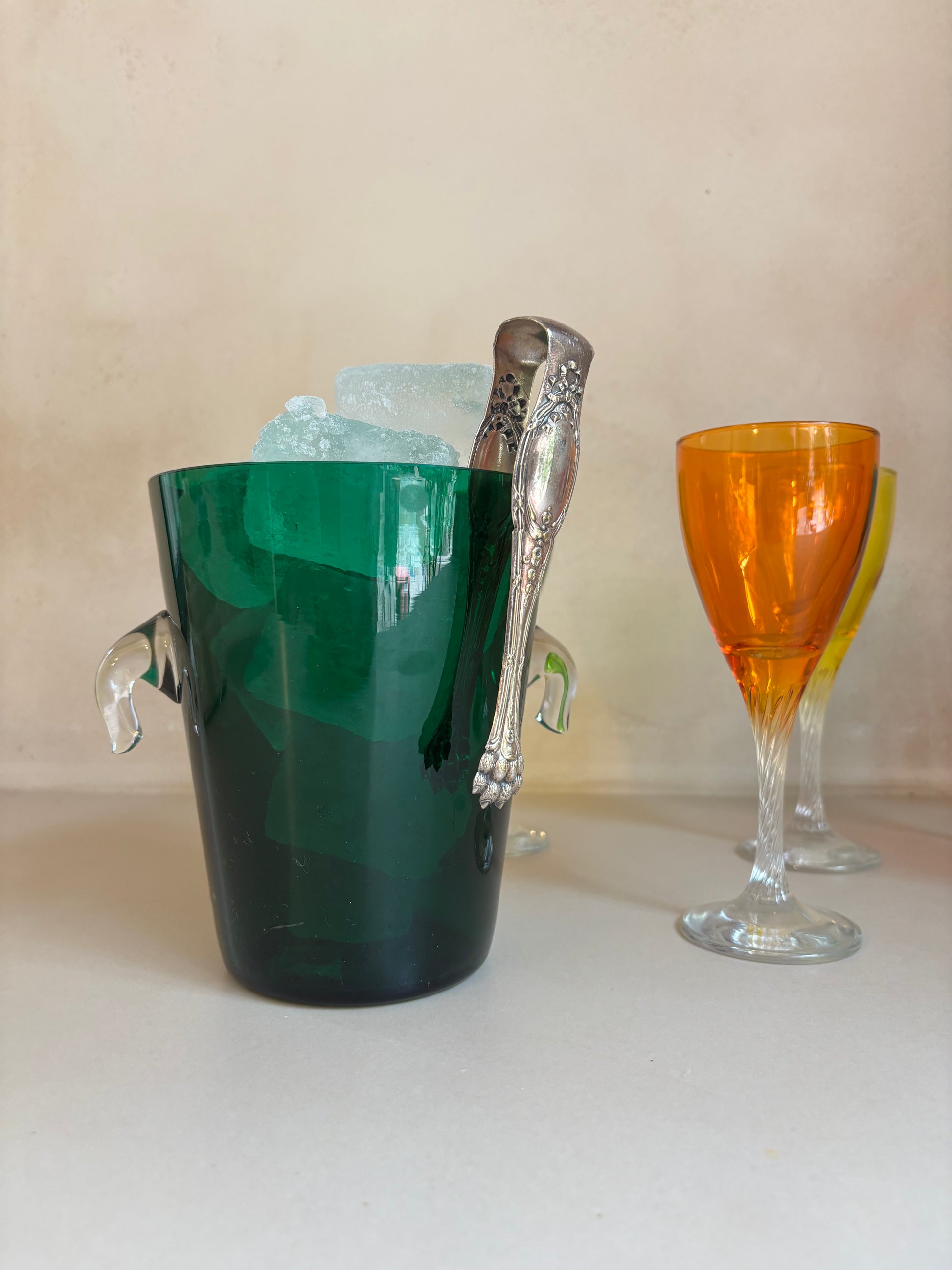 Cubitera vintage en vidrio de color verde intenso con asas transparentes, para servir hielo. 1960s