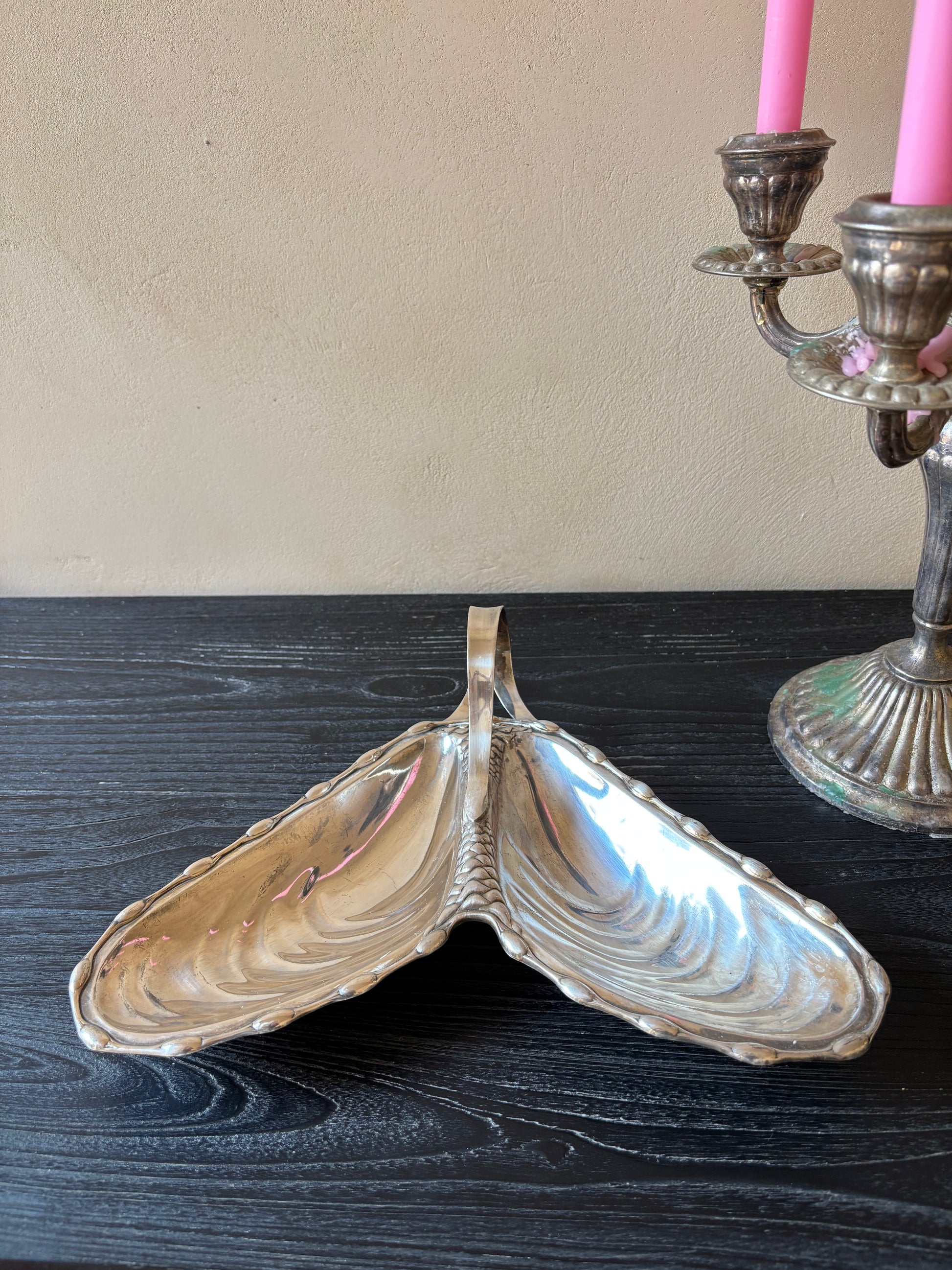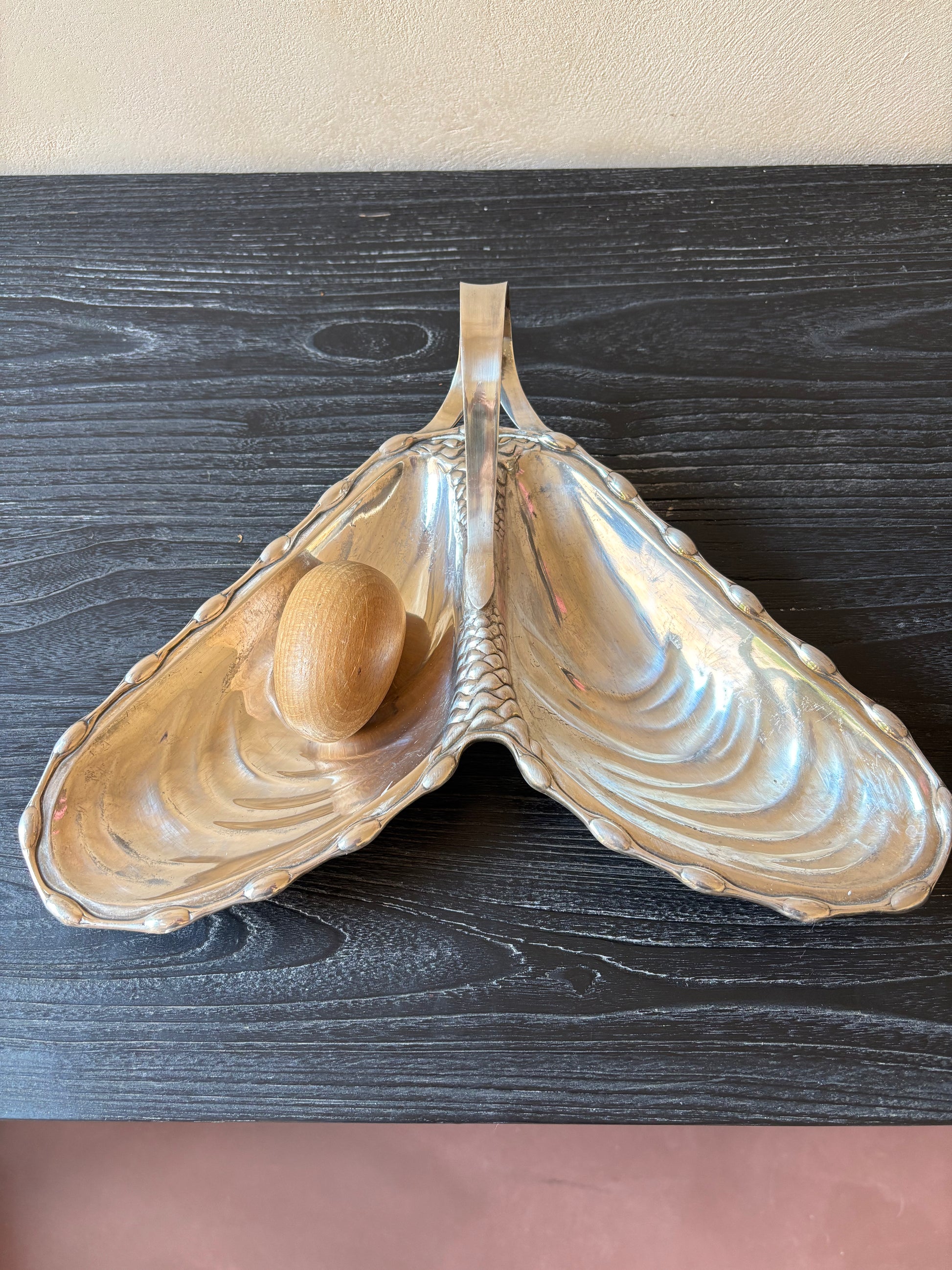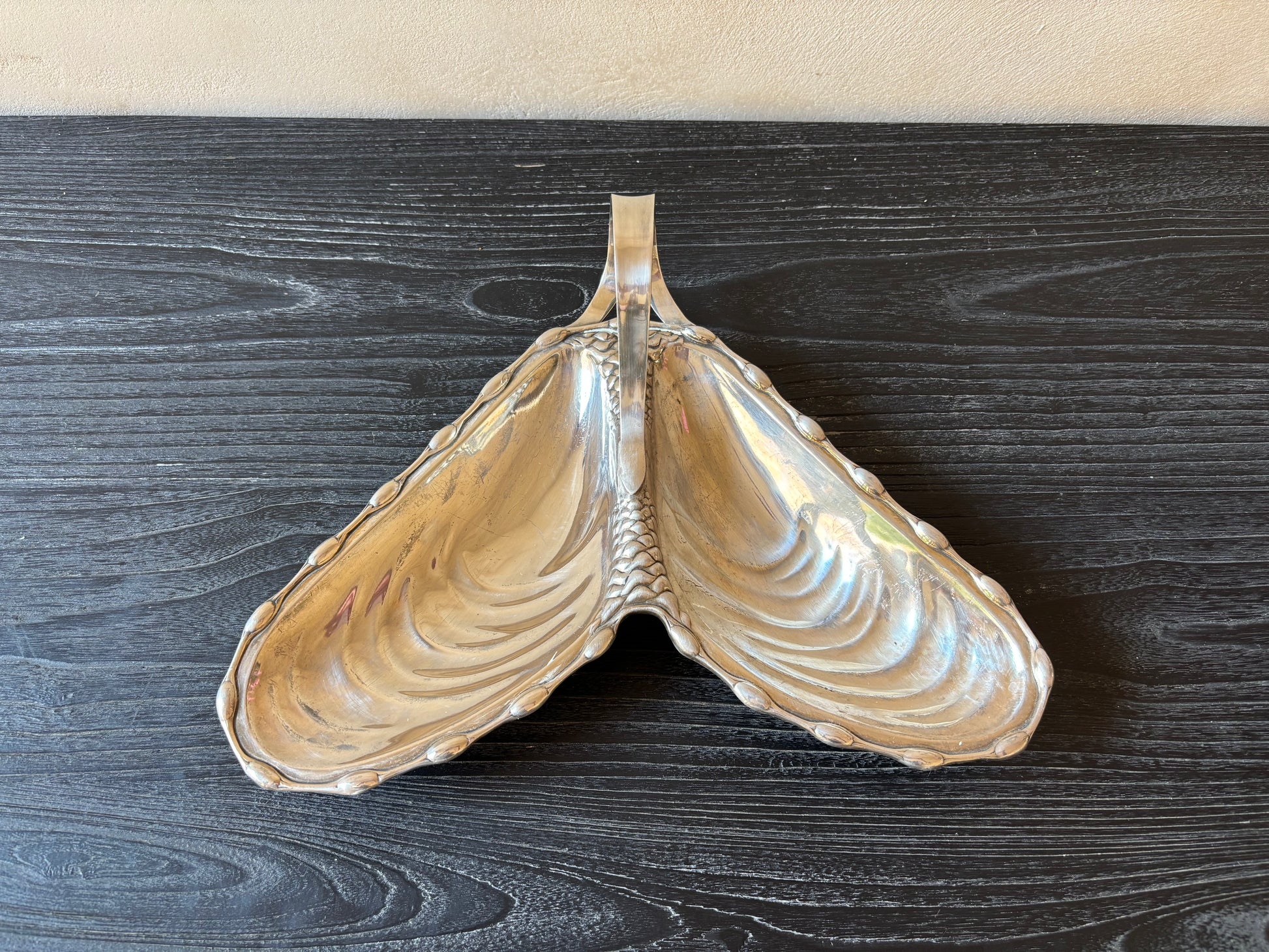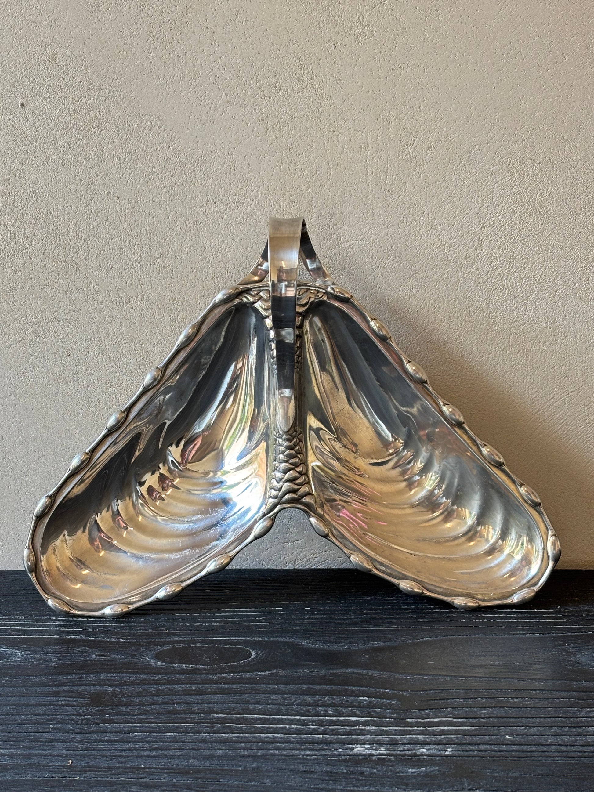 Fuente en forma de pareja de mejillones antigua para servir marisco. En metal con baño de plata.
