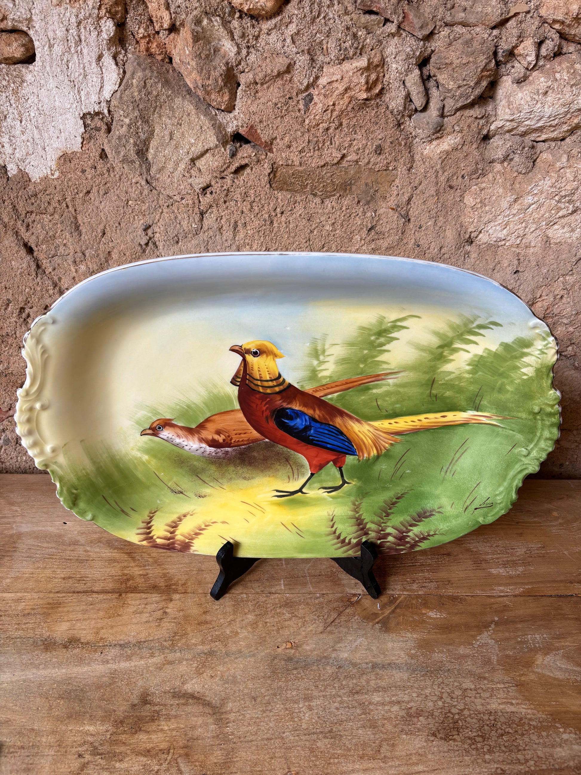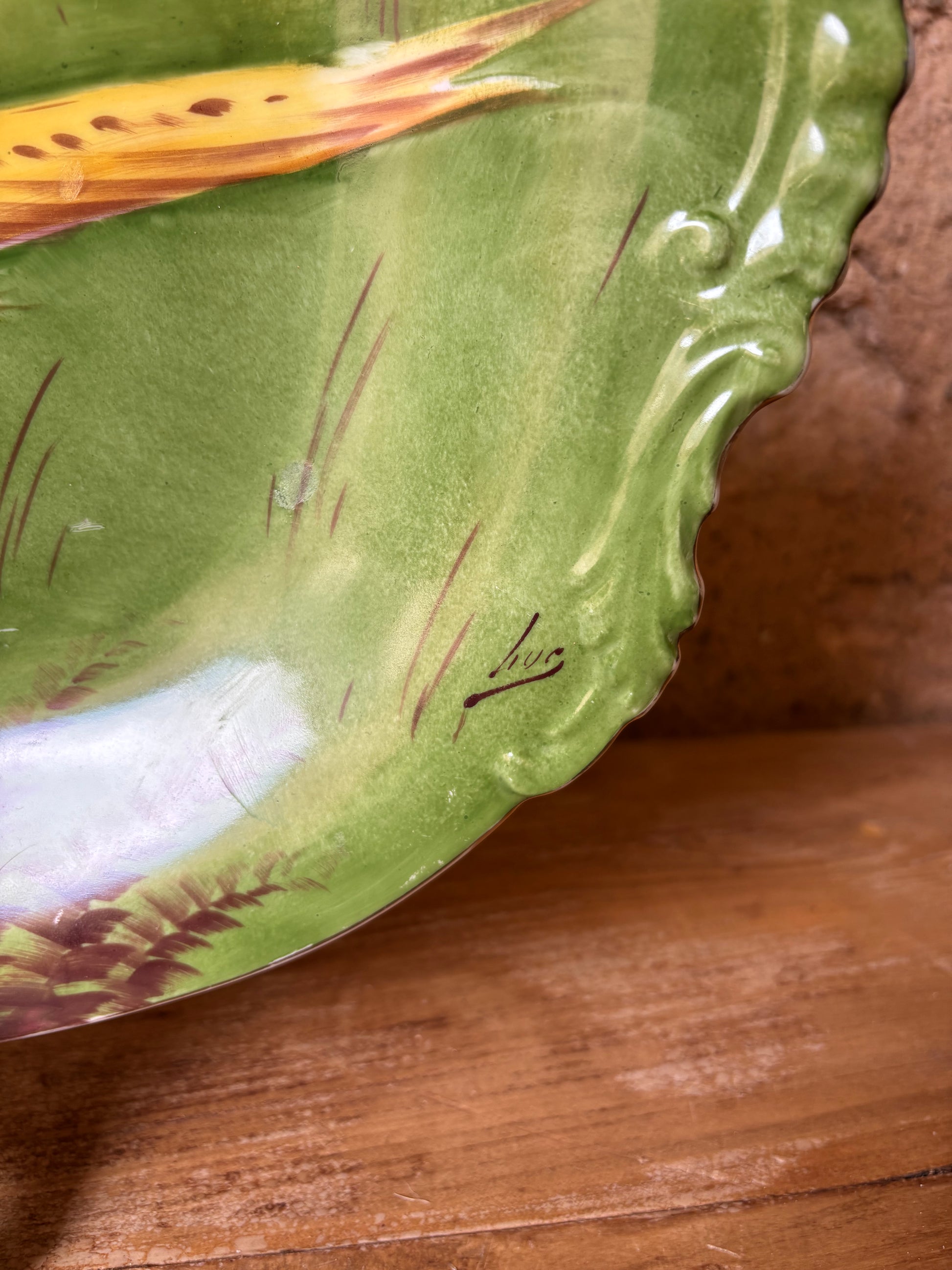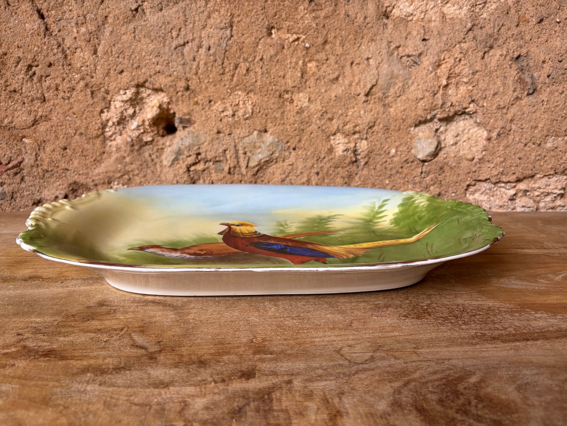 Fuente antigua para servir carne de caza o aves en porcelana de Limoges. Diseñada y pintada a mano por LUC, famoso dibujante de la época.