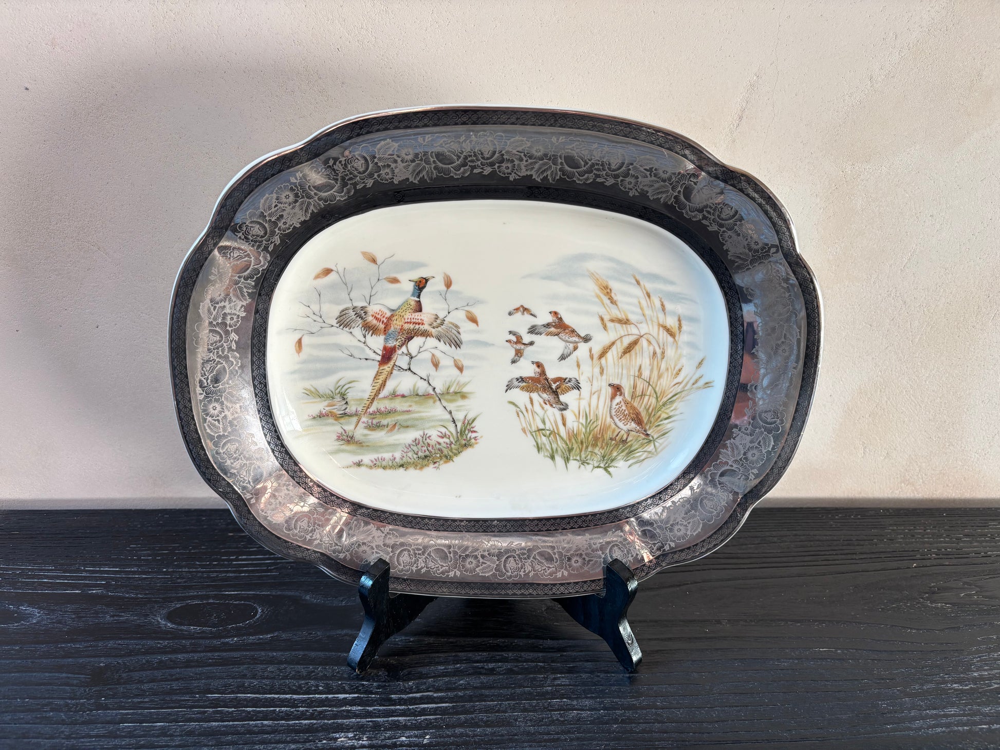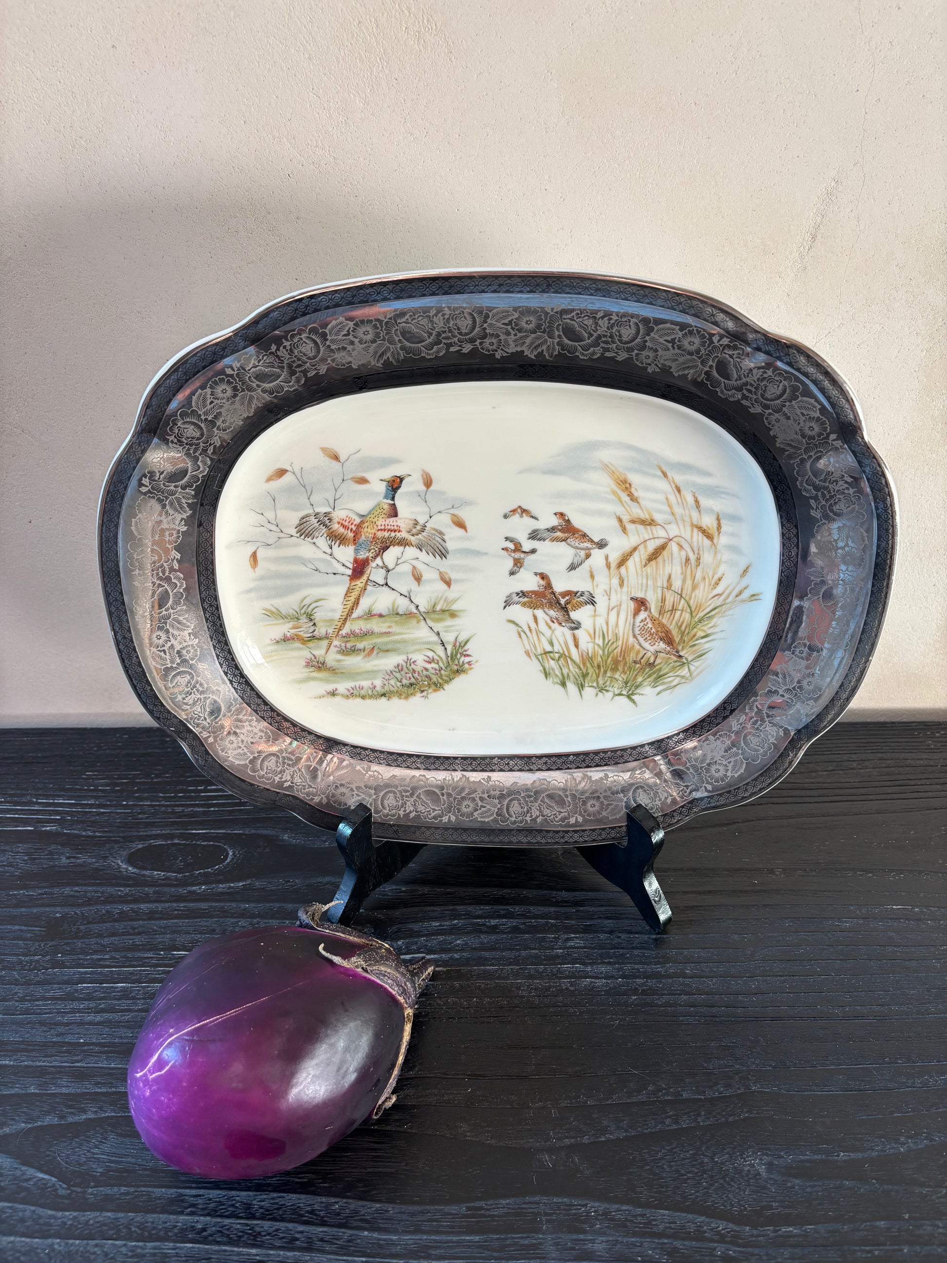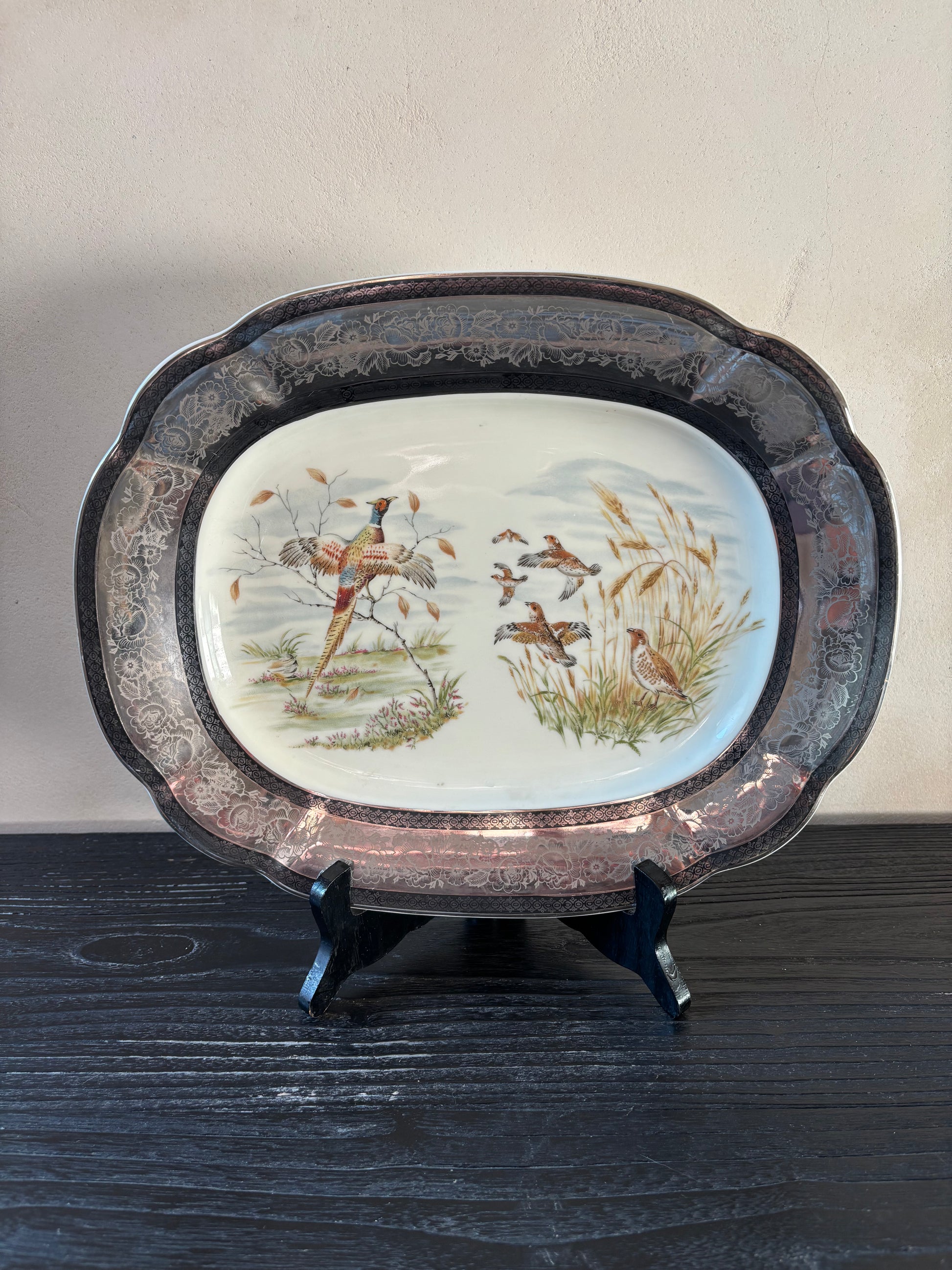 Fuente en porcelana inglesa con motivos cinegéticos (faisanes en un paisaje con juncos).