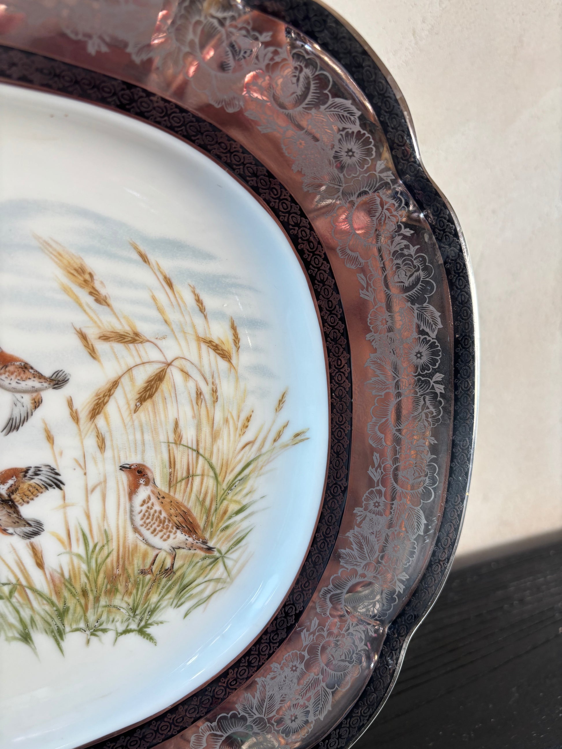 El borde es en esmalte vidriado con reflejo métalico plateado, muy usado en piezas de finales del siglo XIX y XX en Europa.