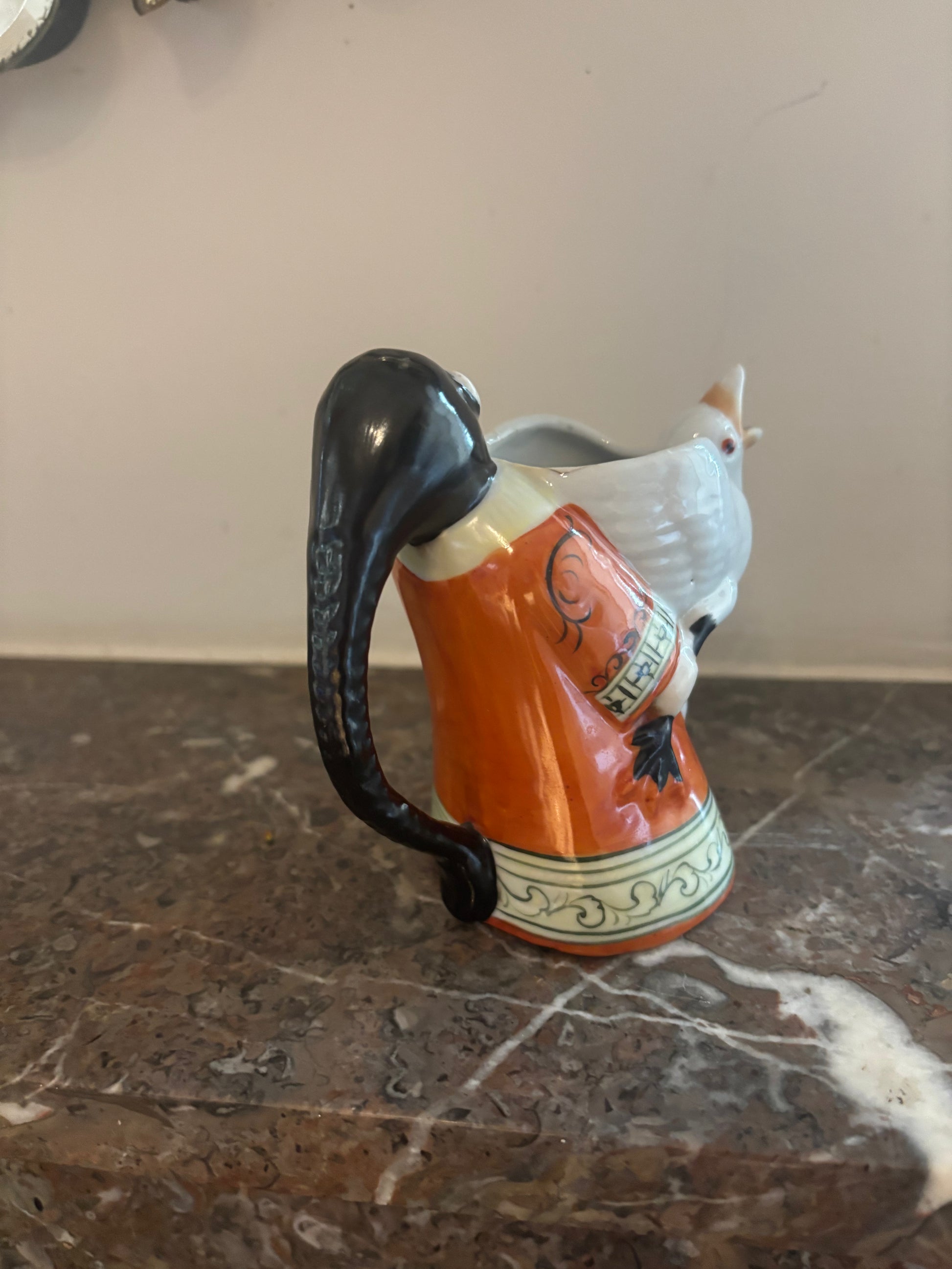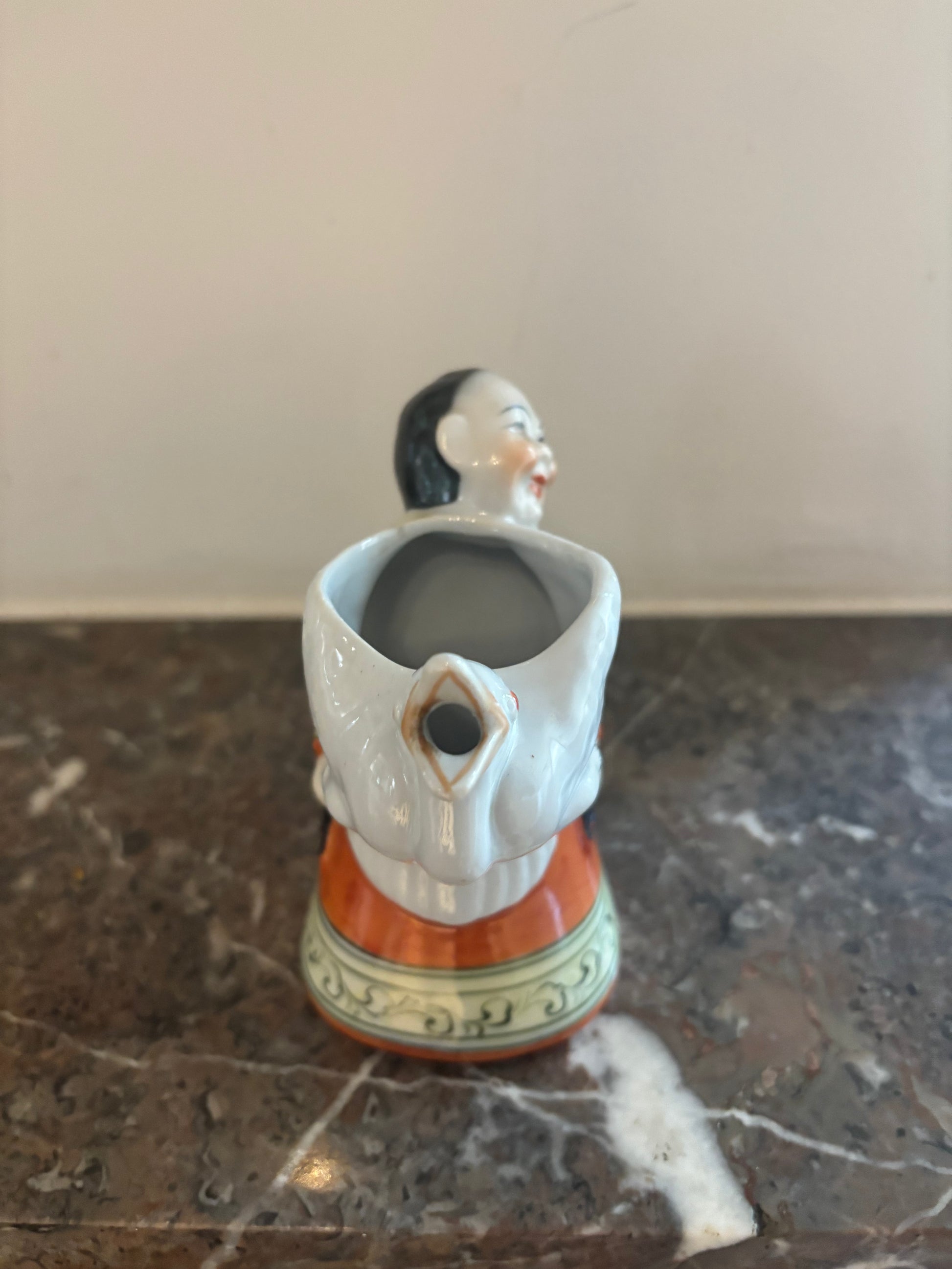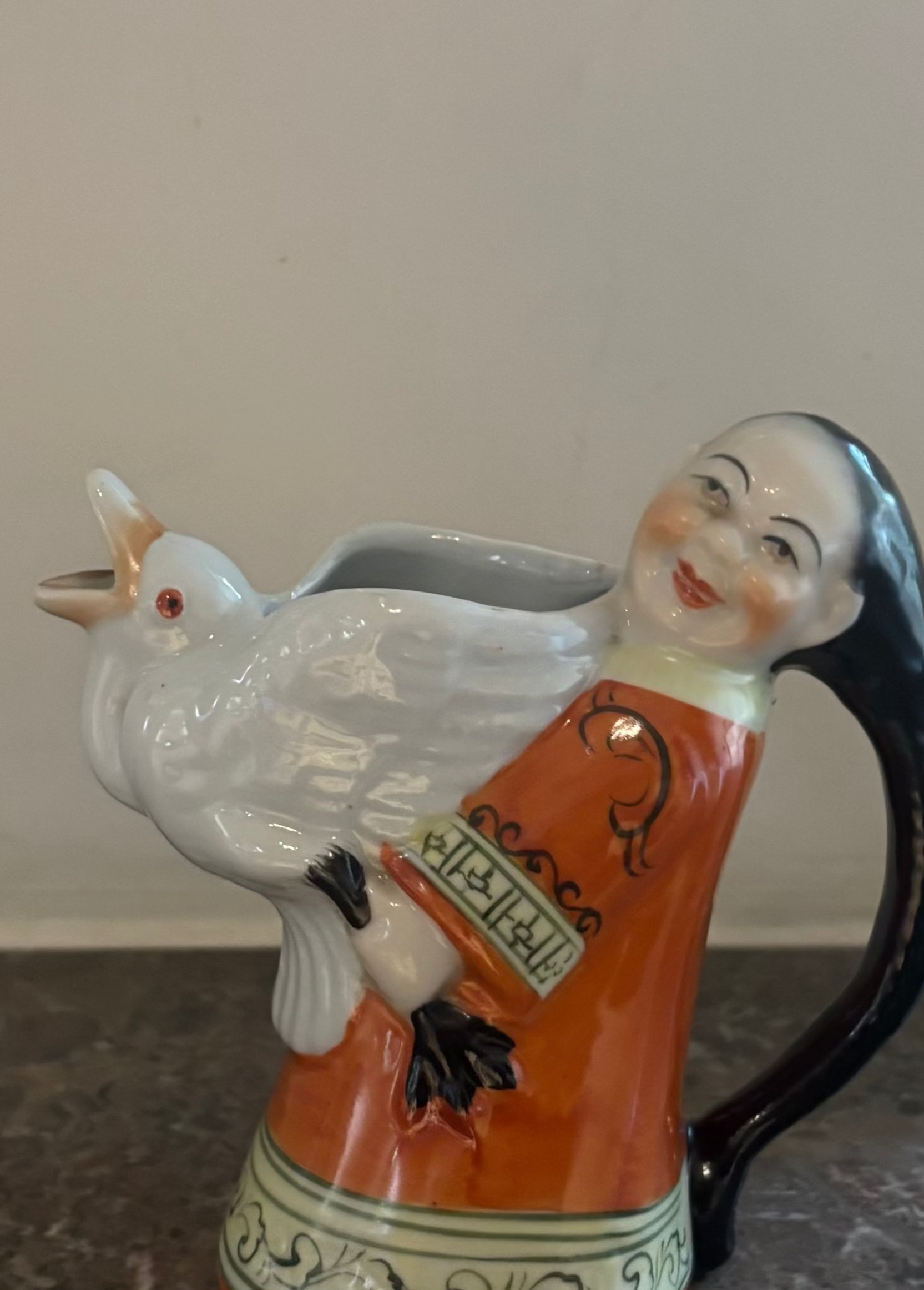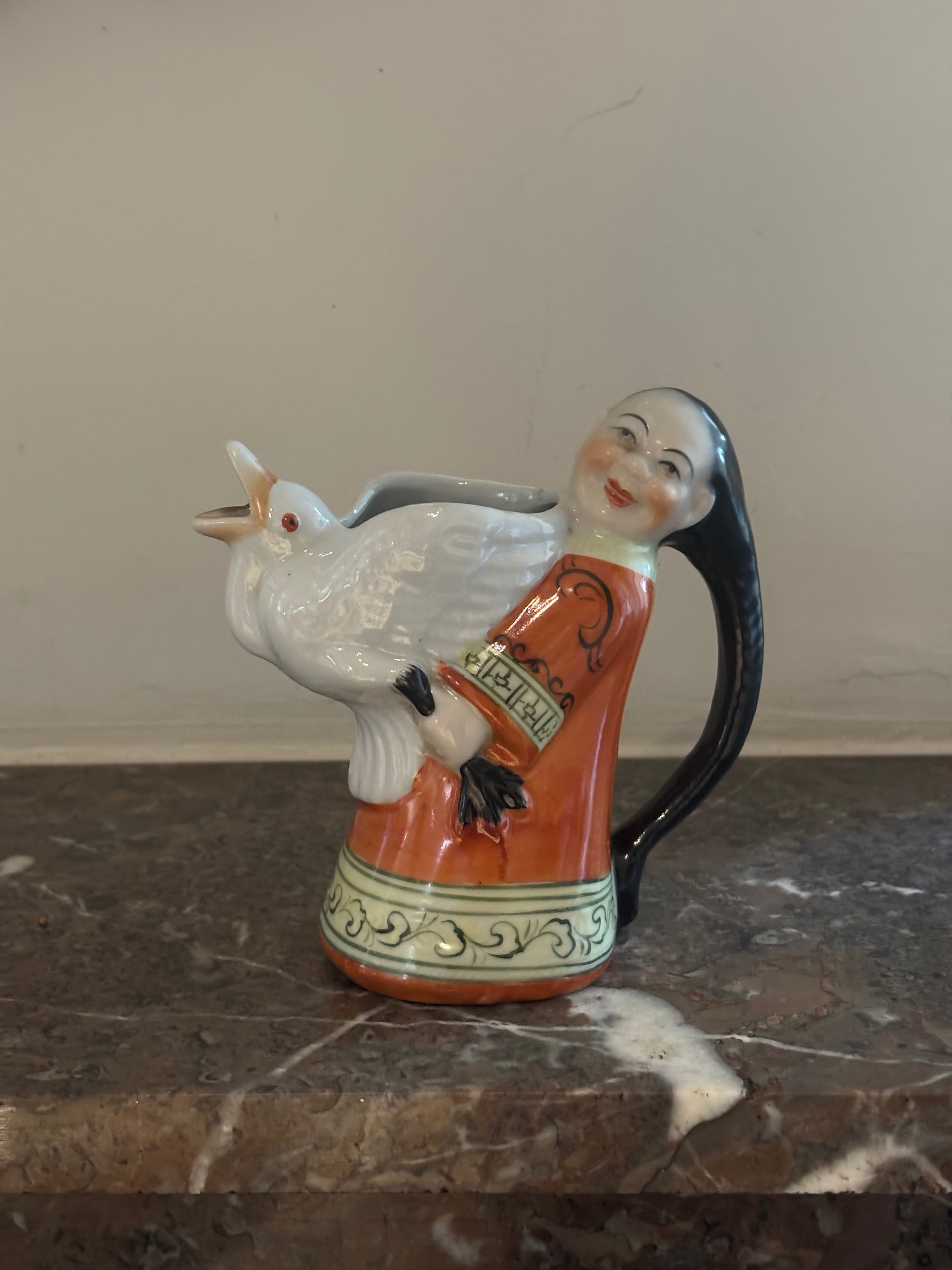 Representa a un hombre asiático sosteniendo a un ganso. El pico del ganso hace de surtidor y el cabello el hombre es la asa.