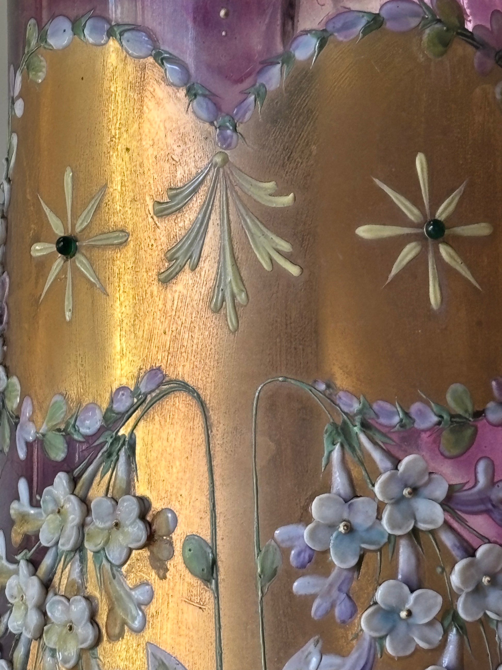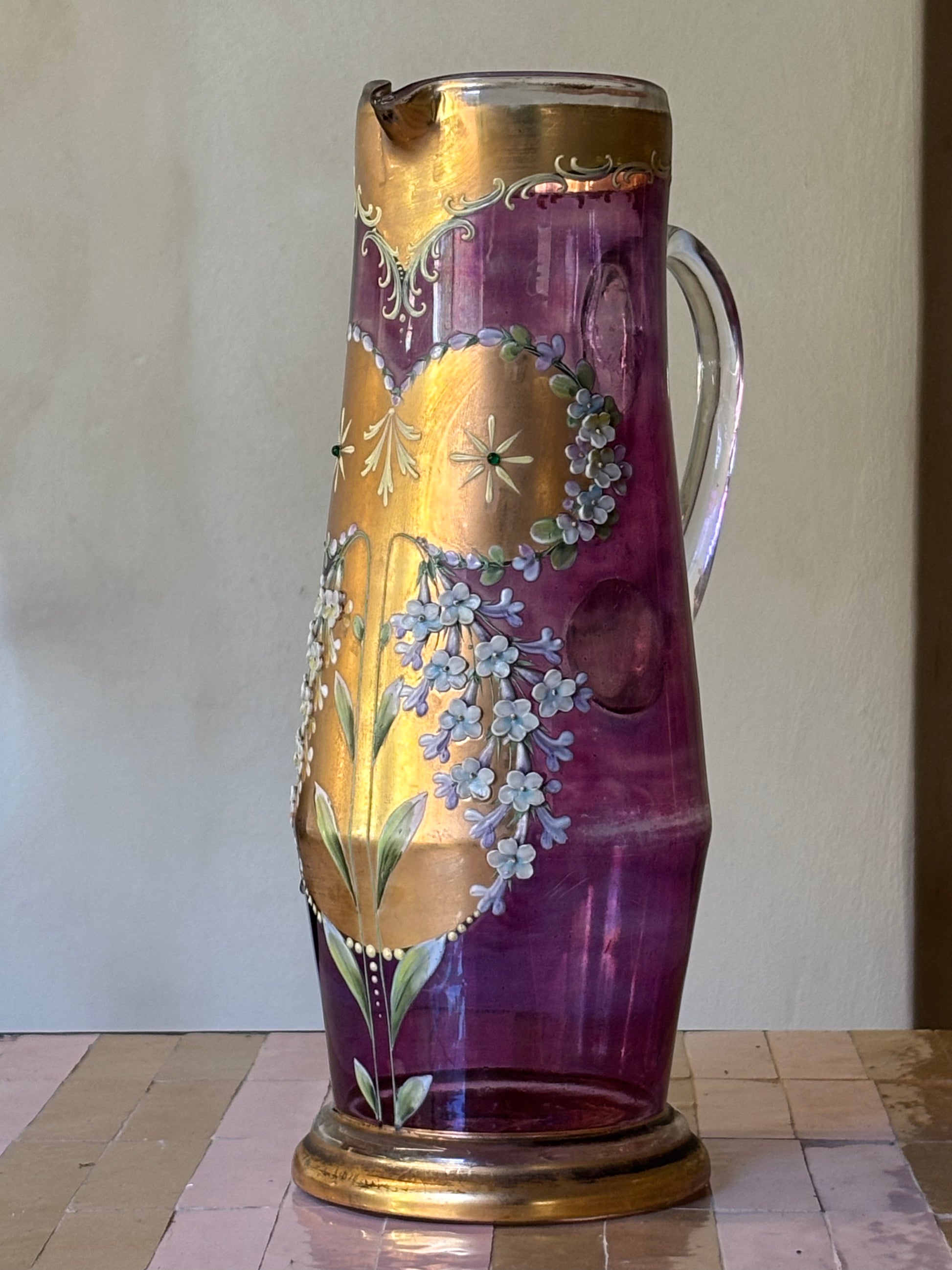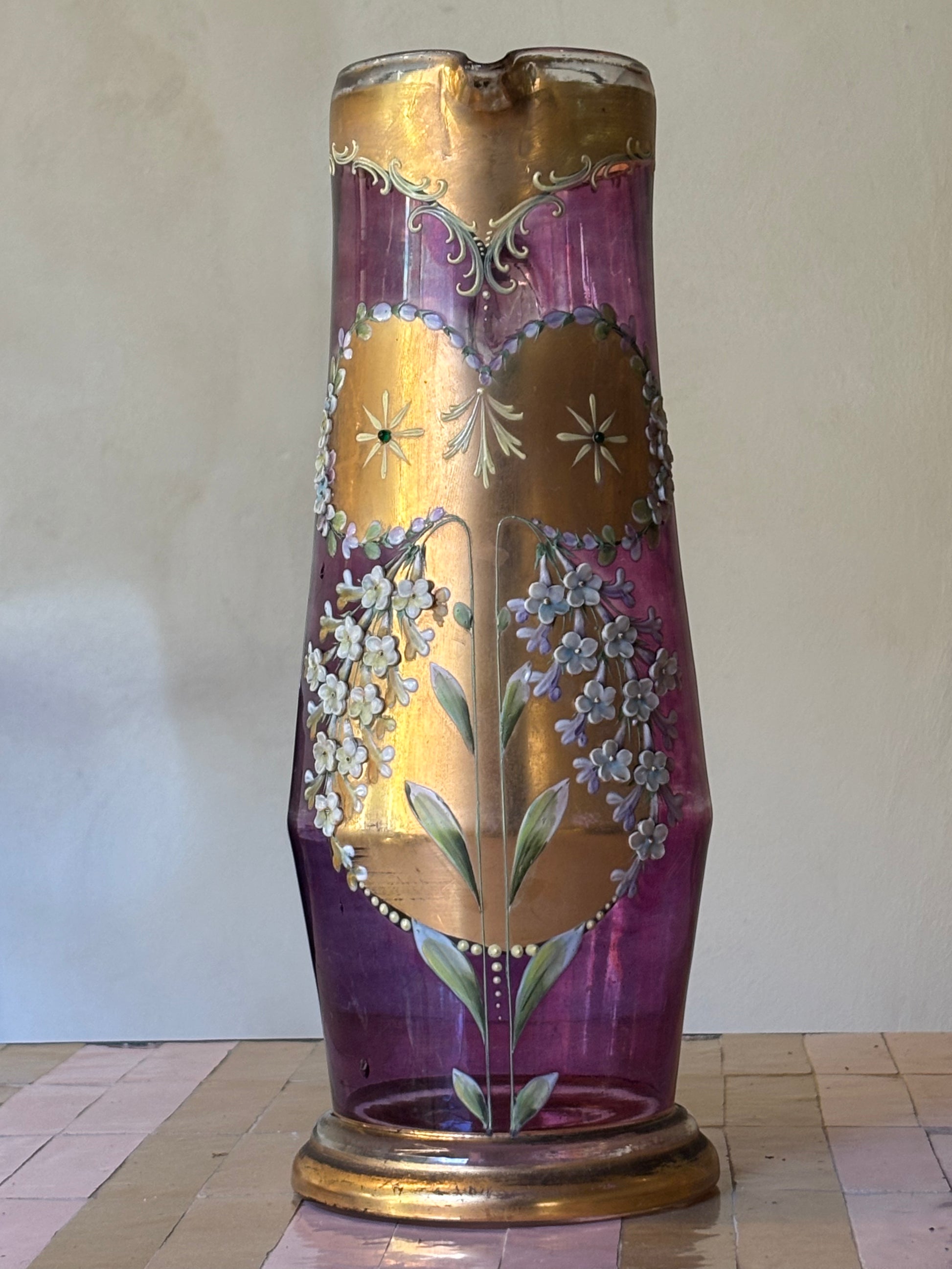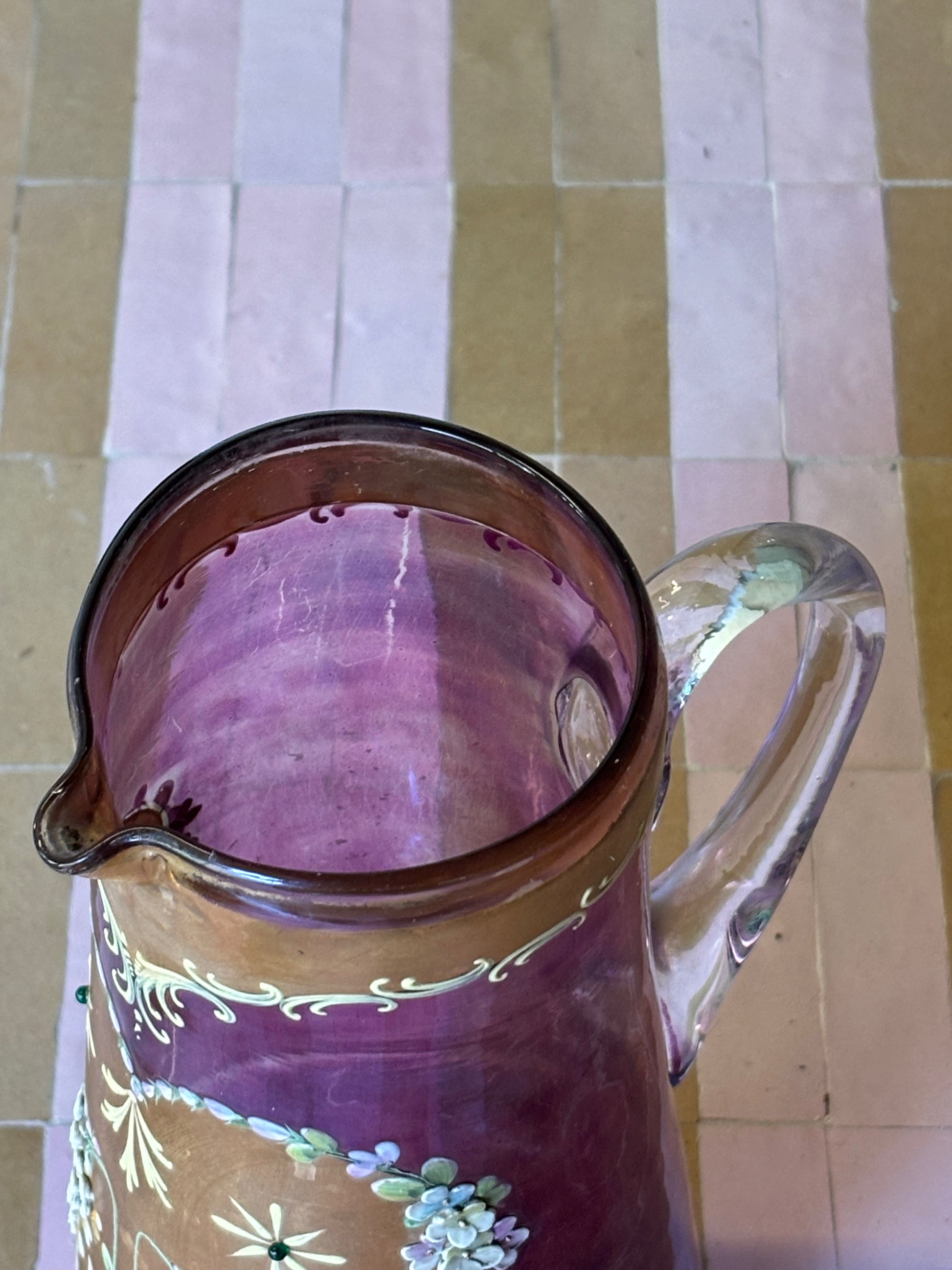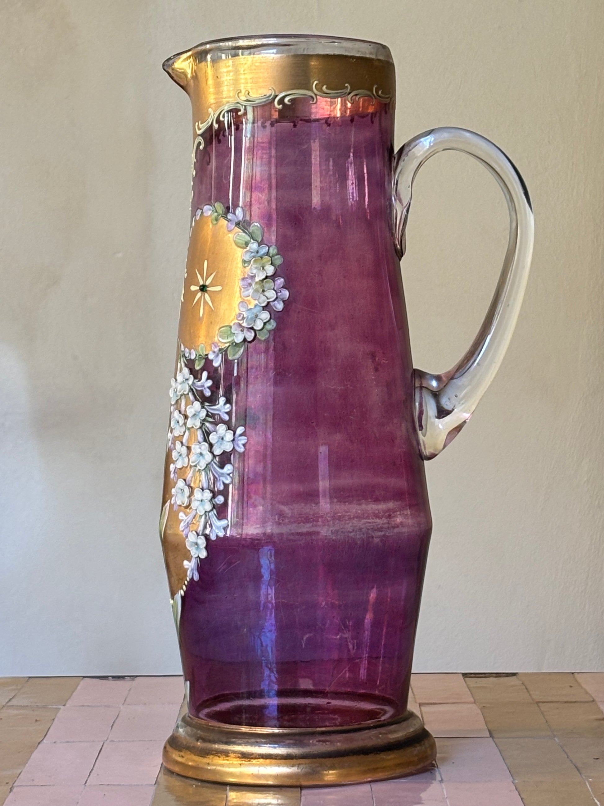 Jarra antigua Húngara de vidrio, con incrustaciones de florecitas. Pintada a mano formando la cara de un Buho, purpura y oro.
