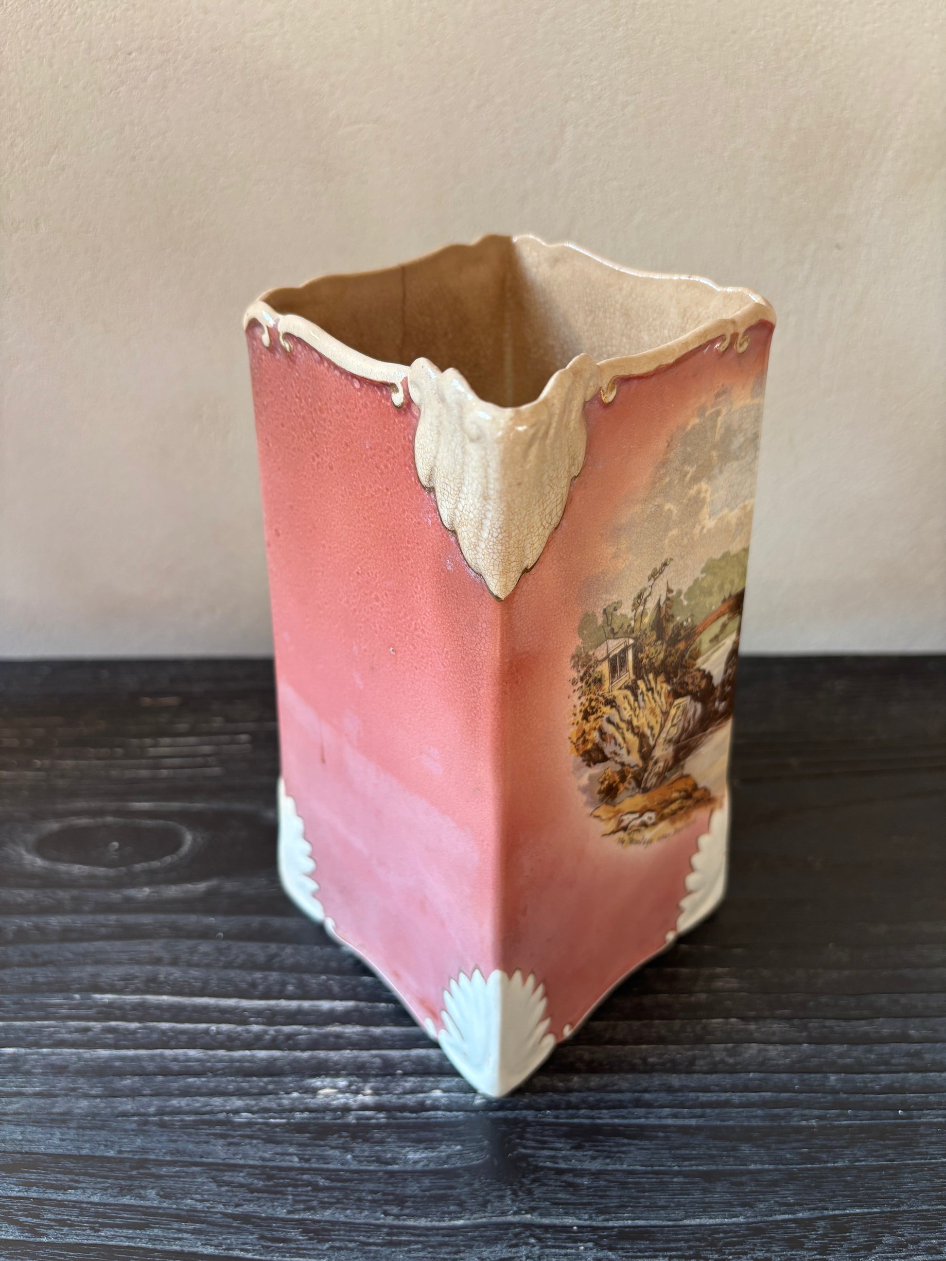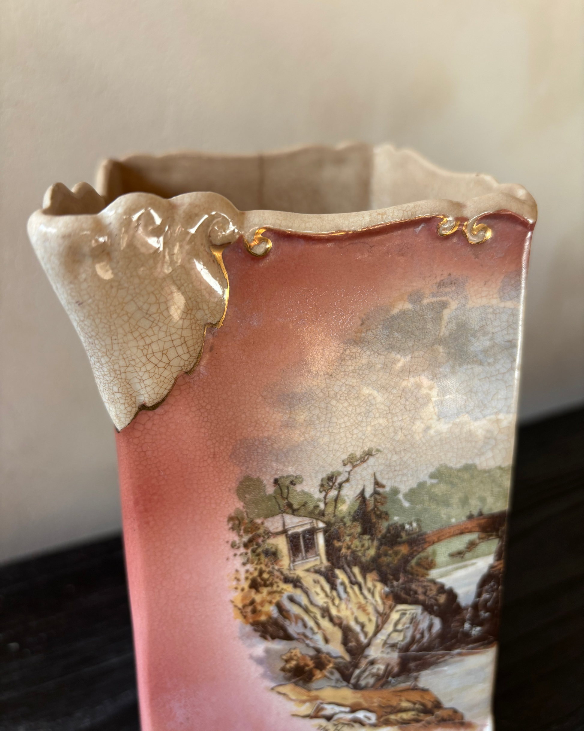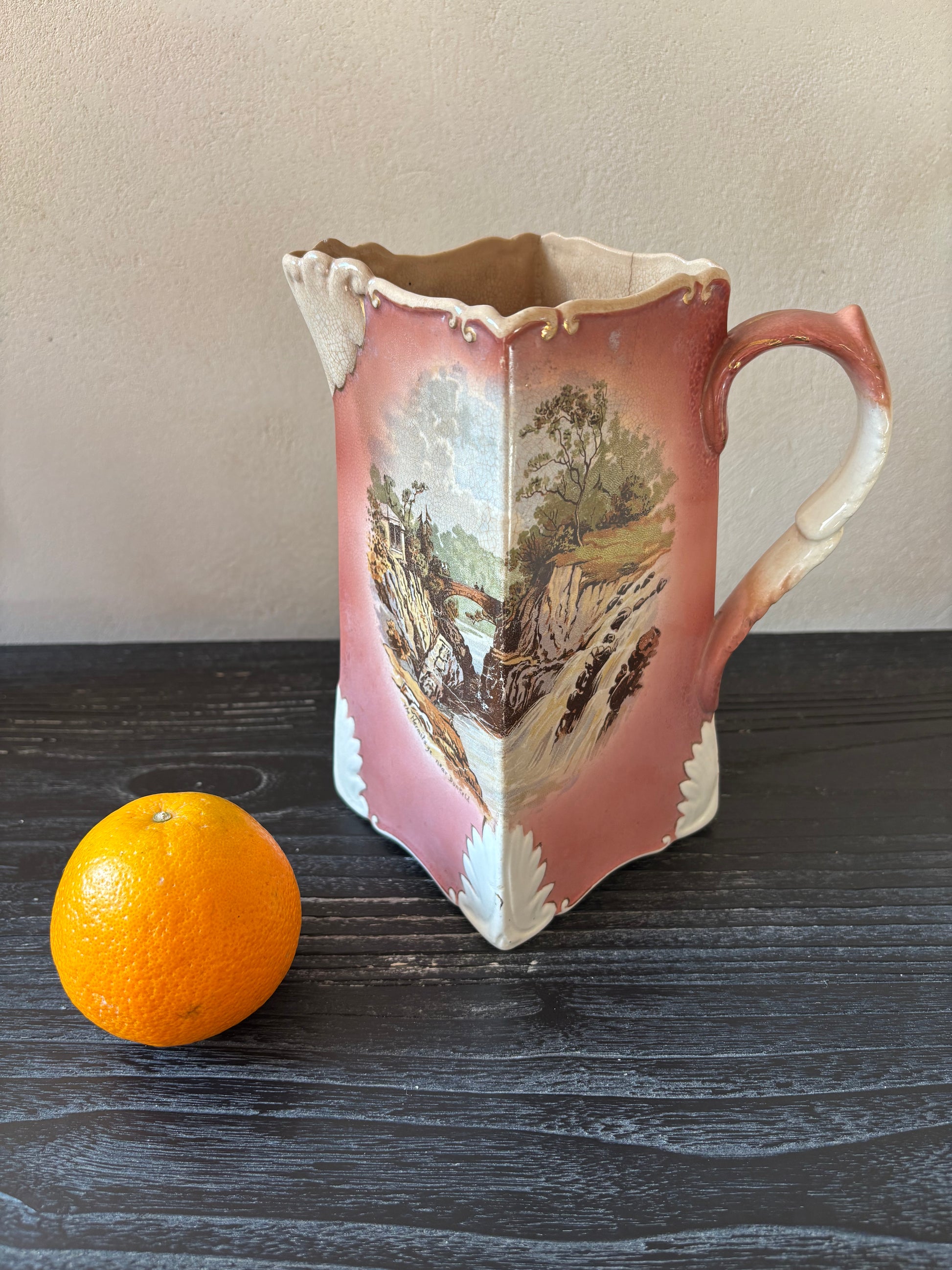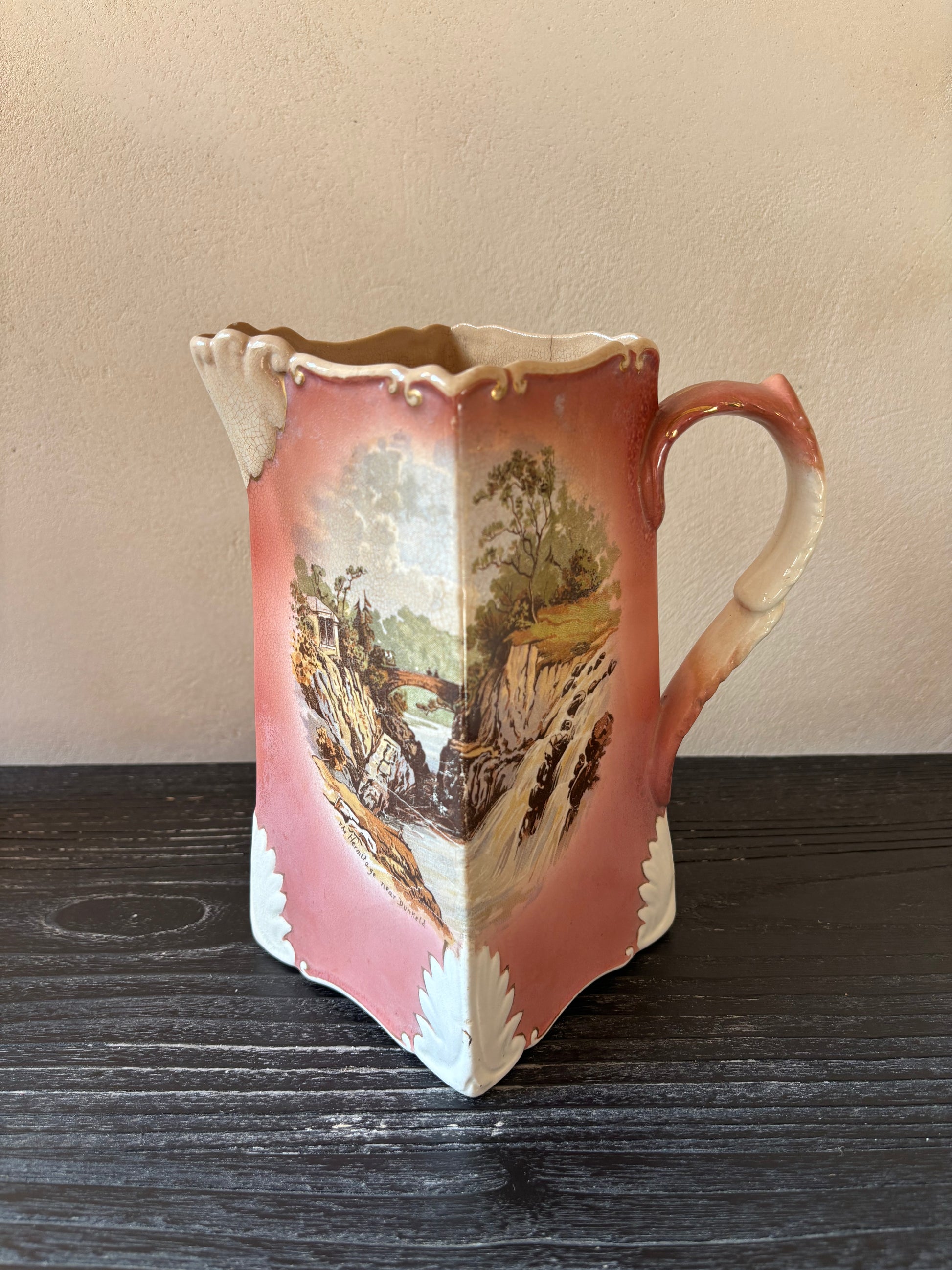 Jarra original cuadrada de porcelana inglesa, pintada a mano. Se puede apreciar el paisaje "The hermitage near Dunkeld".