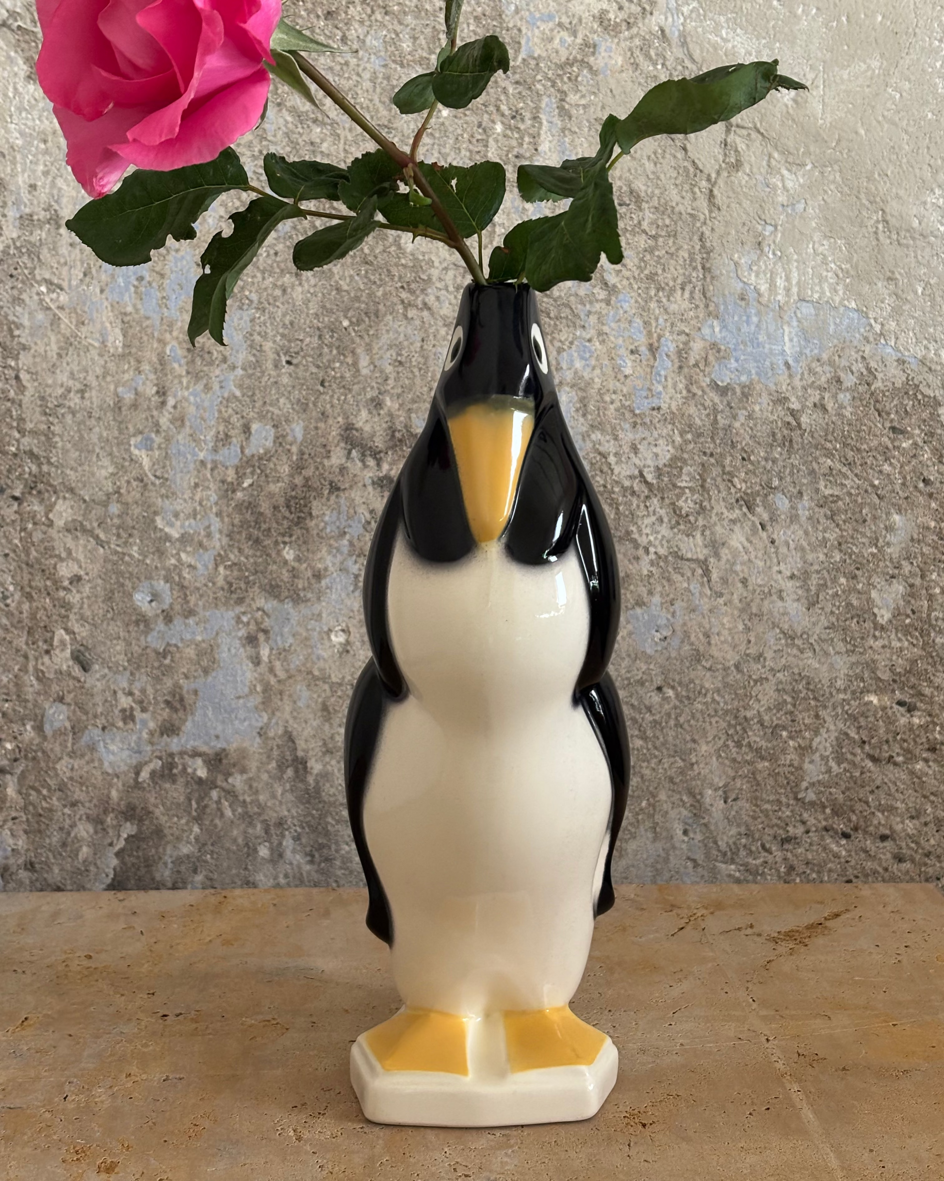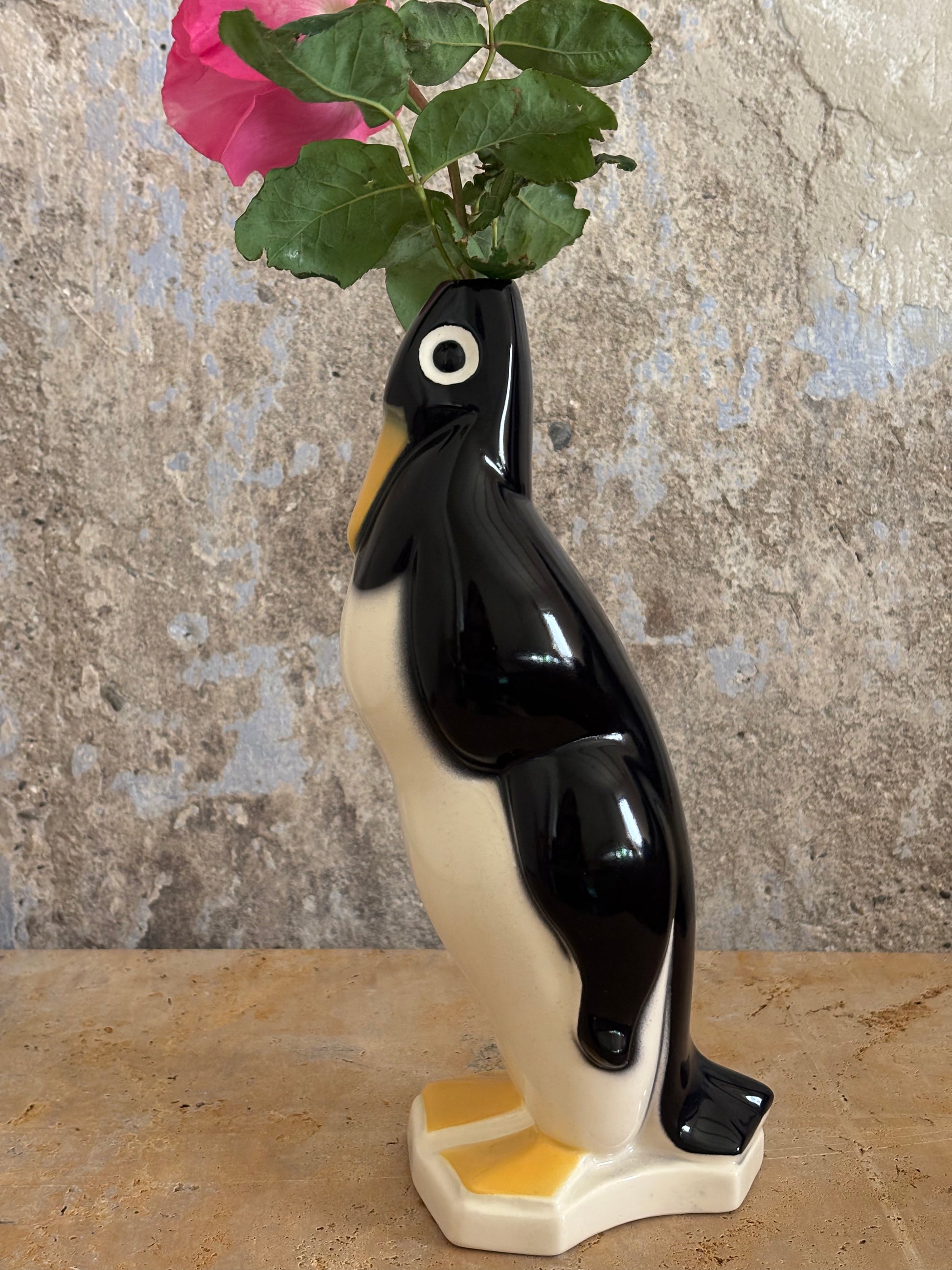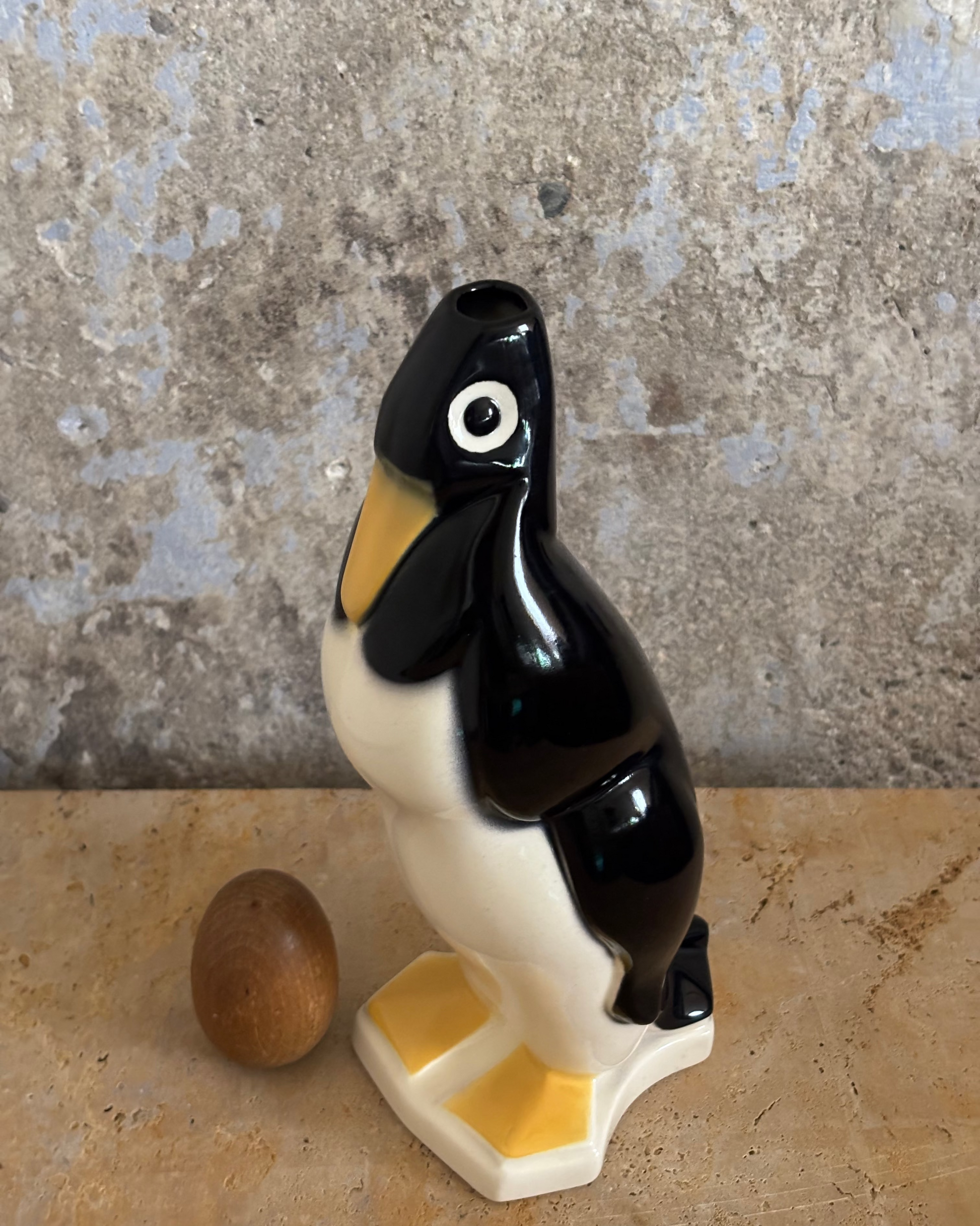 Jarra francesa vintage con diseño de pingüino, loza de Saint Clément, firmada por Géo Condé, esmaltada policromáda.