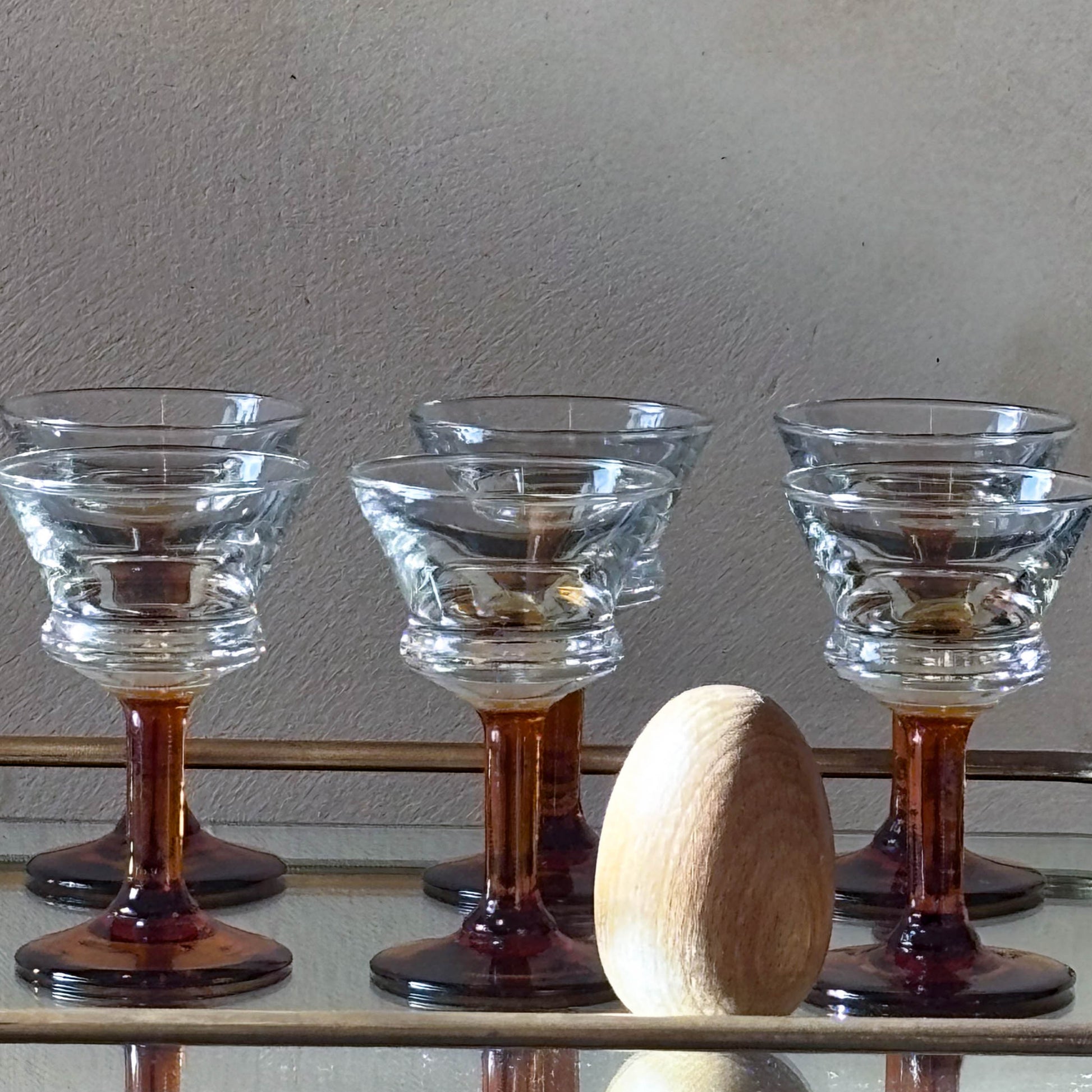 Juego de 6 copas de licor, cristal templado con pie de color melado.