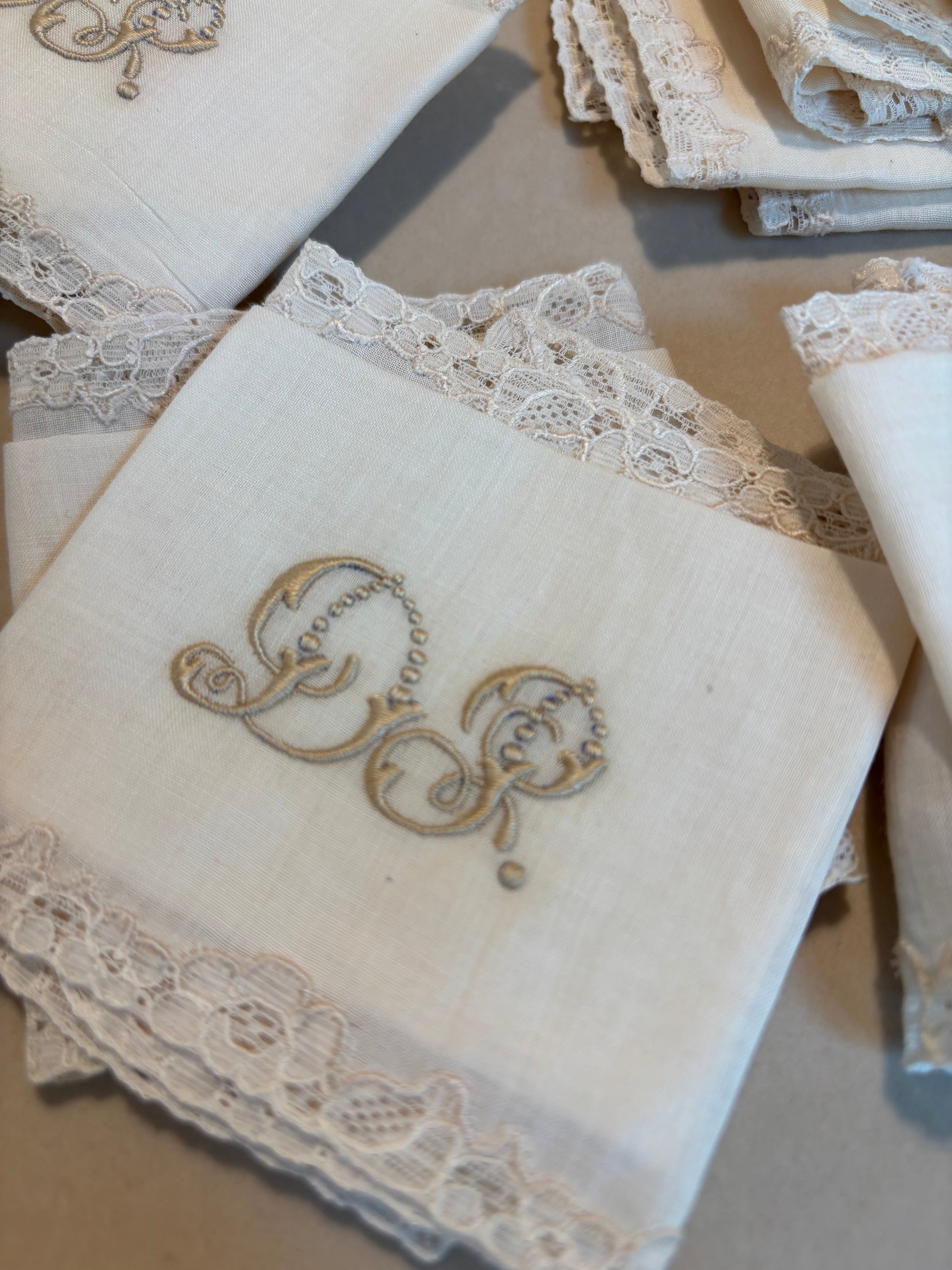 Cada pieza esta bordada con las iniciales "DR" y terminada con una puntilla cosida a mano.
