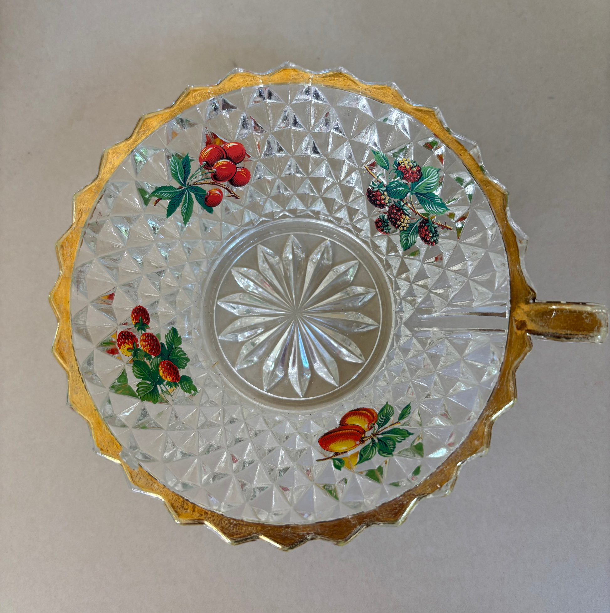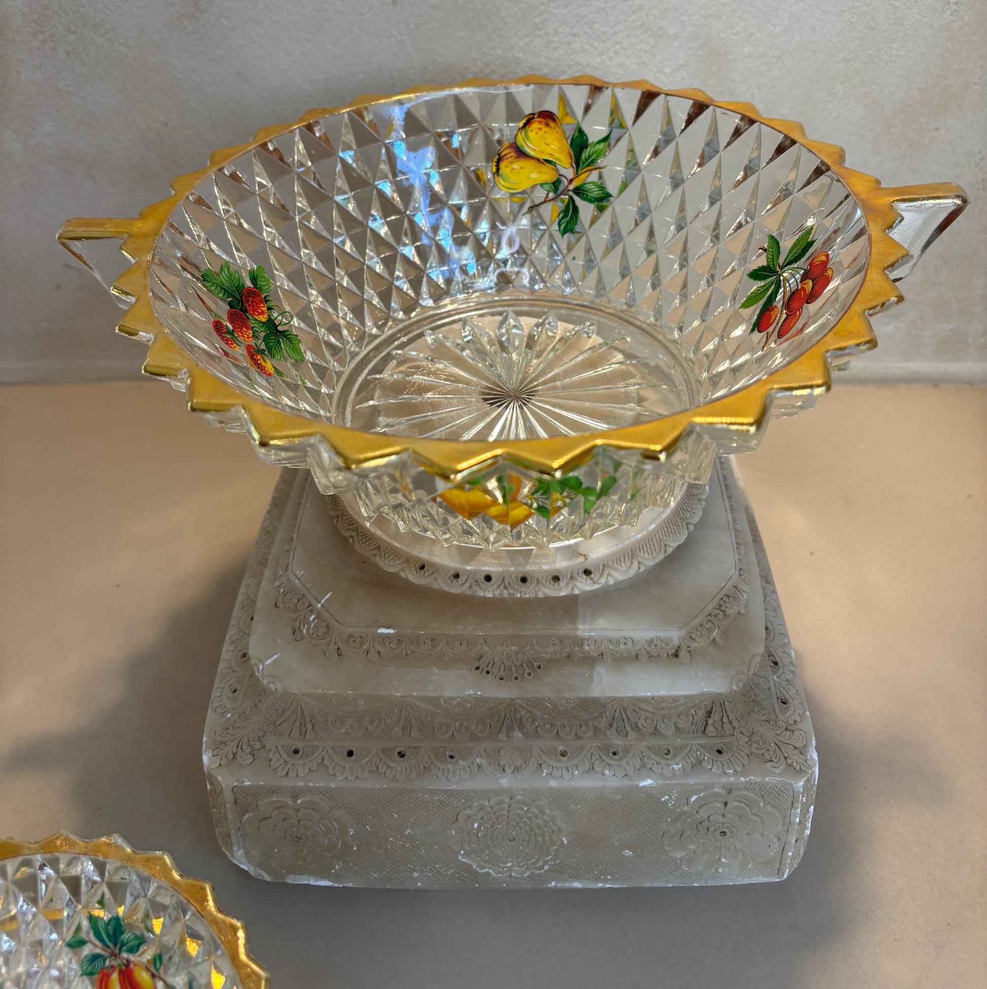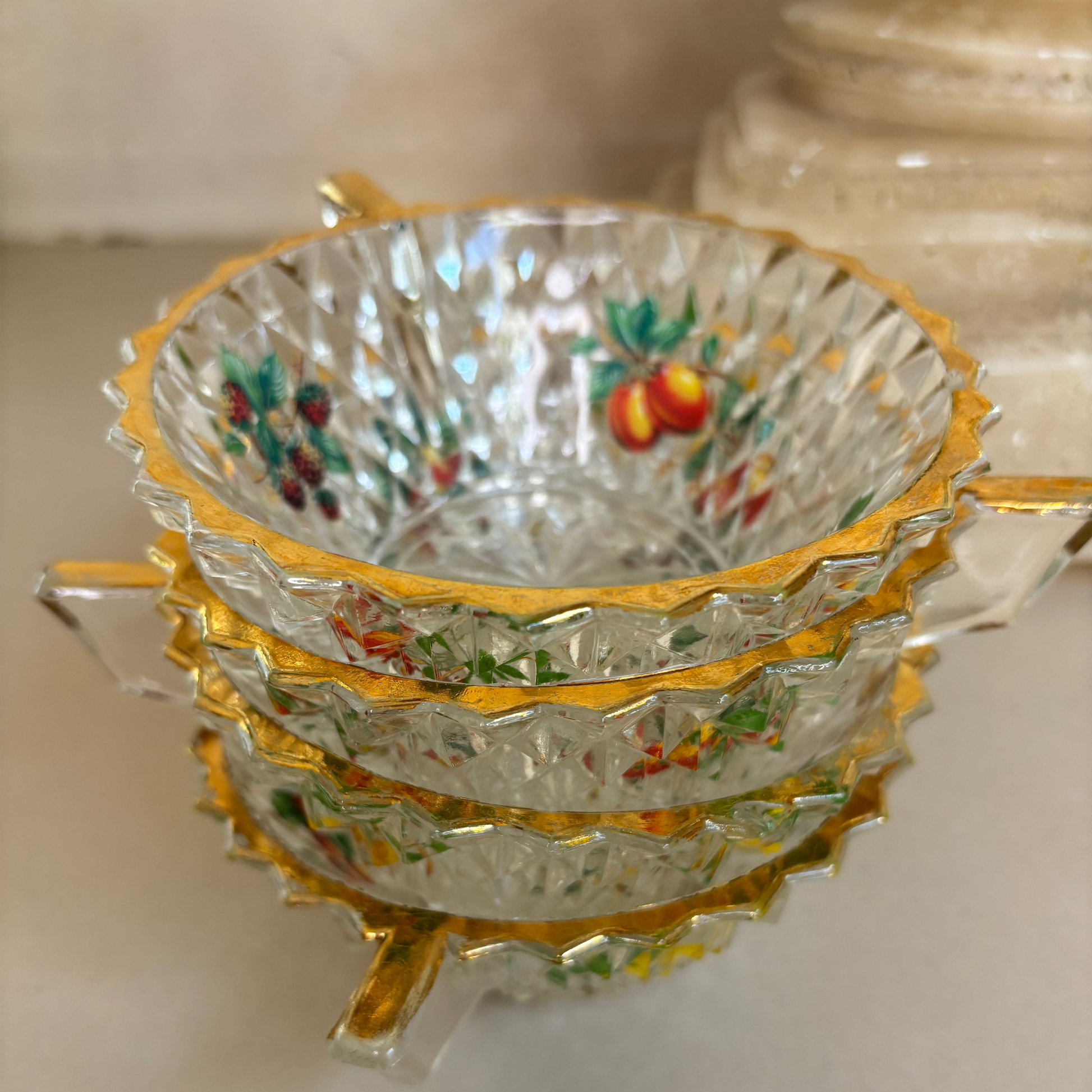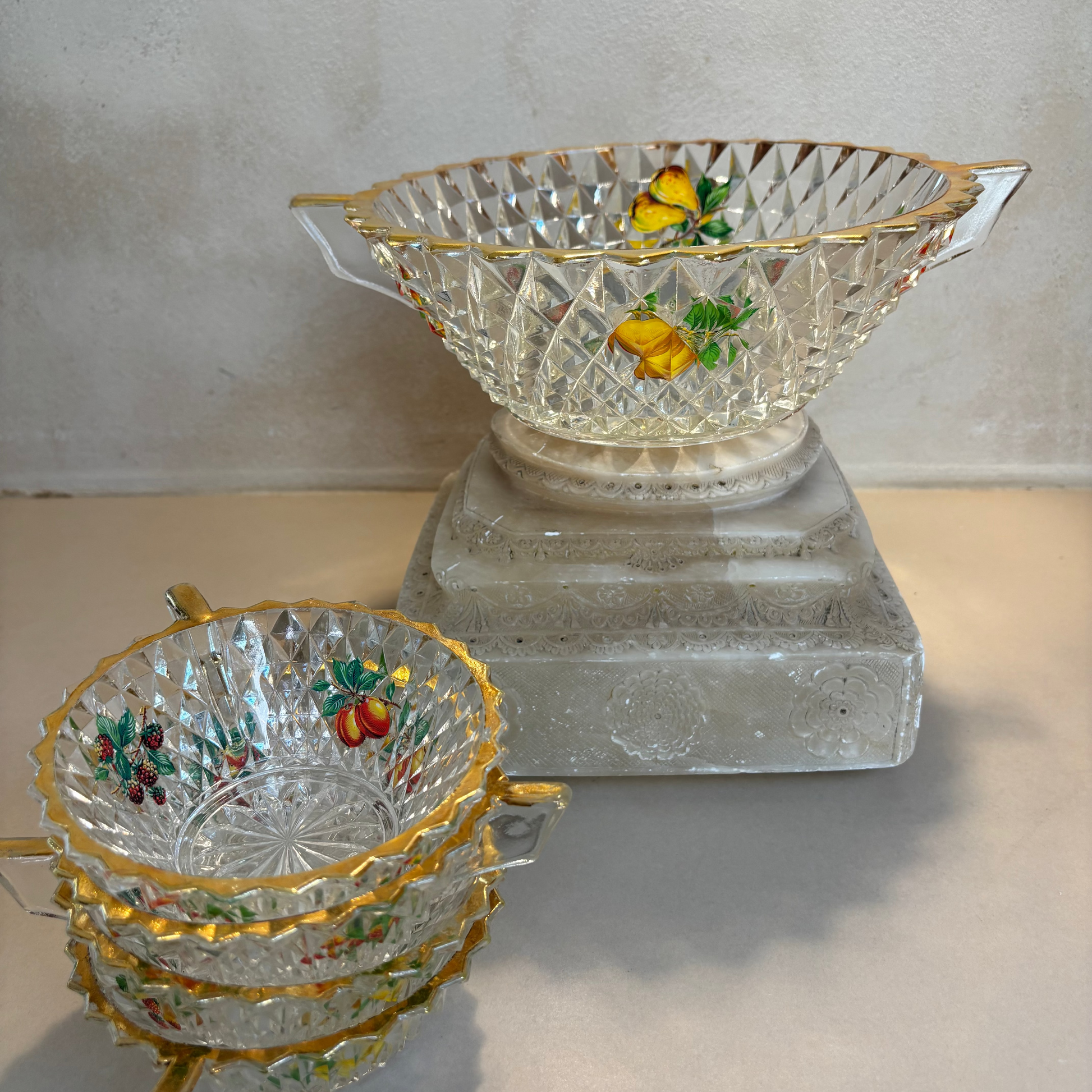 Set de fuente más 4 boles en cristal tallado de la década 1950. Diseñado como set para la macedonia. Dibujos en el interior de los cuencos con frutas y perfilados en dorado.
