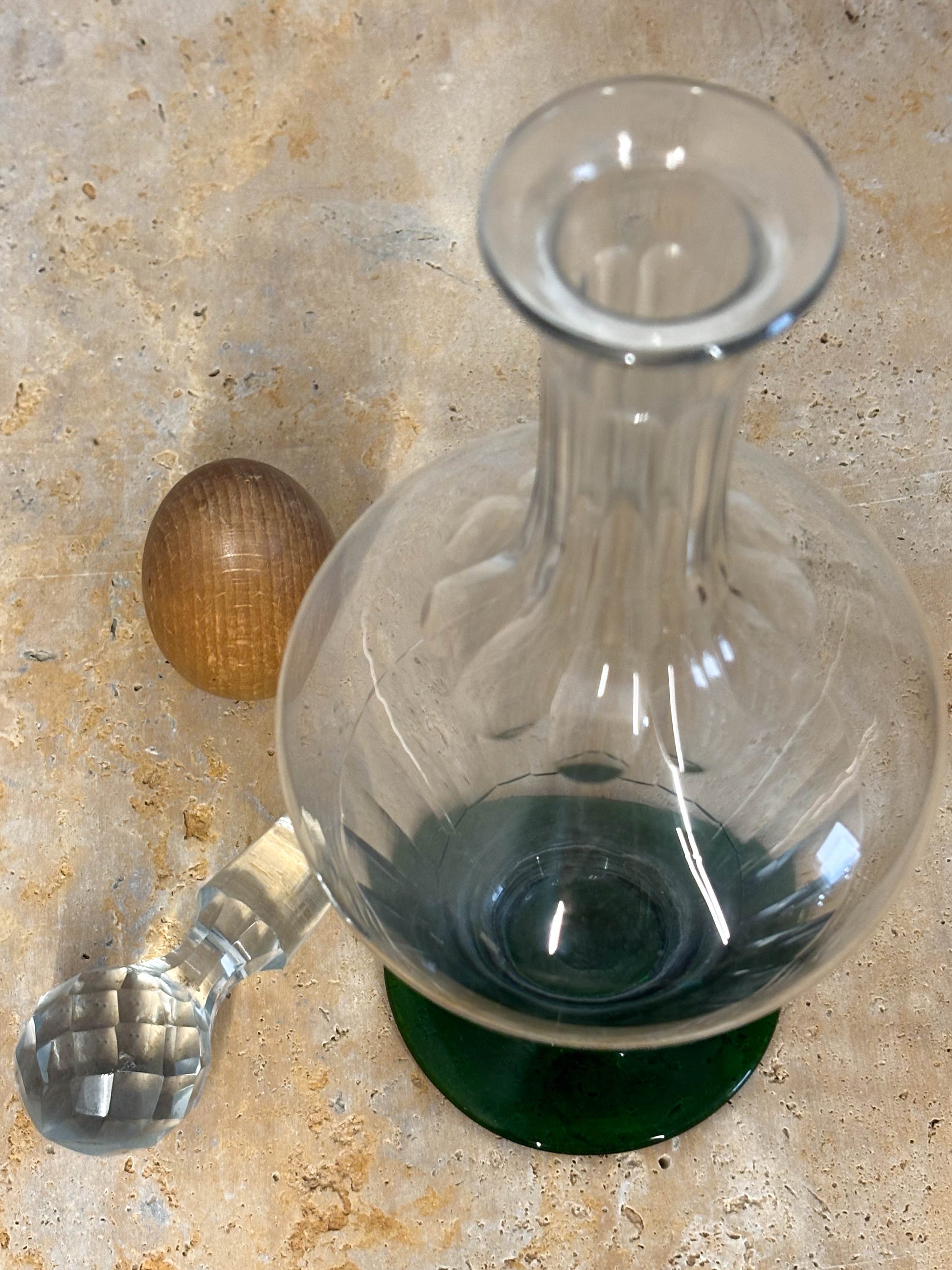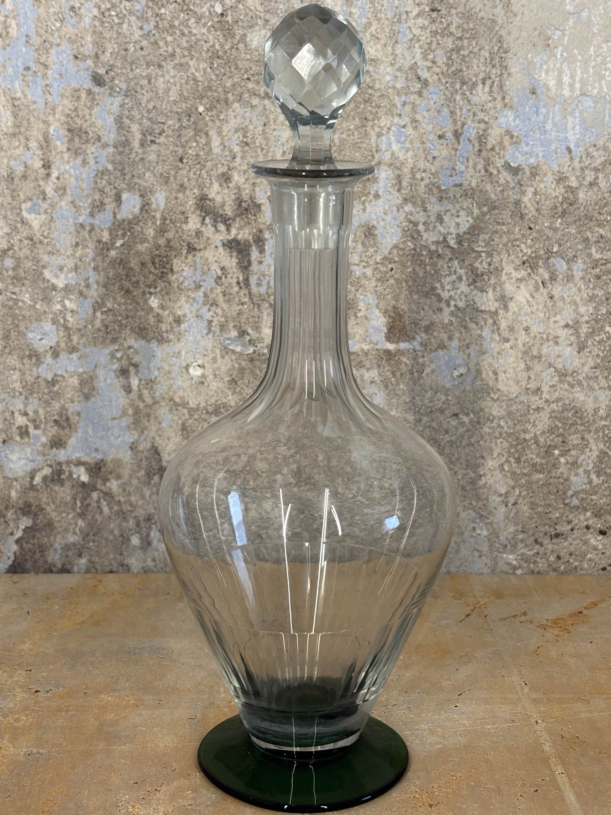 Botella licorera realizada en cristal tallado a mano con el tapón original. La base en color verde.