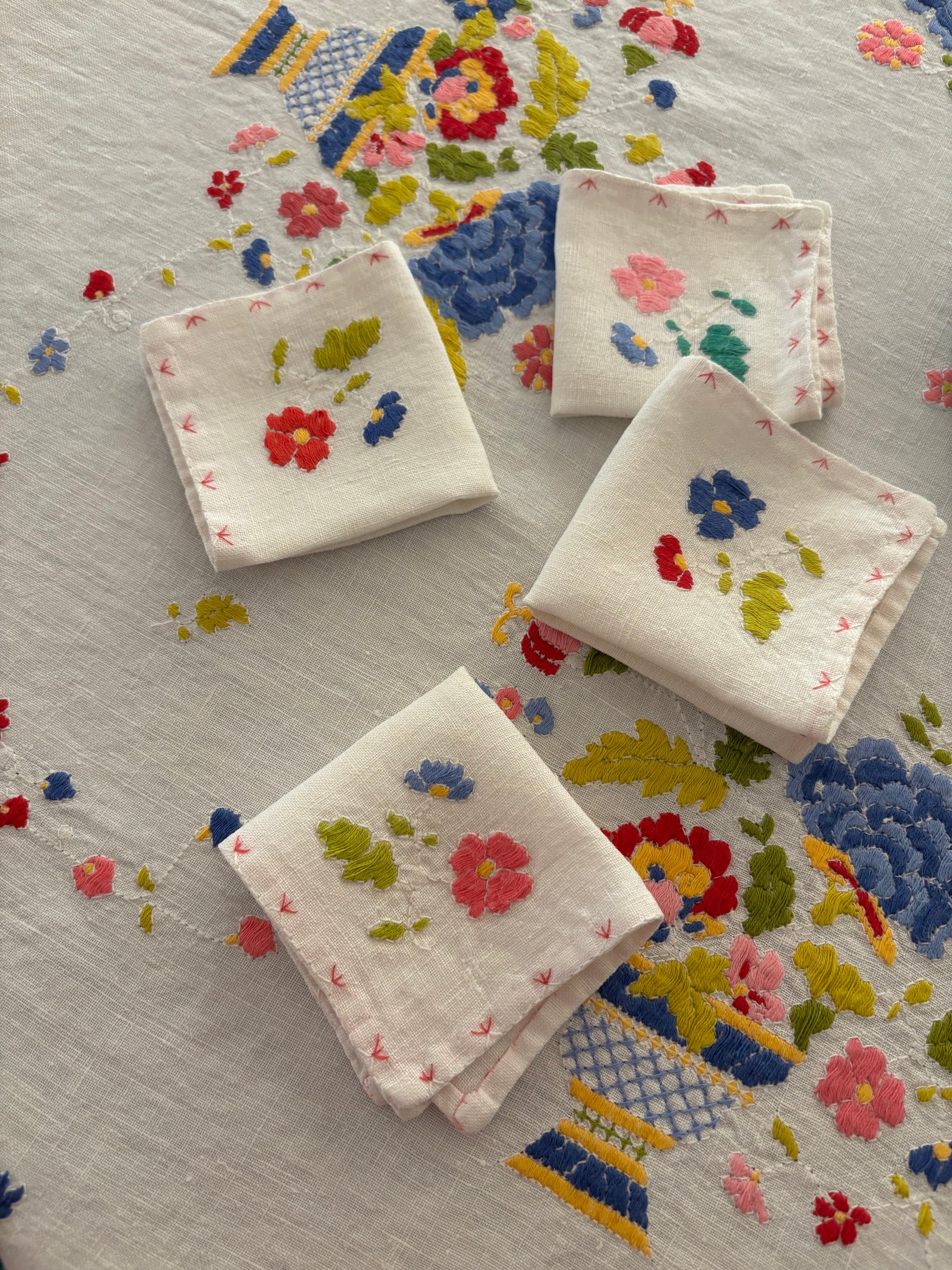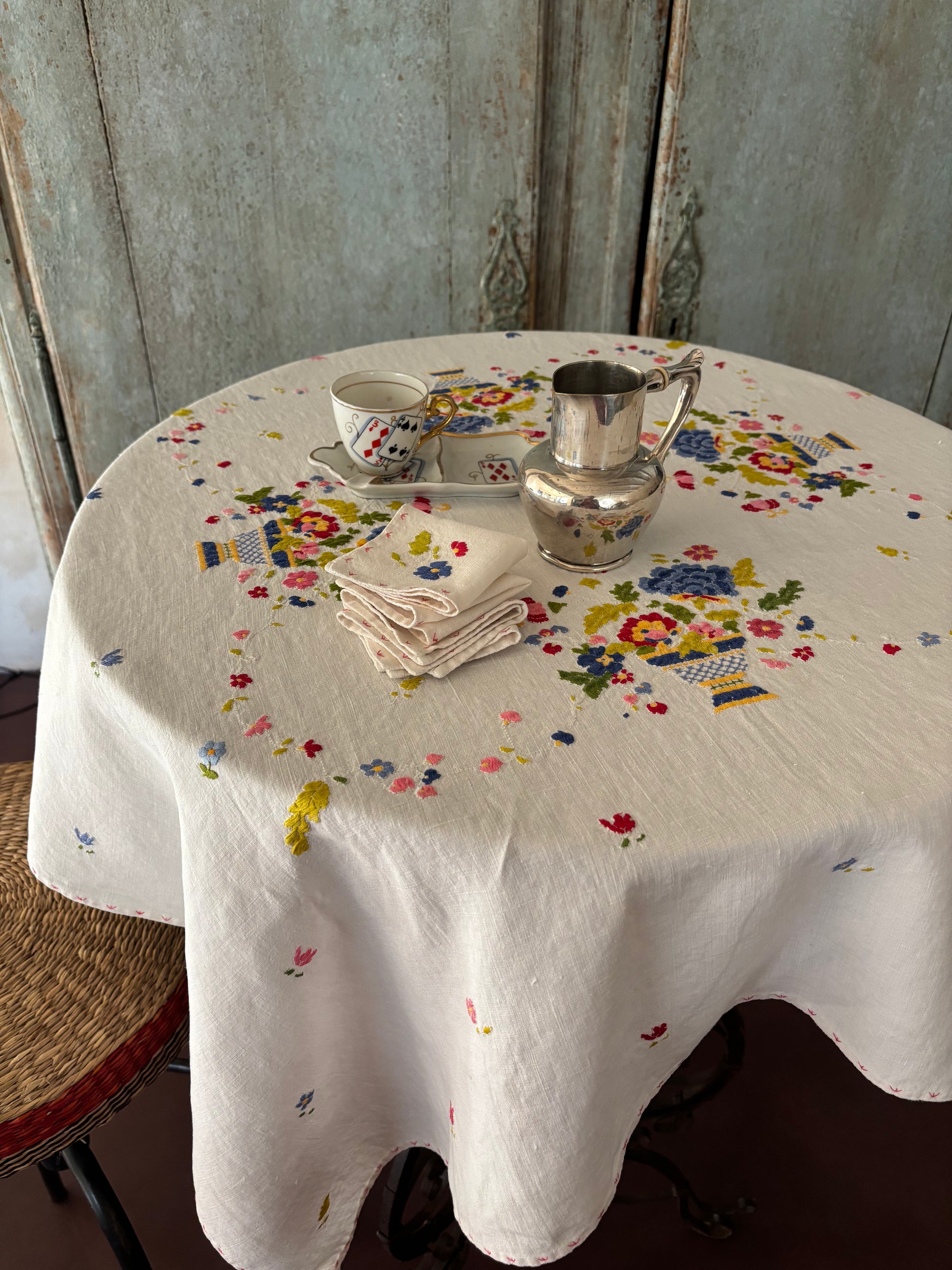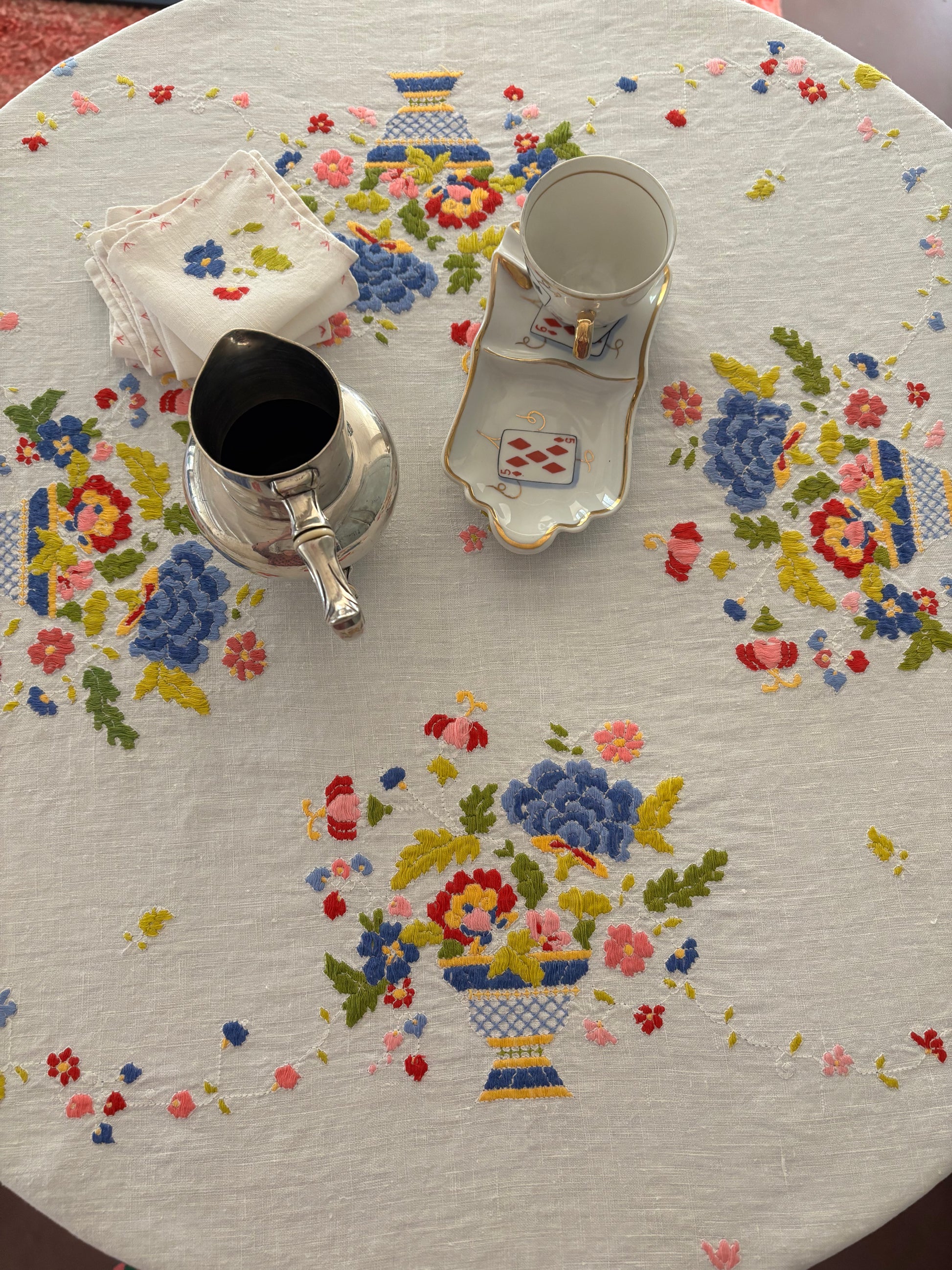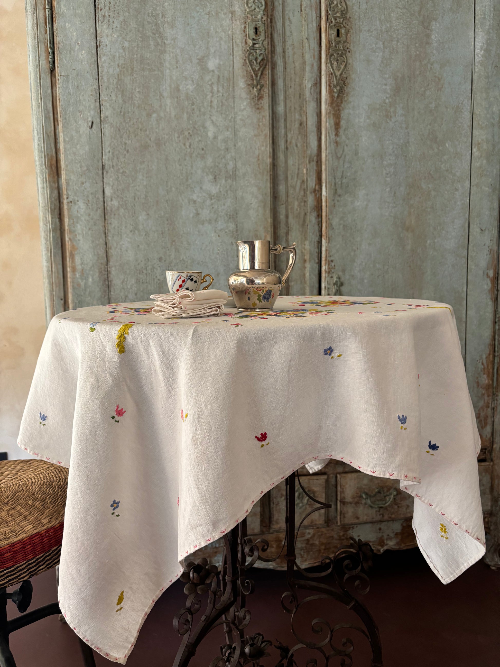Mantel vintage cuadrado color blanco en lino, ideal para mesas redondas. Incluyen 4 servilletas de tamaño pequeño. Todo bordado a mano.