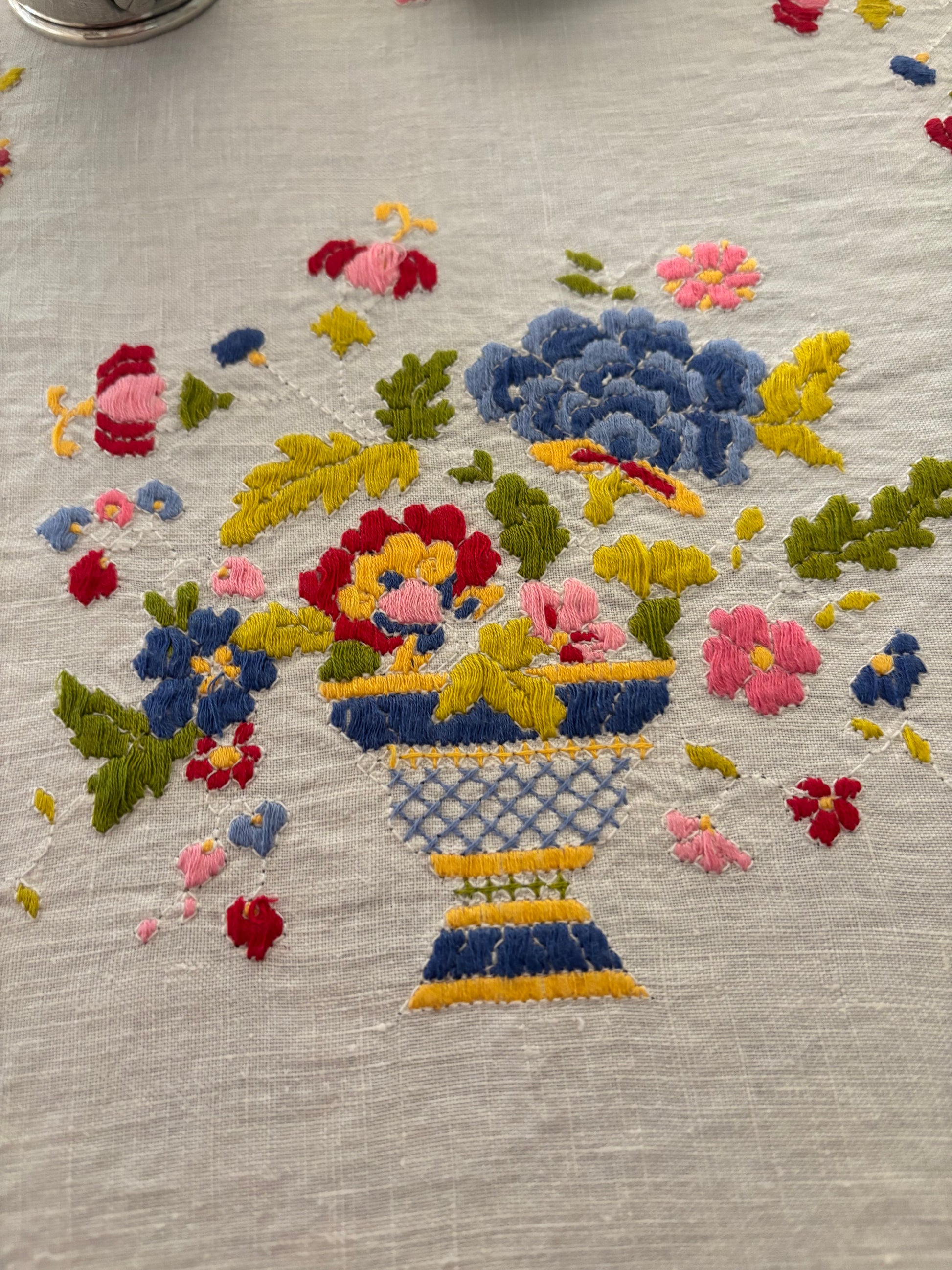 MANTEL LINO ANTIGUO BORDADO A MANO.