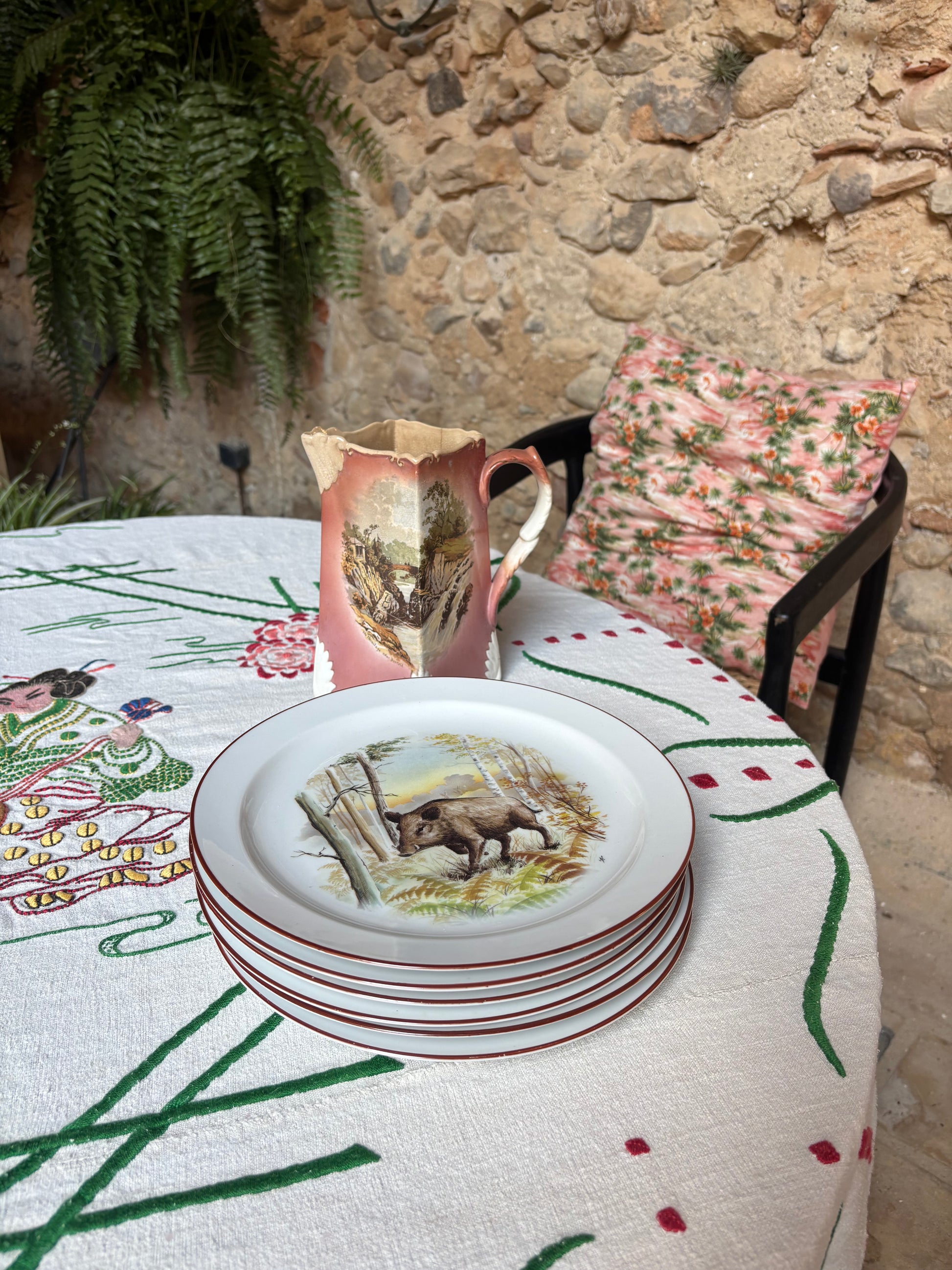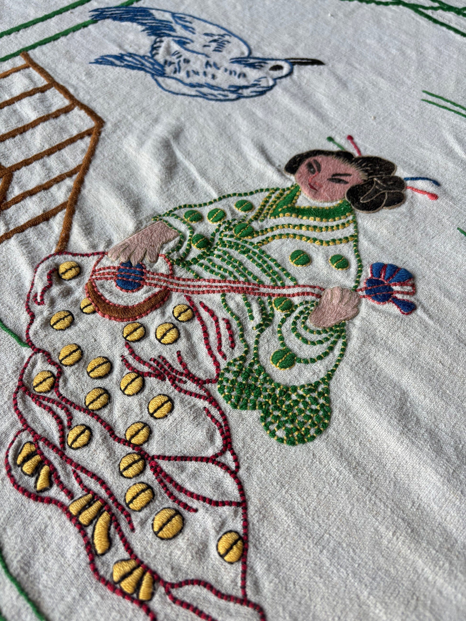 Espectacular mantel antiguo de lino grueso en color lino natural. Bordado en su totalidad con motivos orientales, apreciando en el centro del mantel una geisha tocando un shamisen, en hilo de algodón.