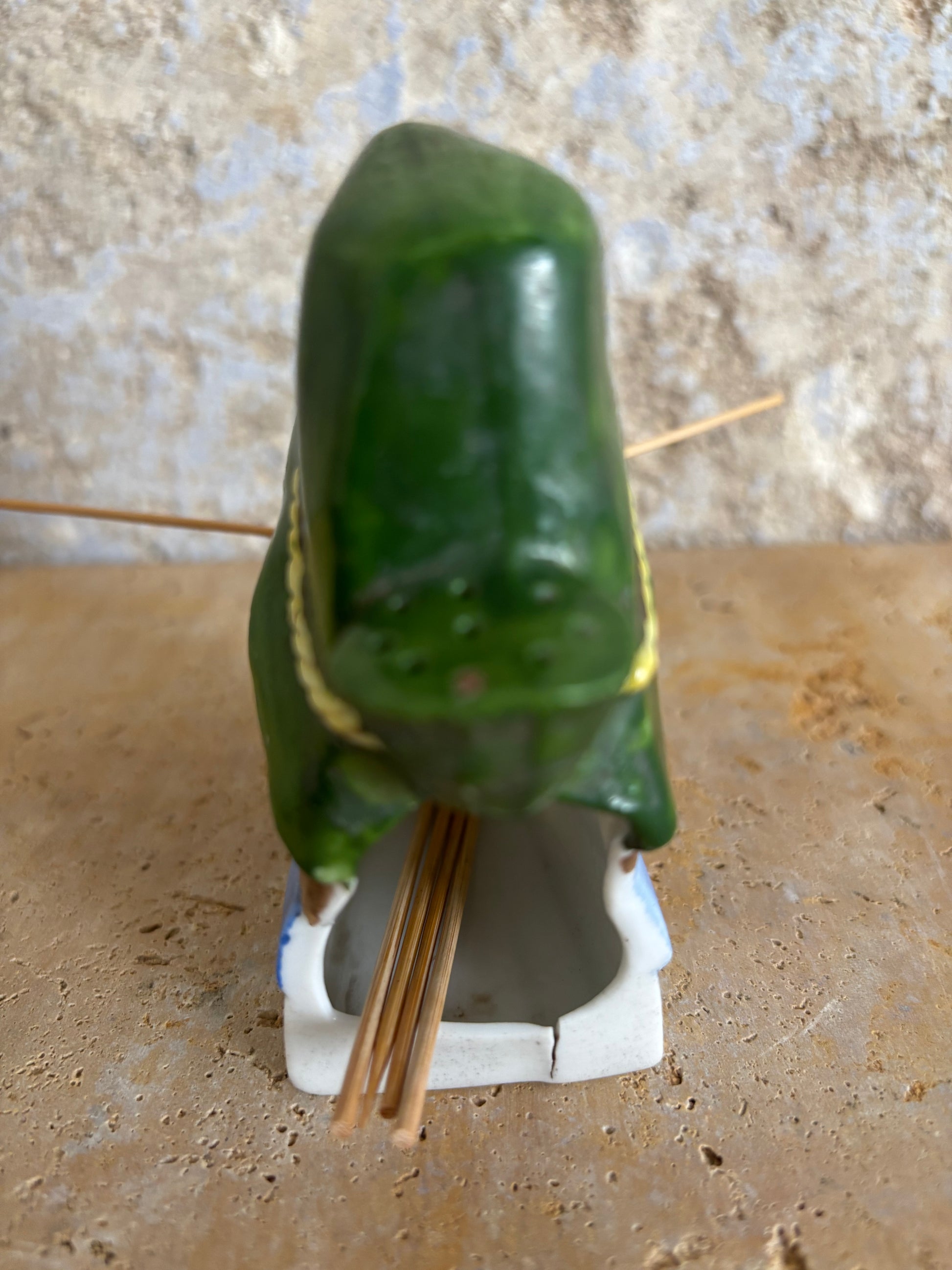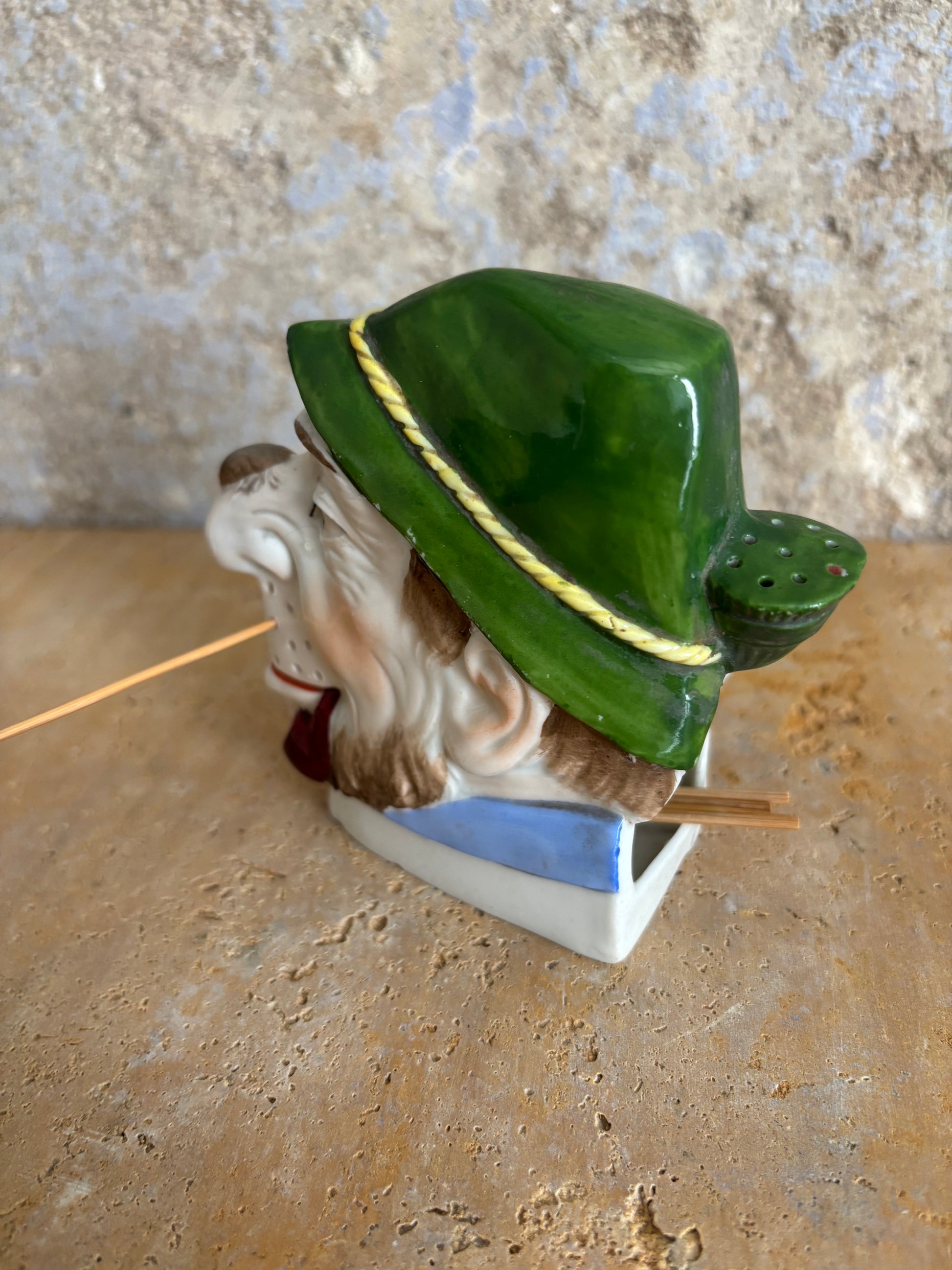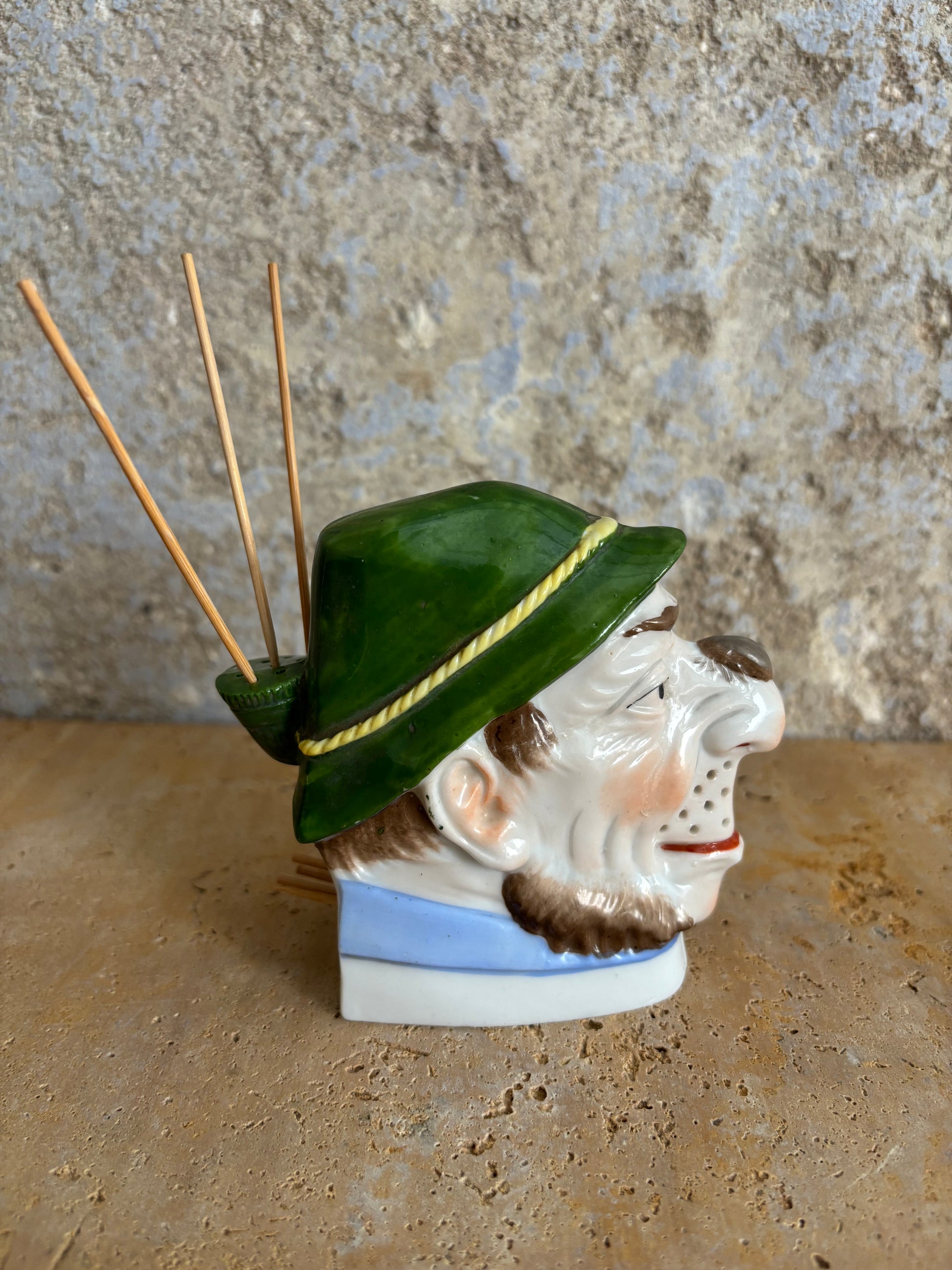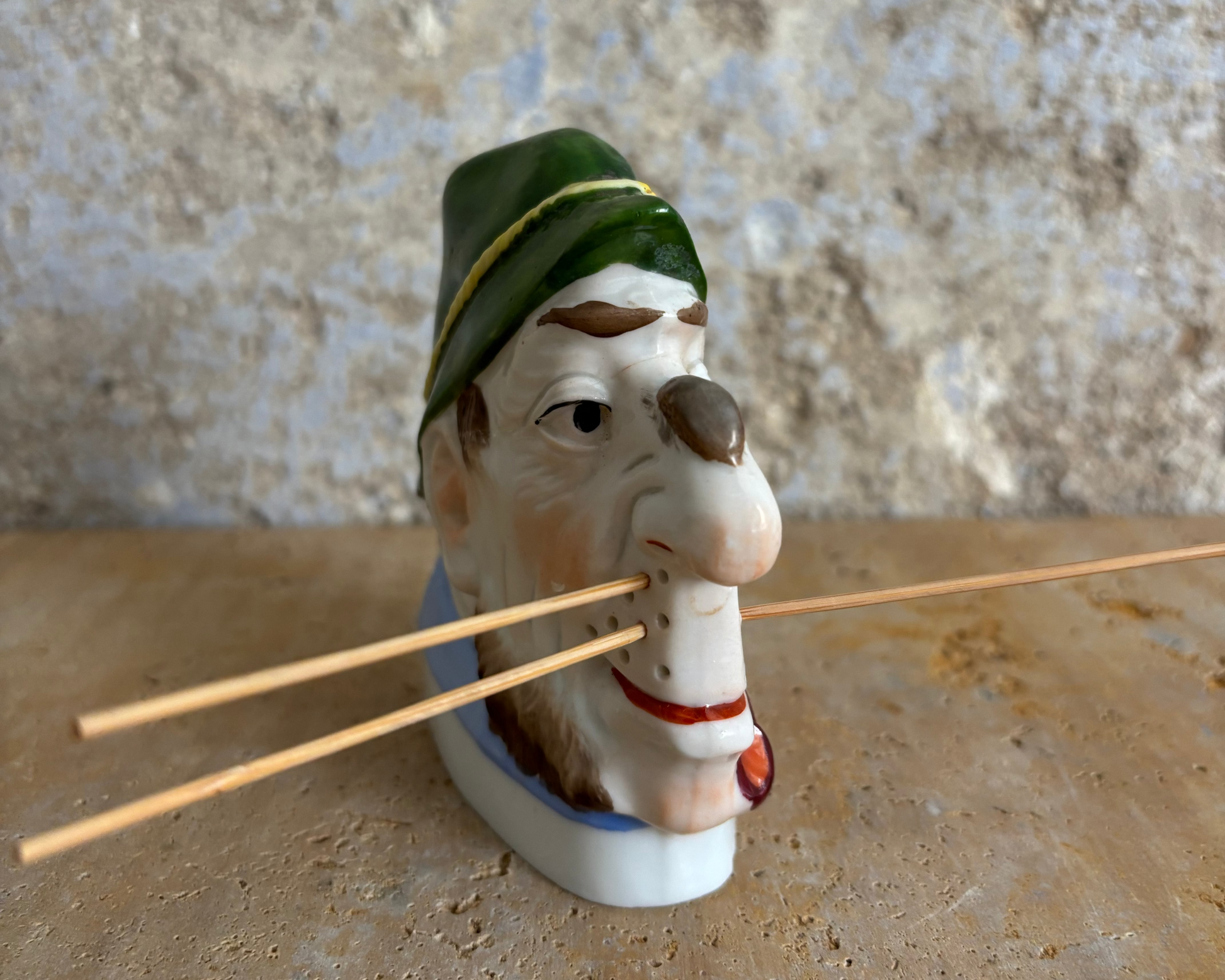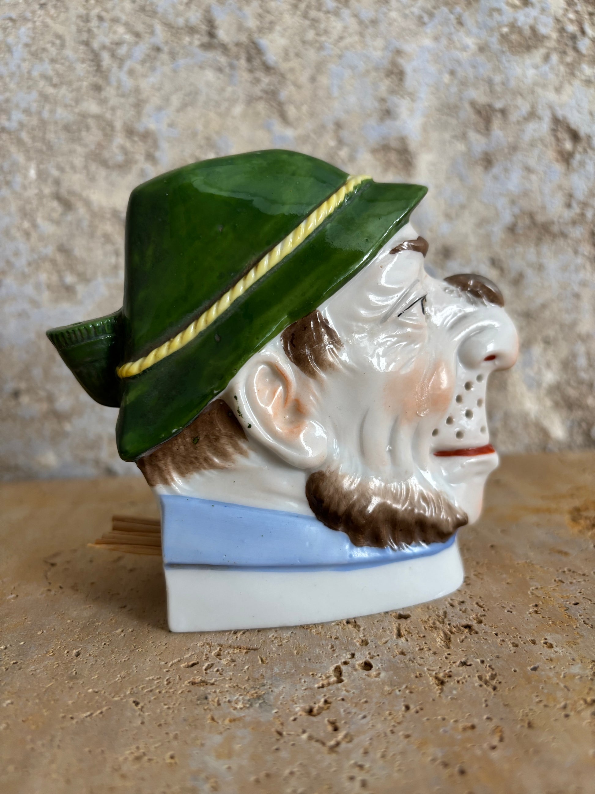 Antiguo palillero de porcelana, cabeza grotesca caricaturizada de un personaje Tiroles, mediados del siglo XIX.