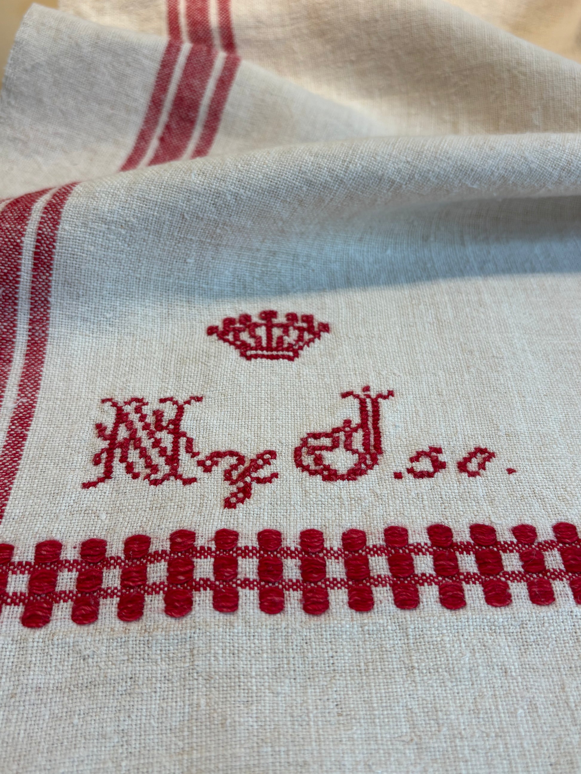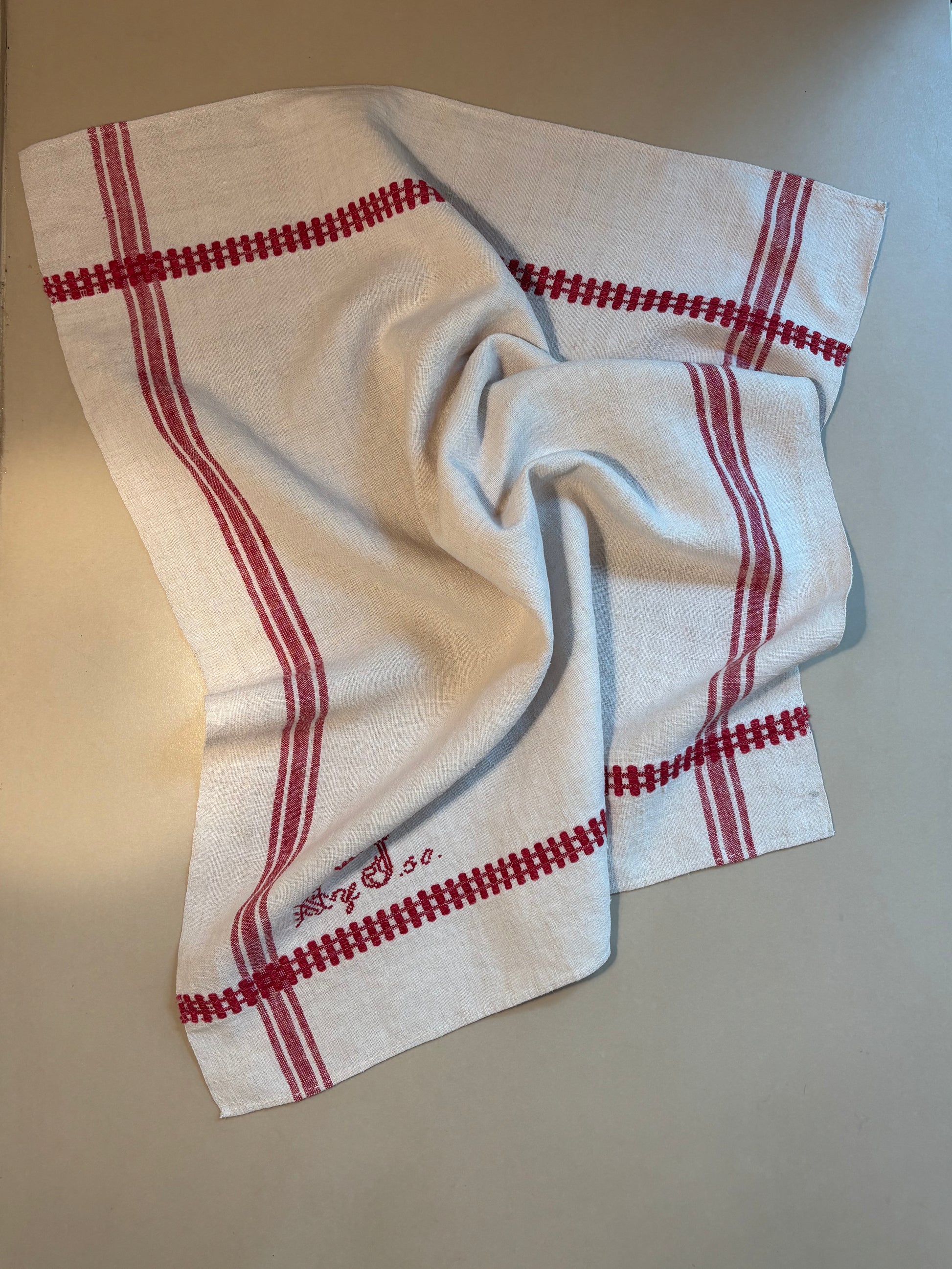 Paño de cocina de lino grueso antiguo. Hecho con telares de jacquard.