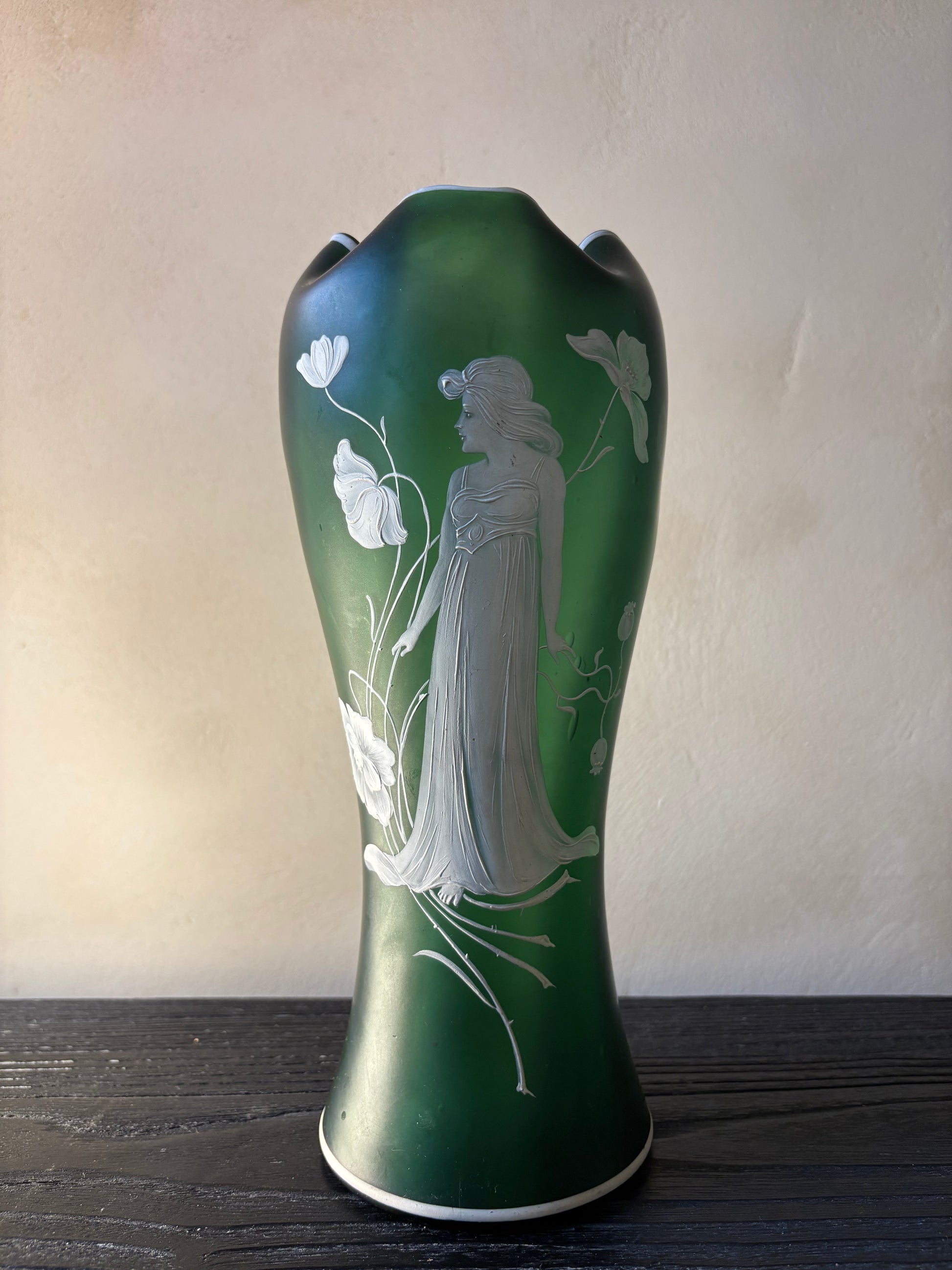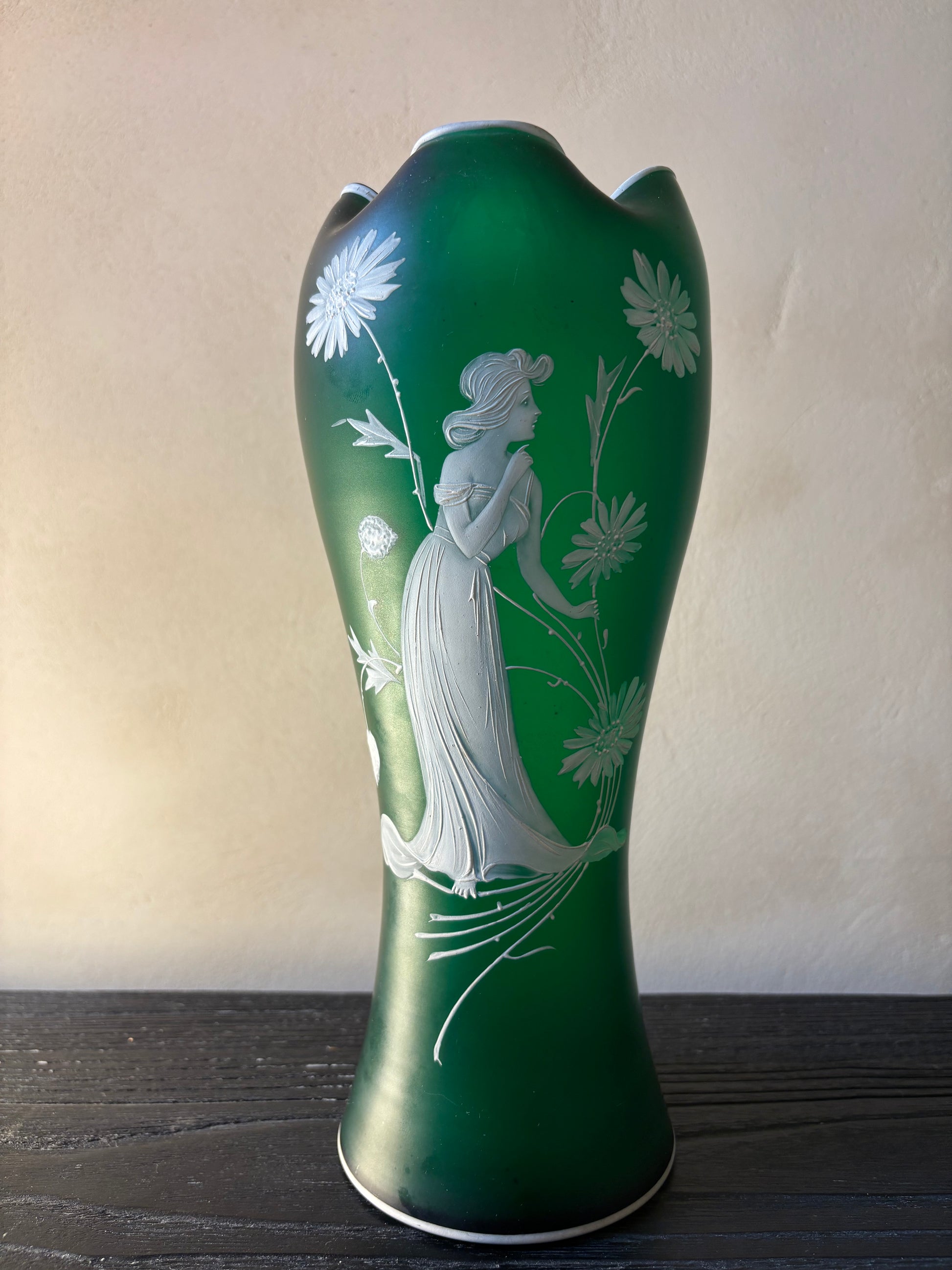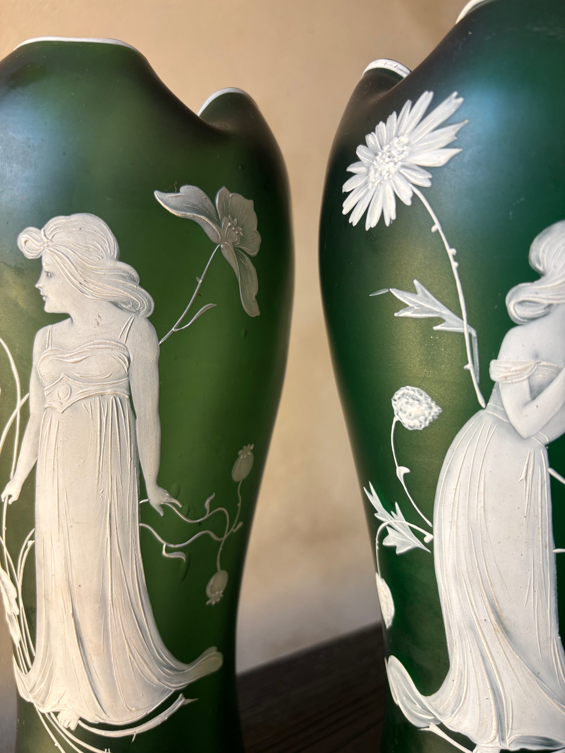 Elegante pareja de jarrones victorianos realizados en cristal satinado verde, datados en la segunda mitad del siglo XIX.