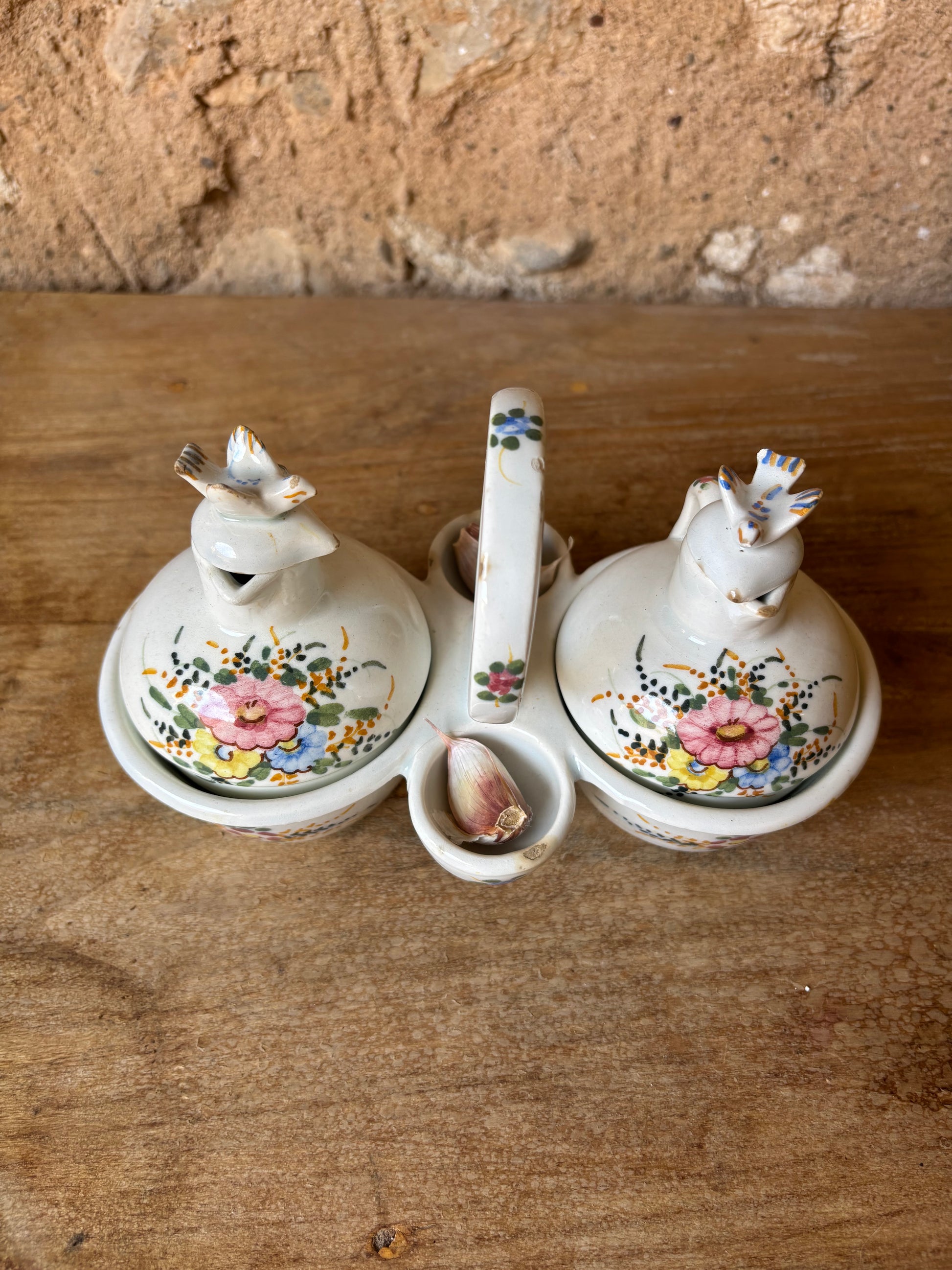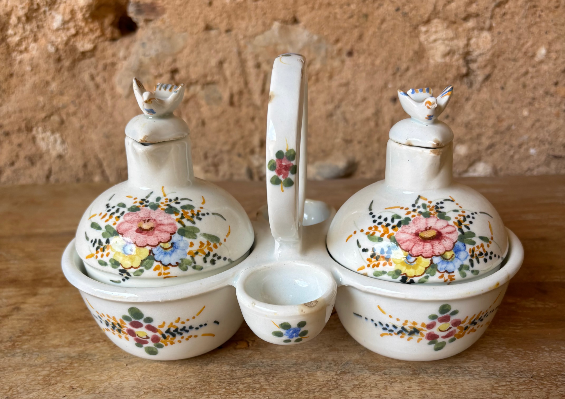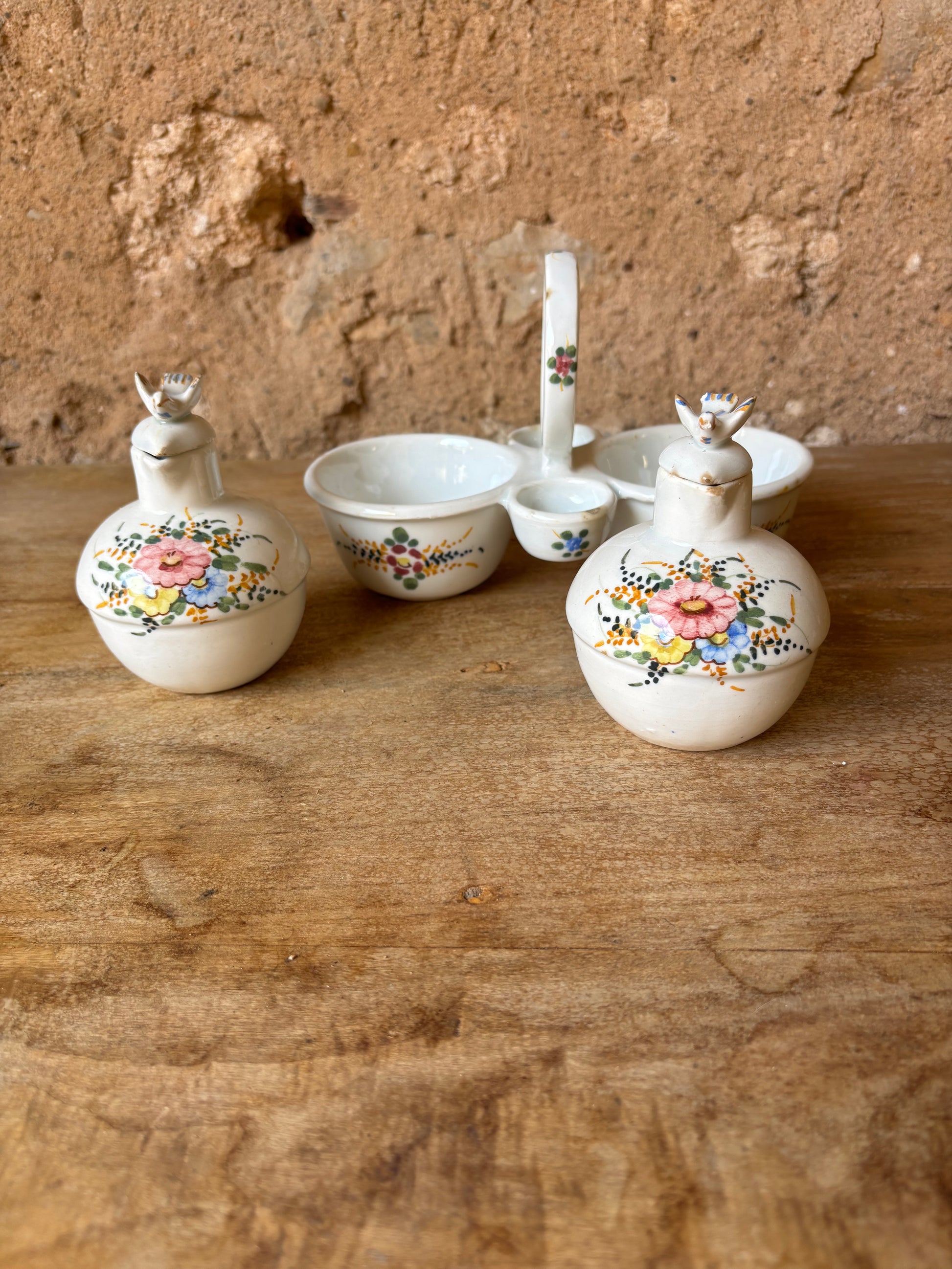 Conjunto de vinagreras de Manises, realizada en cerámica esmaltada y decoradas a mano con motivos florales. Se trata de una pieza artesanal que refleja la tradición cerámica valenciana.