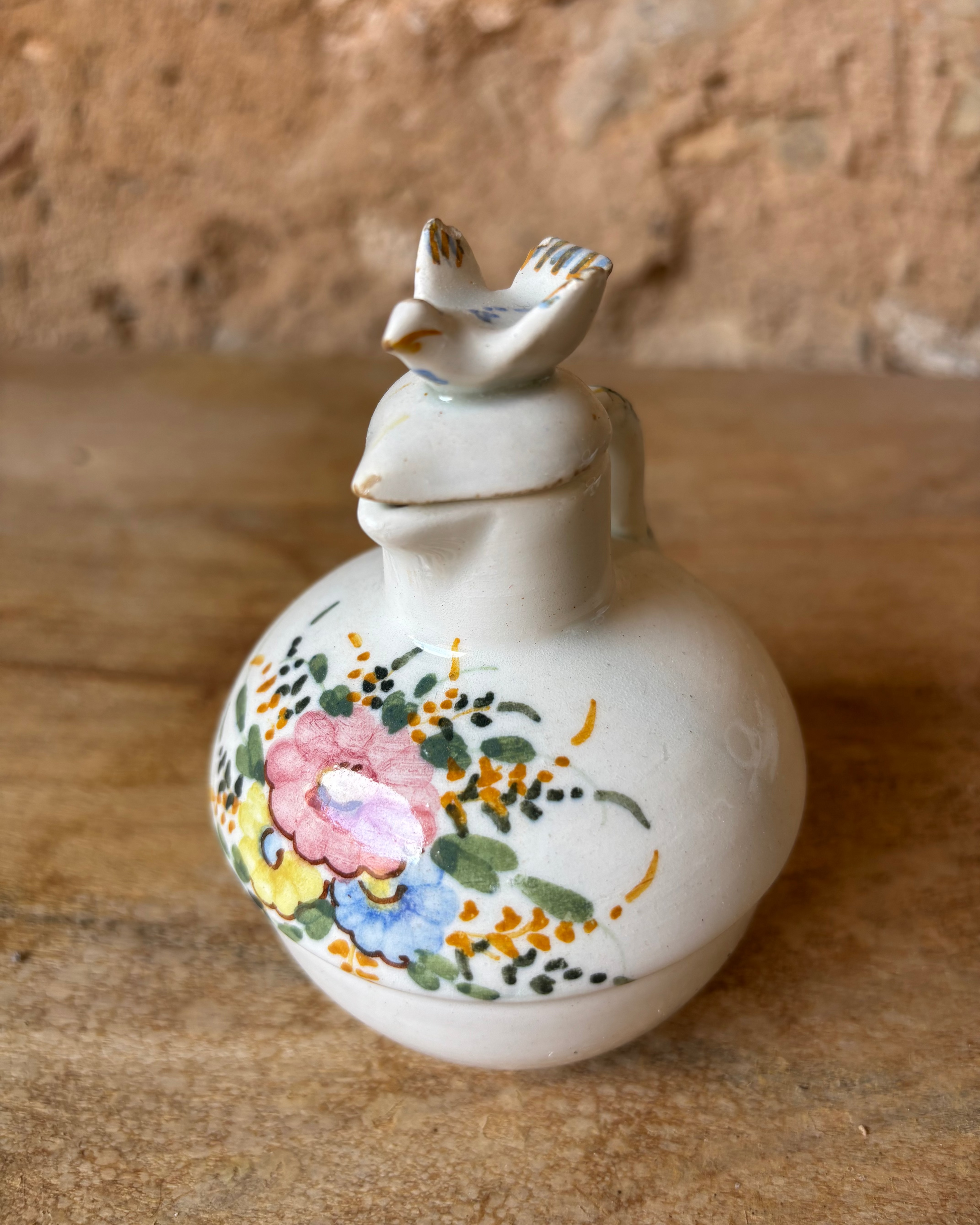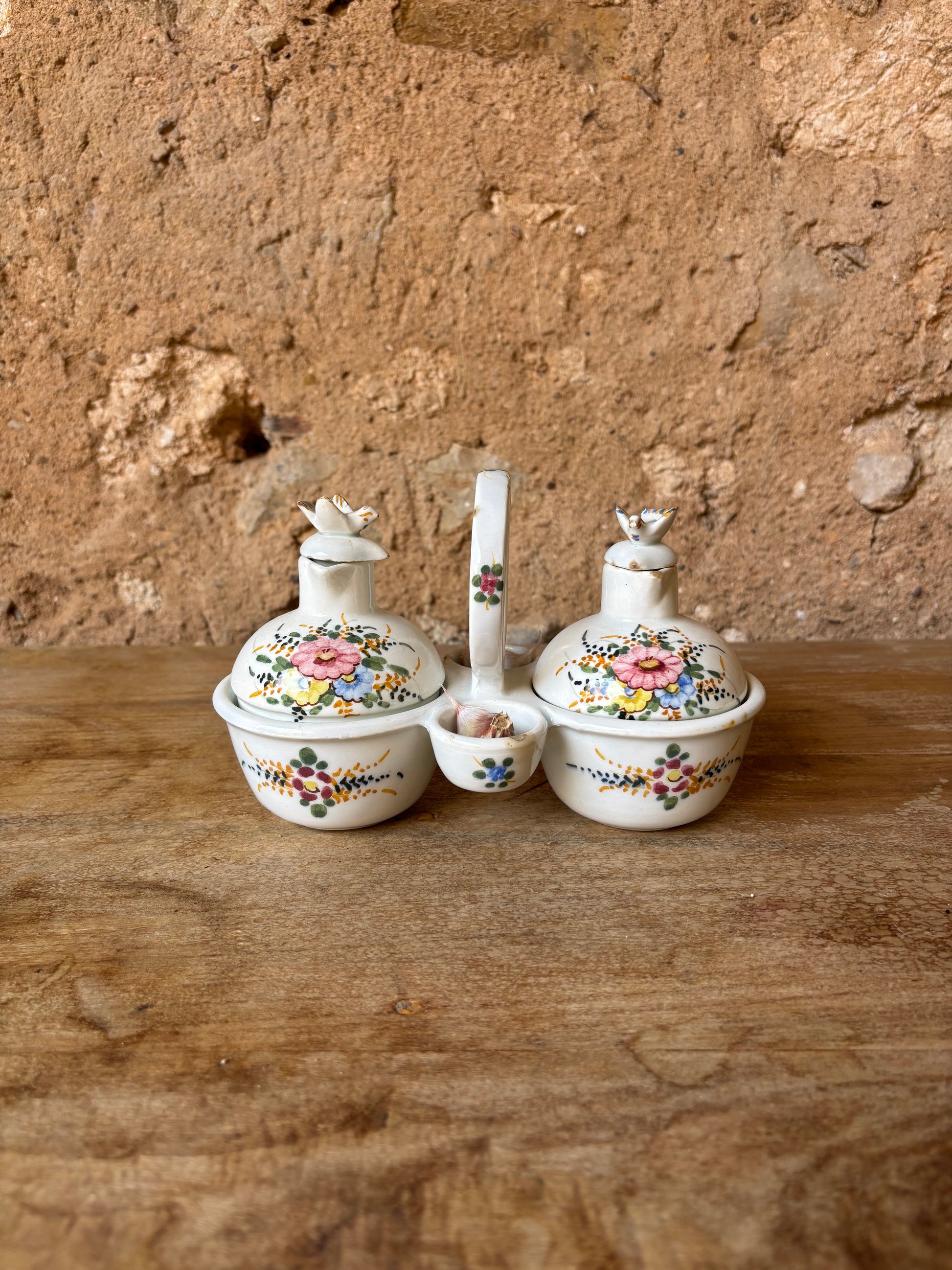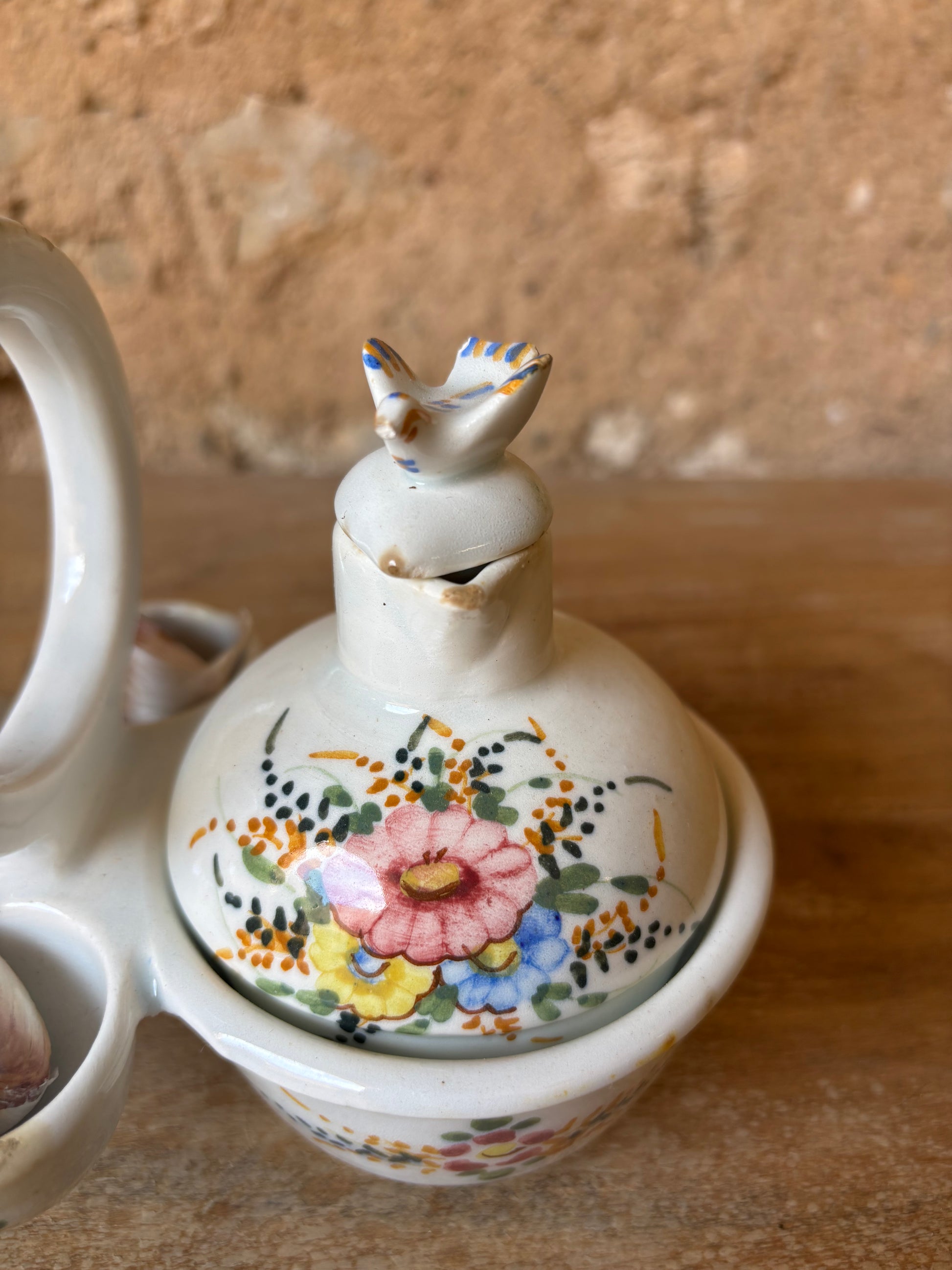 Conjunto de vinagreras de Manises, realizada en cerámica esmaltada y decoradas a mano con motivos florales. Se trata de una pieza artesanal que refleja la tradición cerámica valenciana.