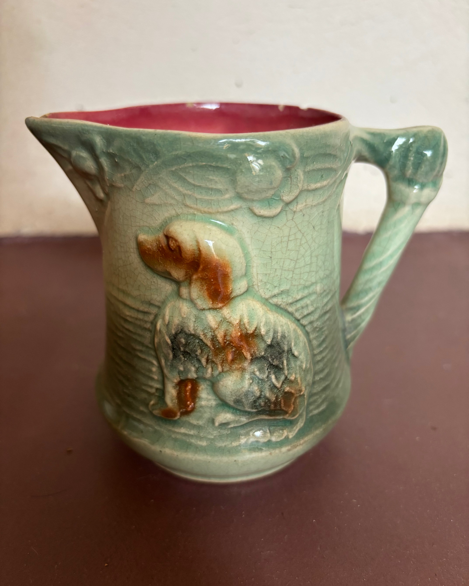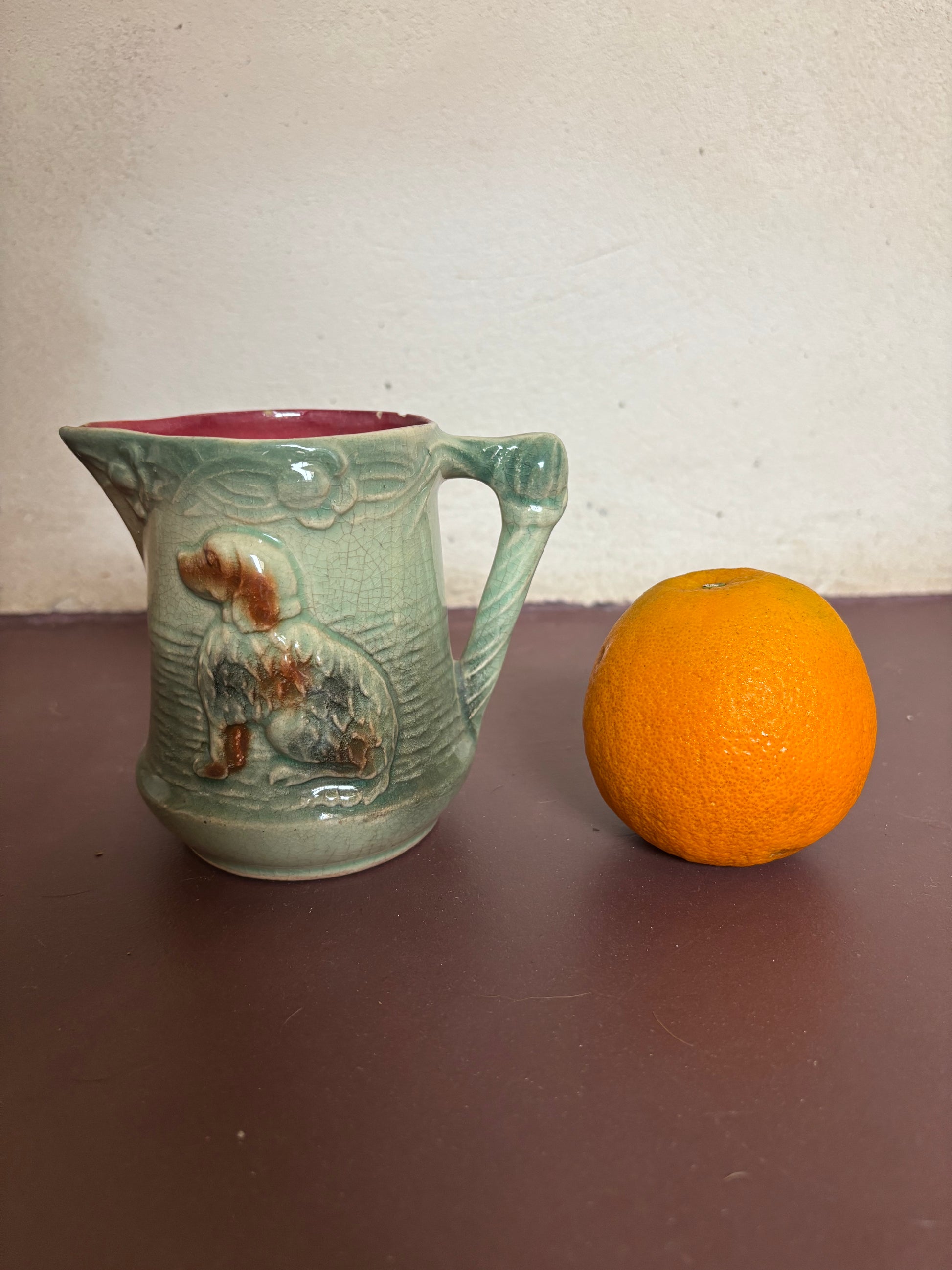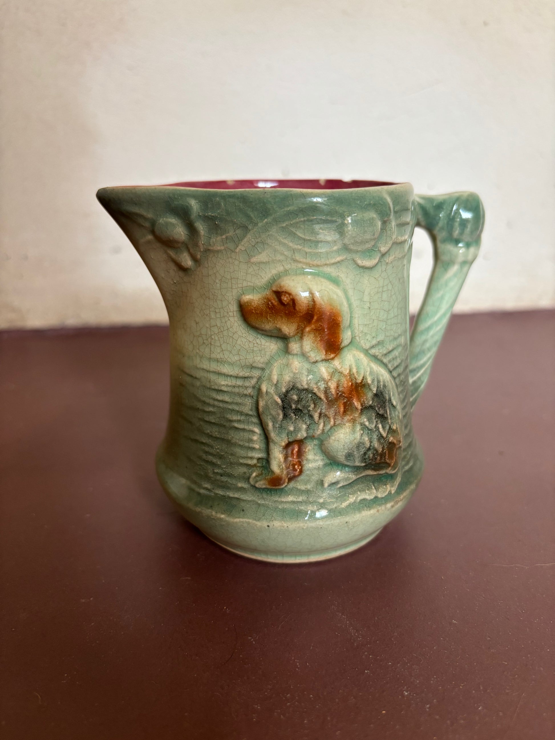 Pequeña jarra de loza esmaltada en técnica barbotine, decorada en relieve con la figura de un perro de caza.