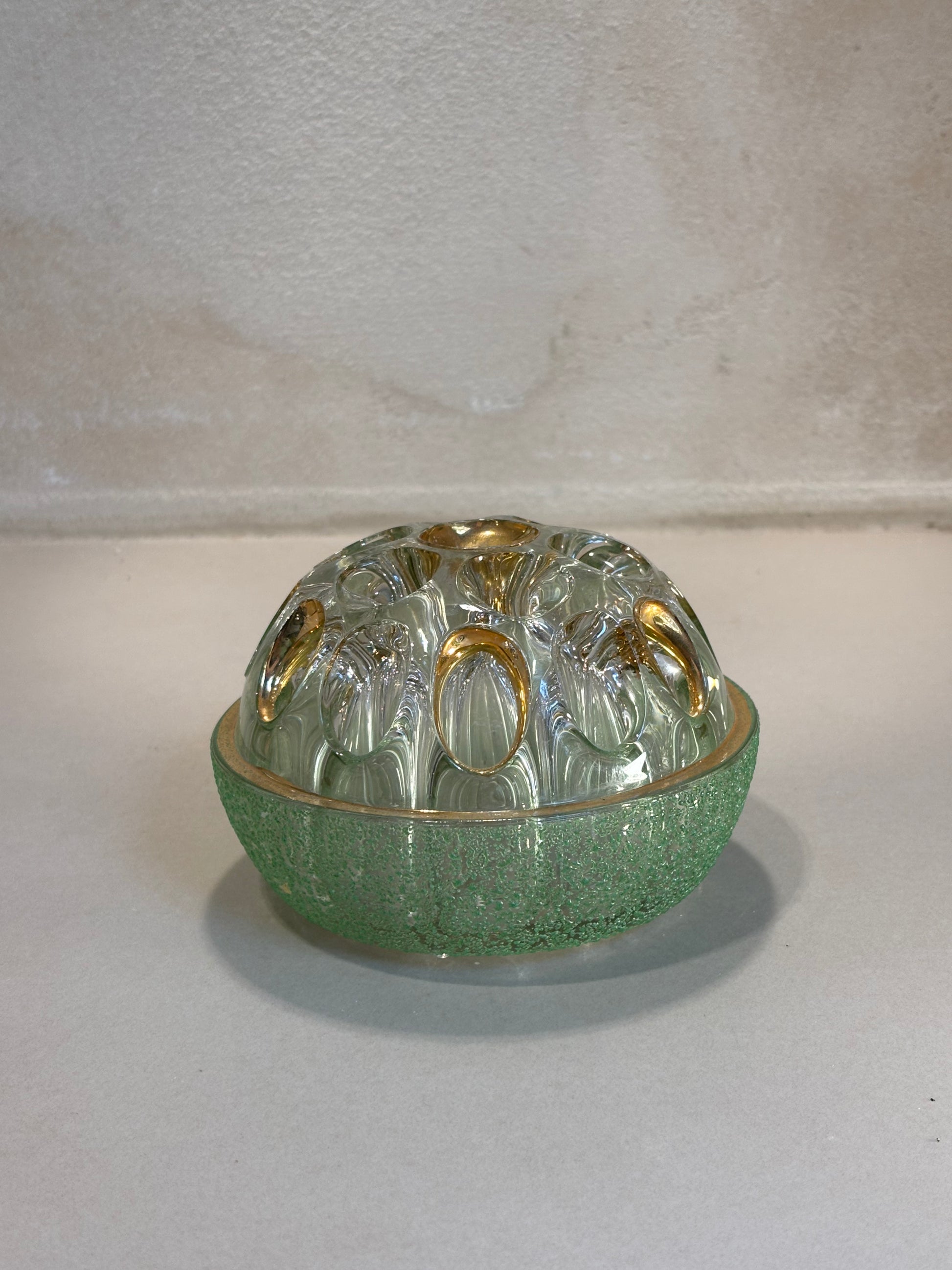 Pique-fleur de vidrio transparente, trabajado en su base con pequeñas hendiduras y pintado en color verde y pinceladas en dorado. En su origen este objeto fue diseñado para insertar las plumas estilográficas.