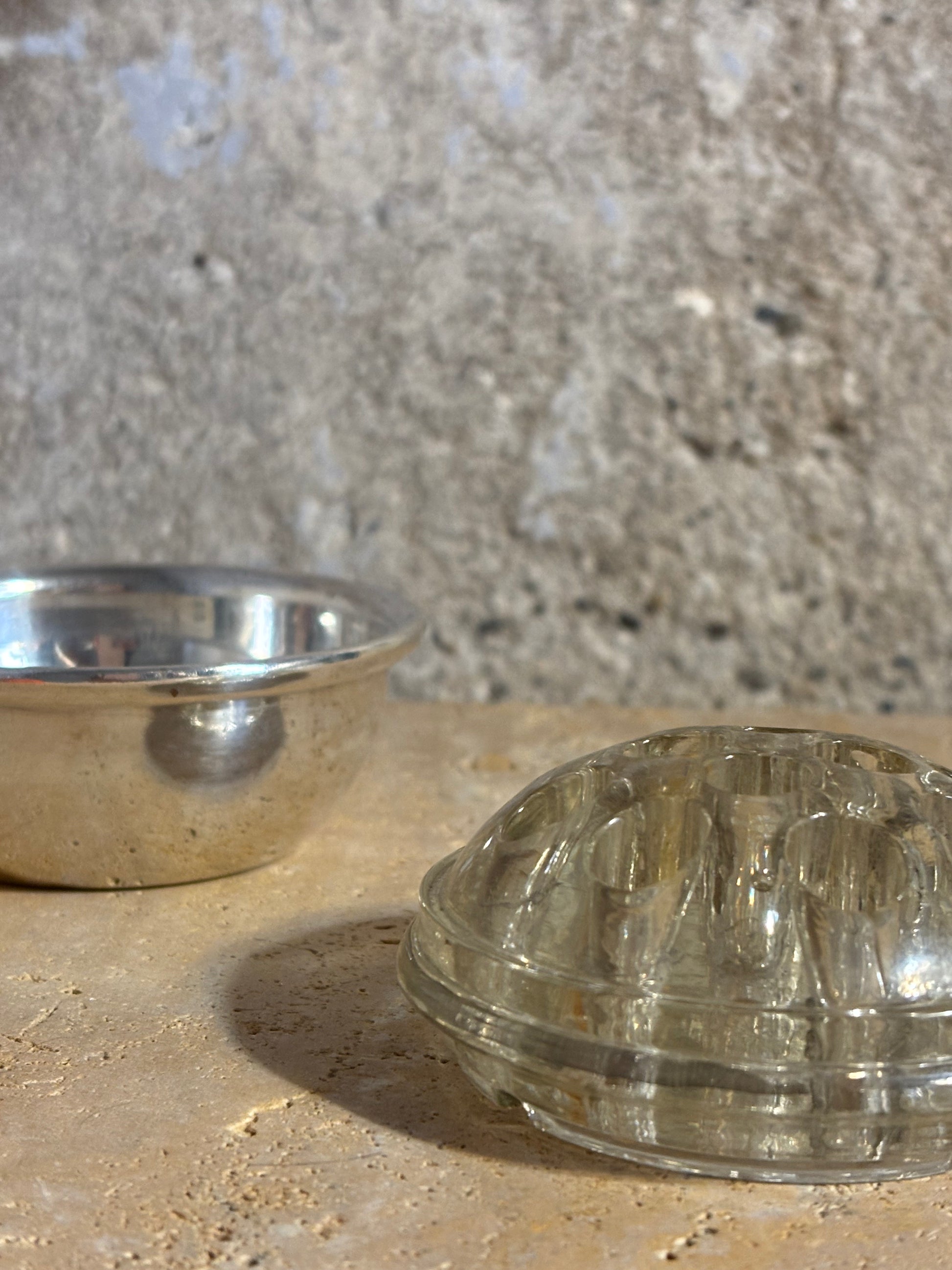 Pique-fleur ingles de vidrio transparente y cuenco en plata.En su origen este objeto fue diseñado para insertar las plumas estilográficas. El cuenco de plata esta marcado de orfebrería HIL 82. F38.