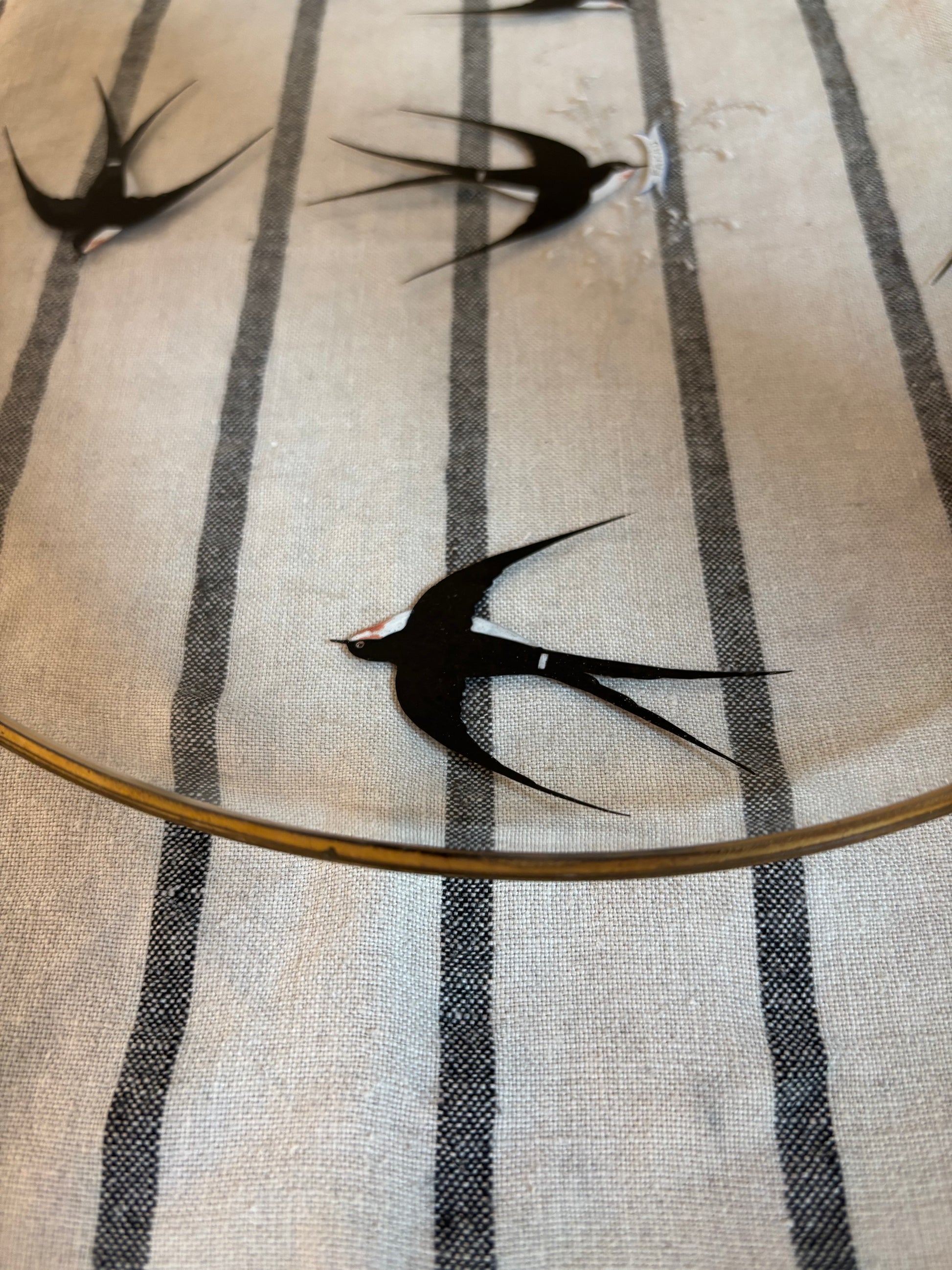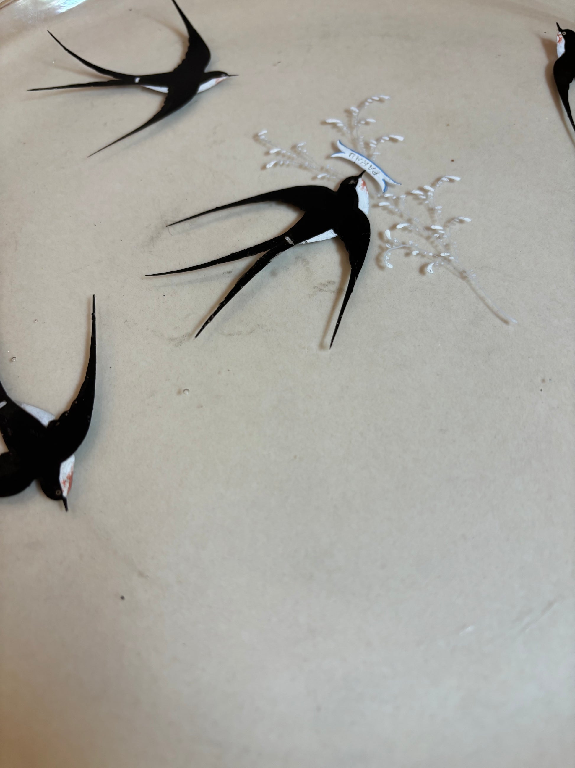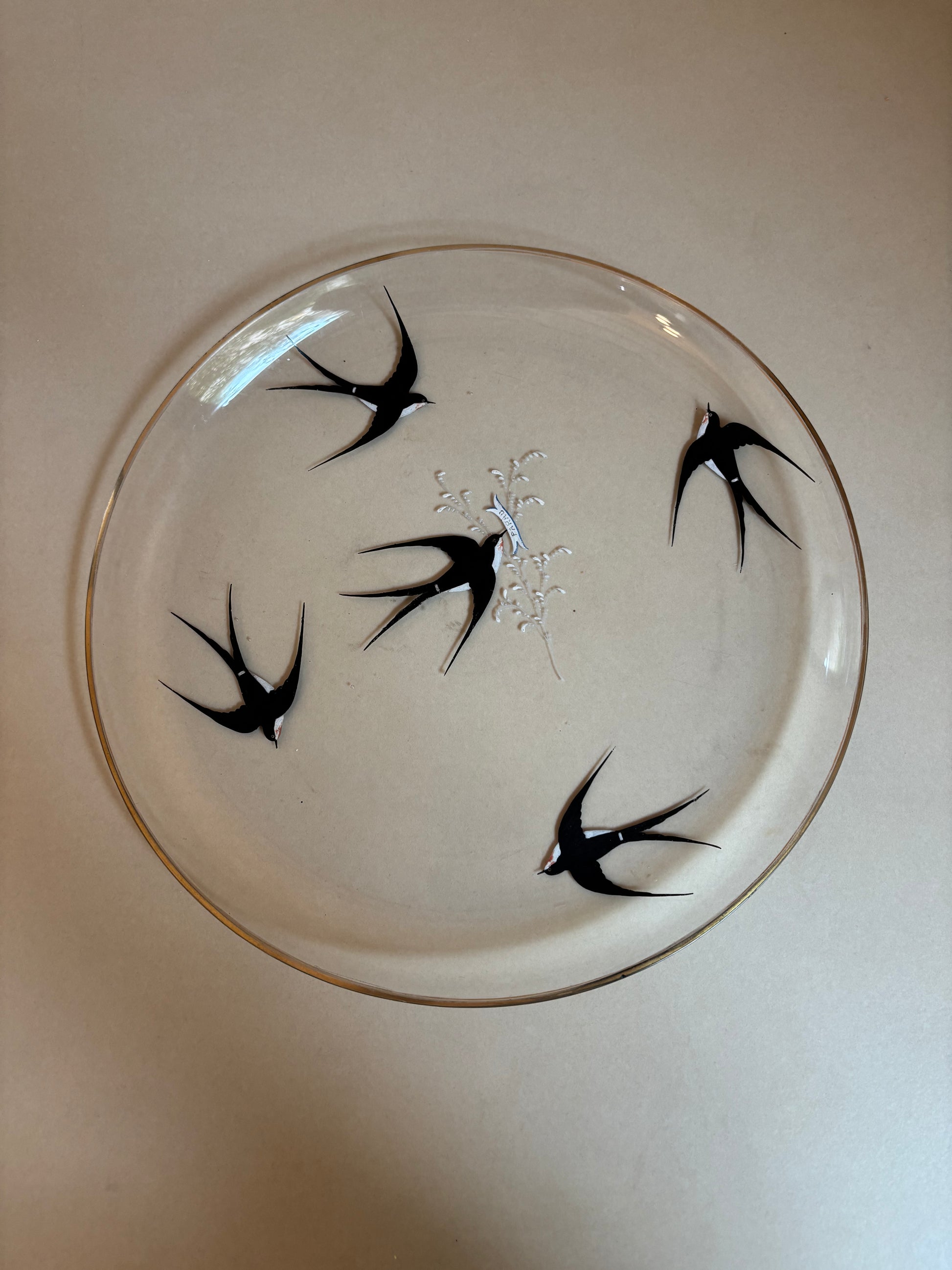 Plato-fuente de cristal artesanal, elaborado a mano en Hungría, una pieza única vintage. Destaca por las golondrinas pintadas a mano, acompañadas de un perfil en oro fino.