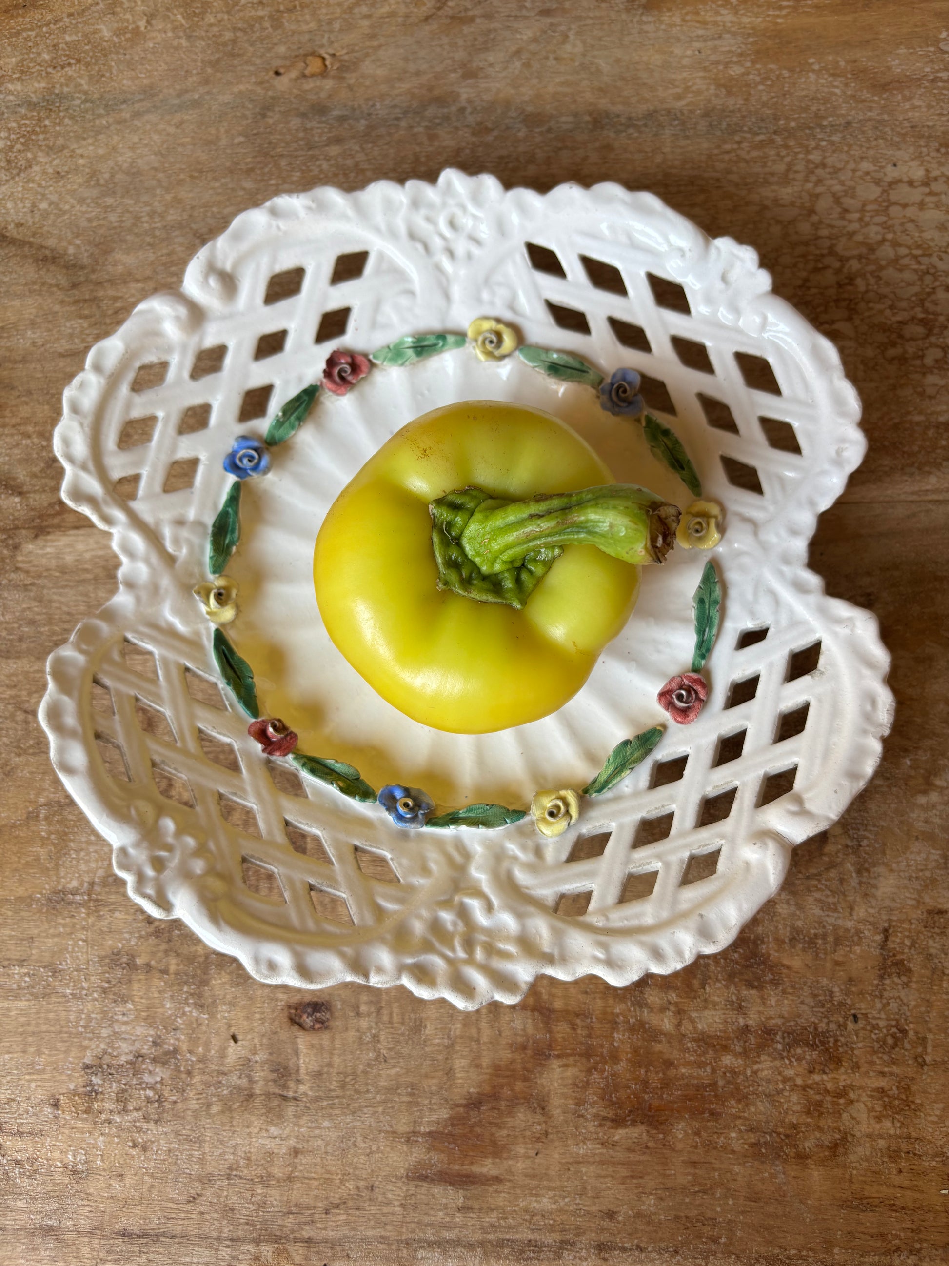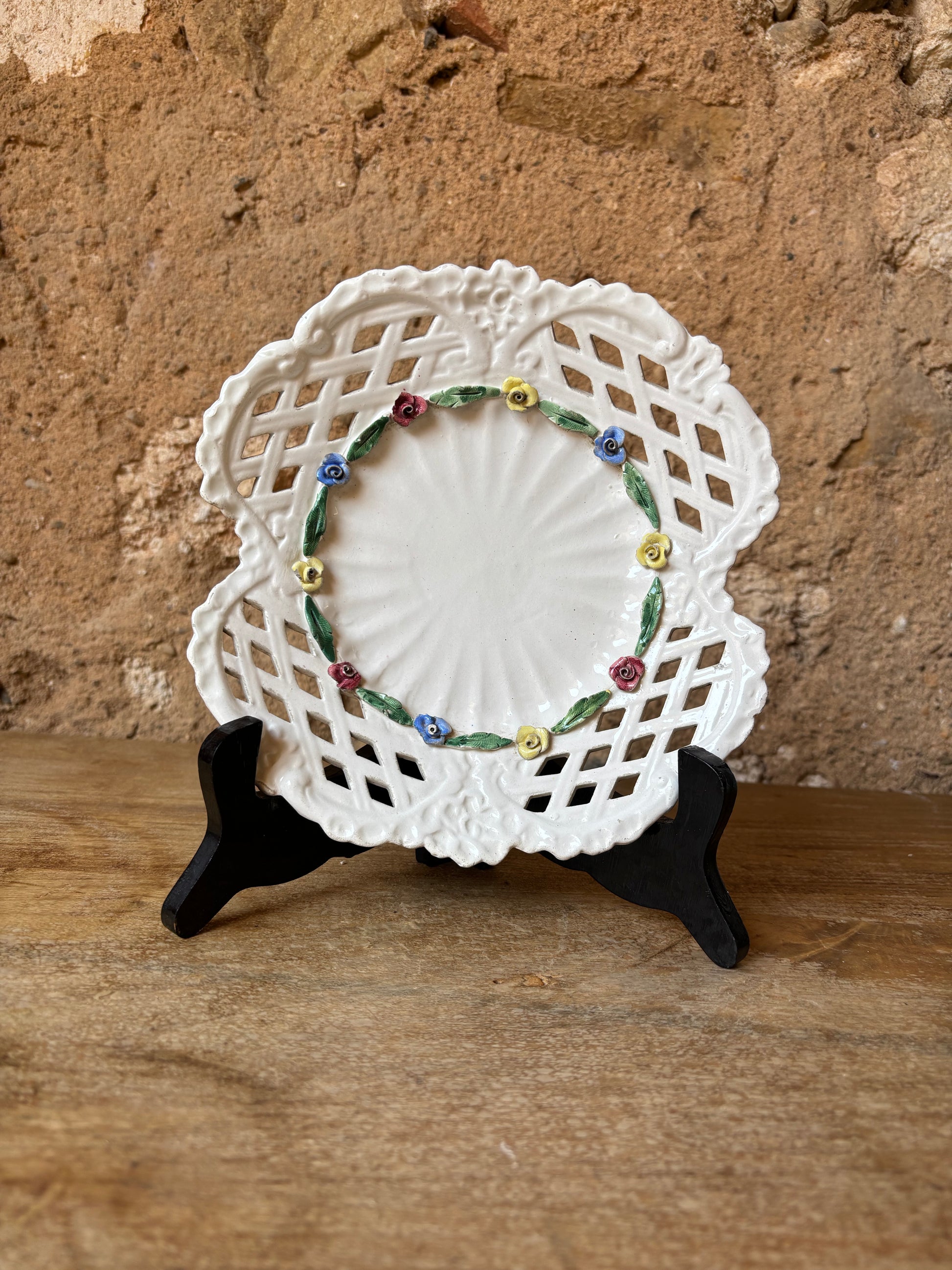 Plato antiguo de mayólica con flores y hojas en relieve coronando el centro, pintado a mano. El reborde del plato perforado.