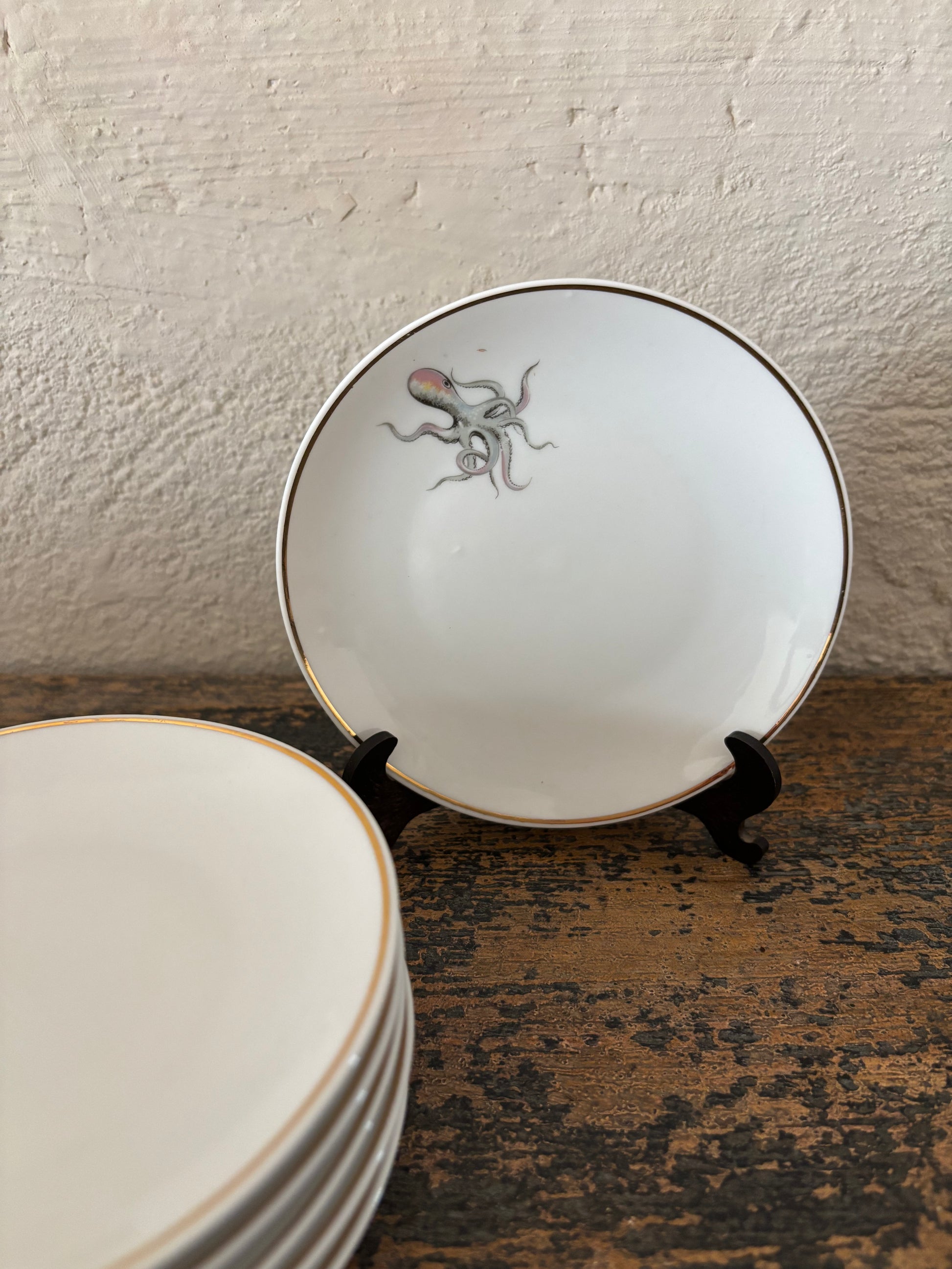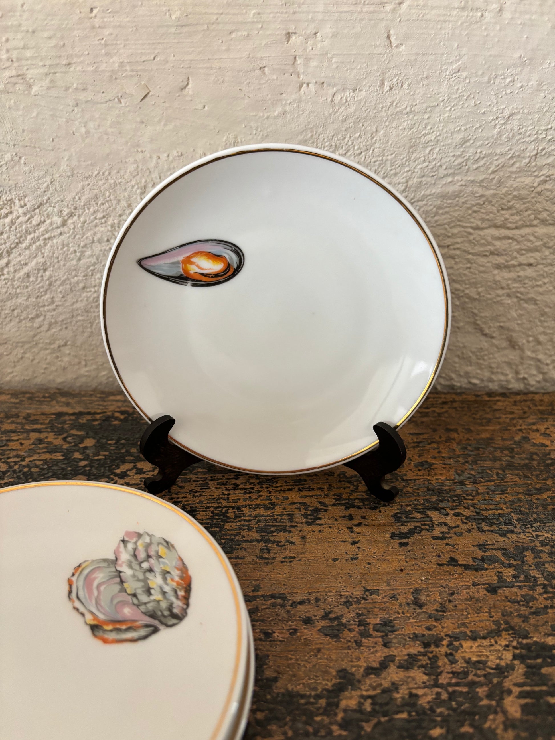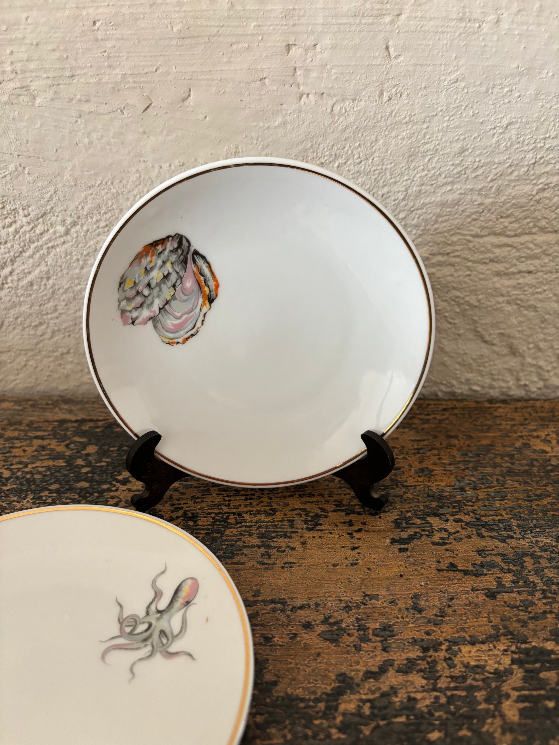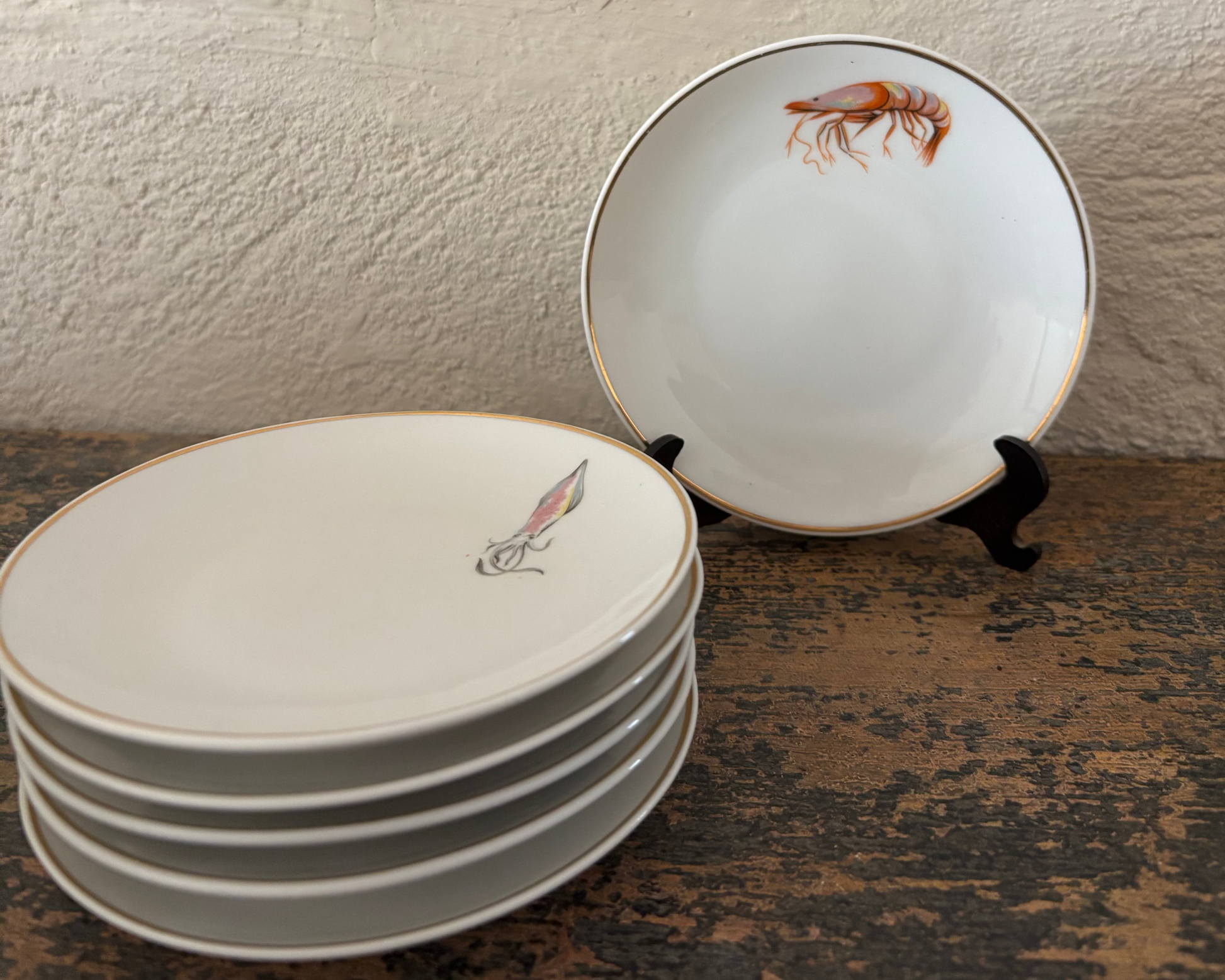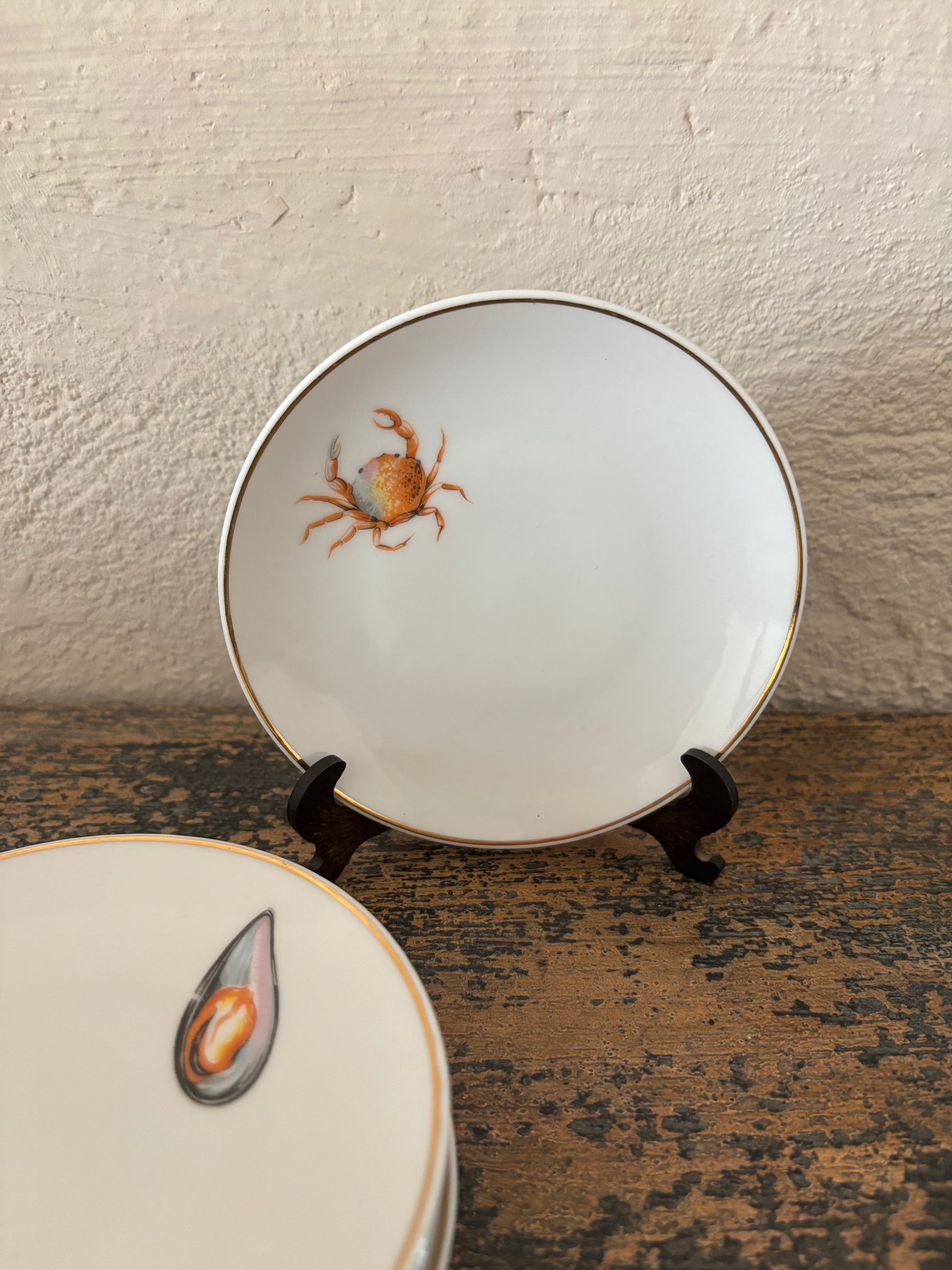 Conjunto de 6 platos de pan en porcelana española, decorados con distintos motivos de mariscos pintados a mano y rematados con un hilo dorado en el borde.