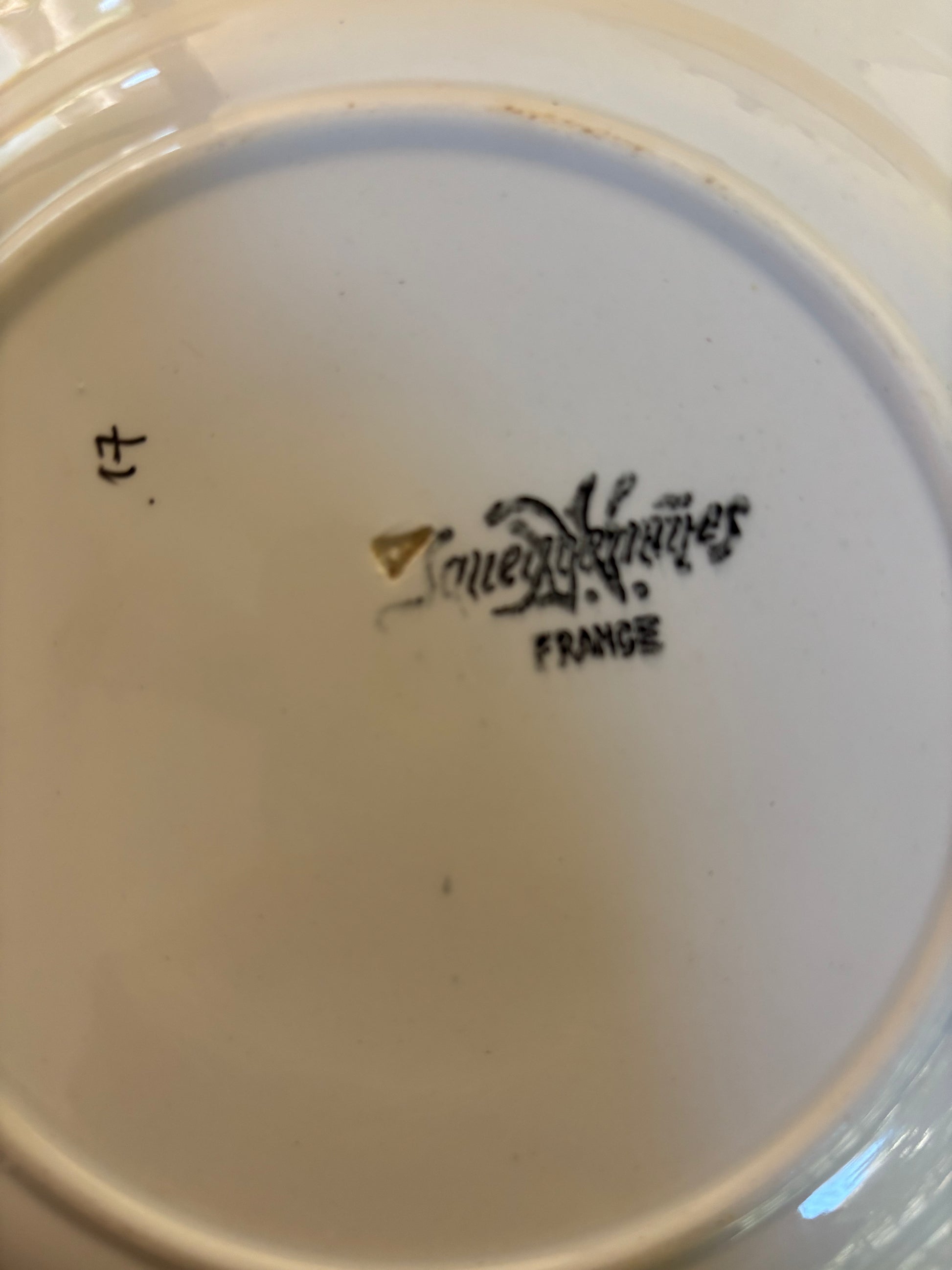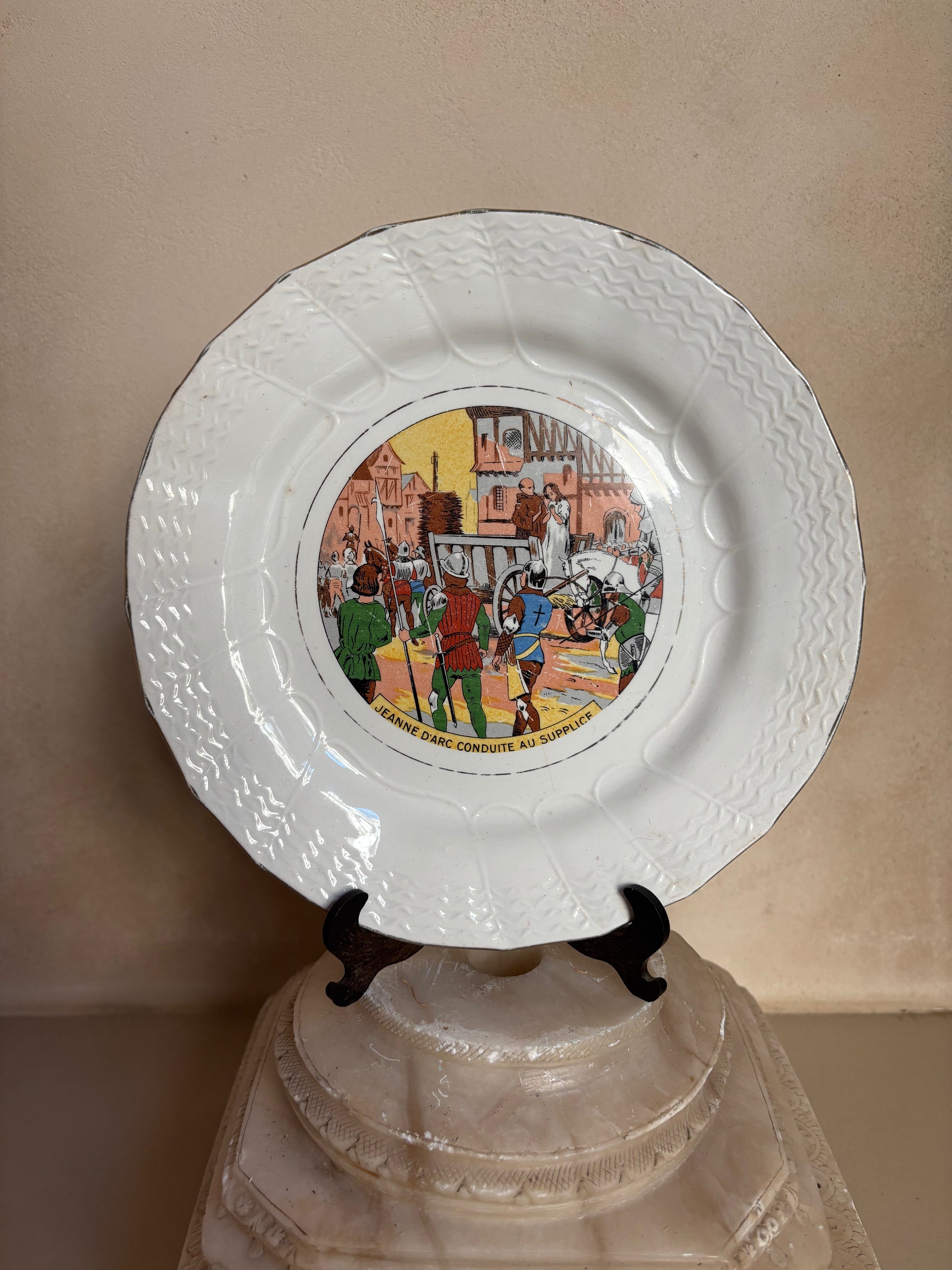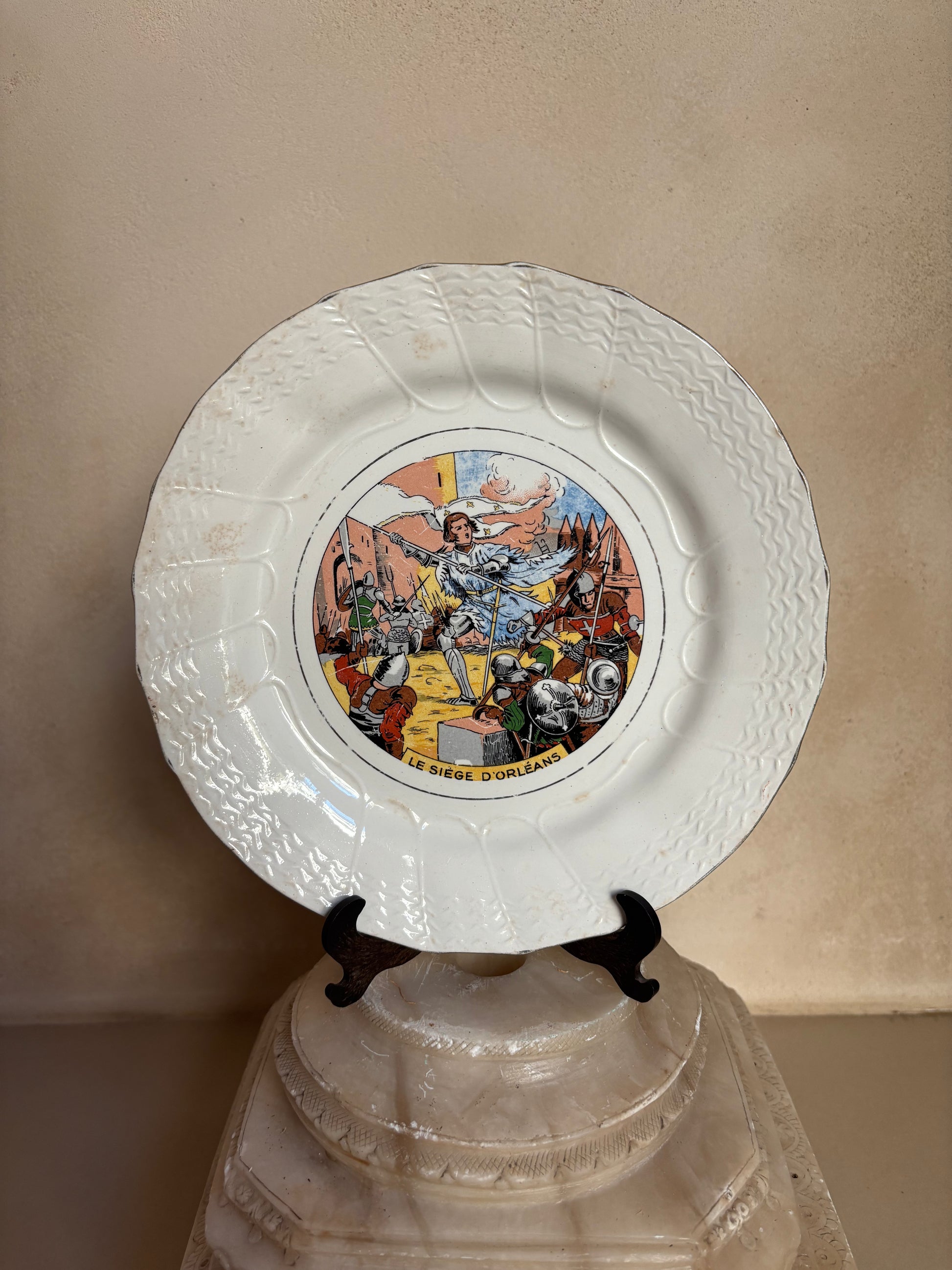5 platos parlantes, en porcelana con sello SARREGUEMINES, Francia, de la colección Juana de Arco.
