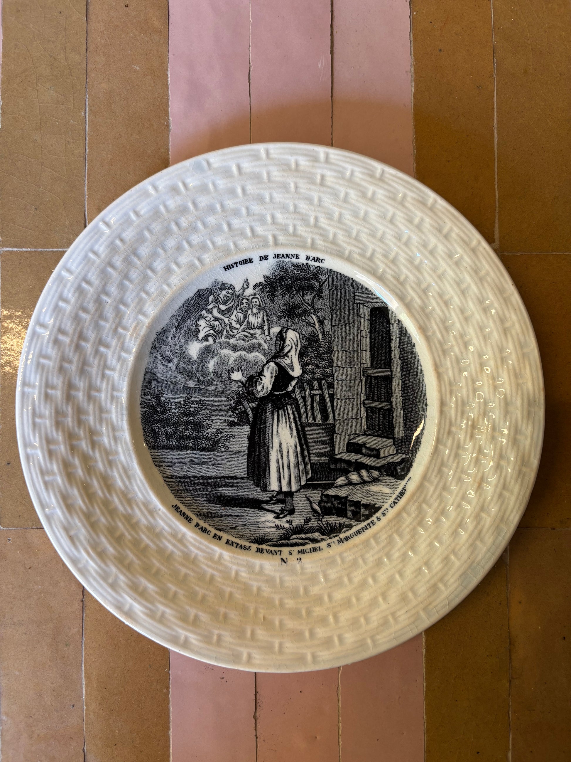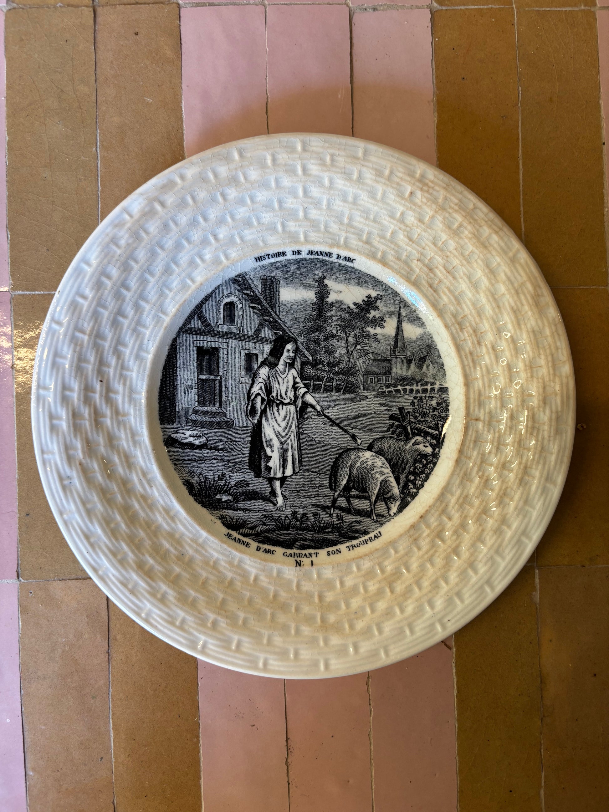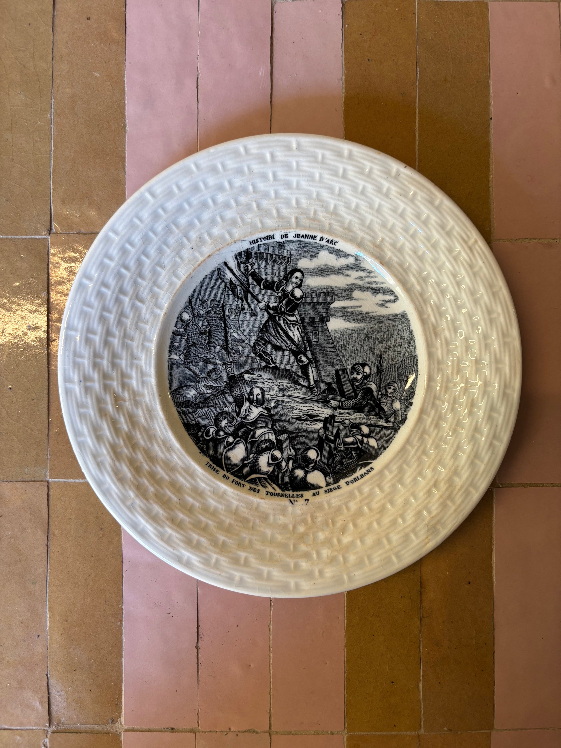 Colección completa de 12 platos parlantes de la serie Juana de Arco. Hecho en Terre de Fer, de la casa Sarreguemines, Francia.