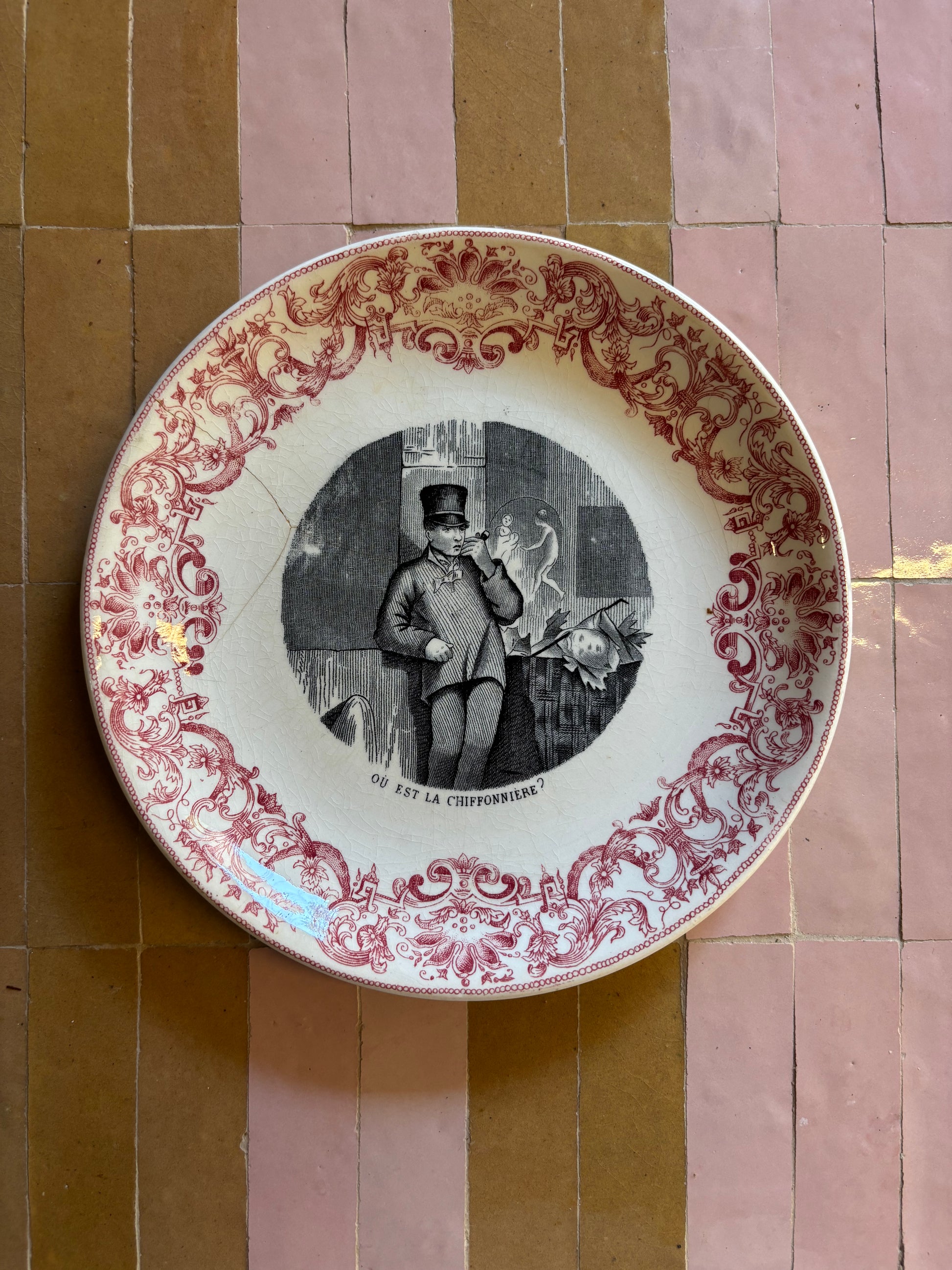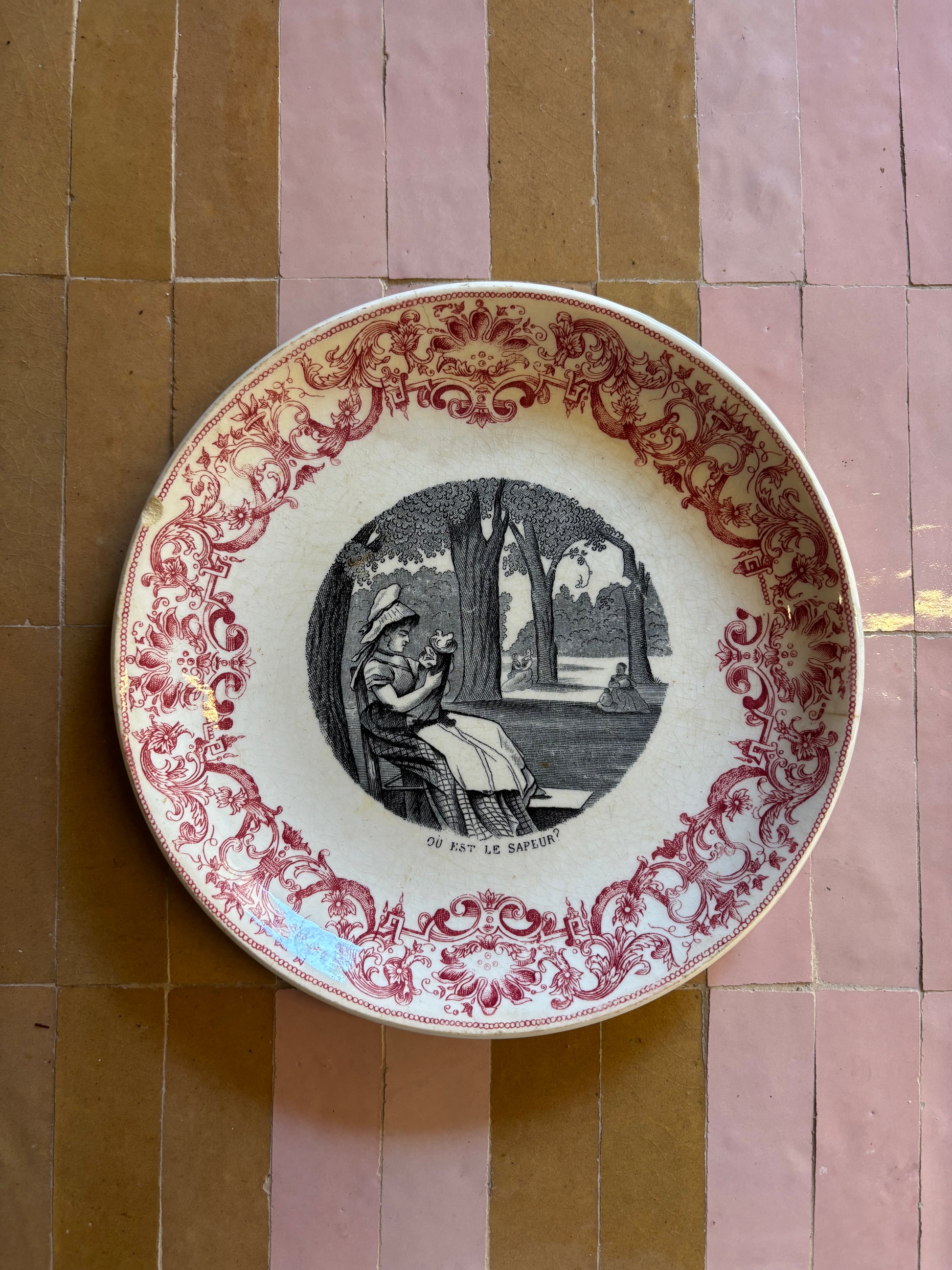 Cada plato representa una ilustración en blanco y negro con borde rojo y decoración floral, típica del estilo del siglo XIX, acompañada de una divertida y original leyenda.