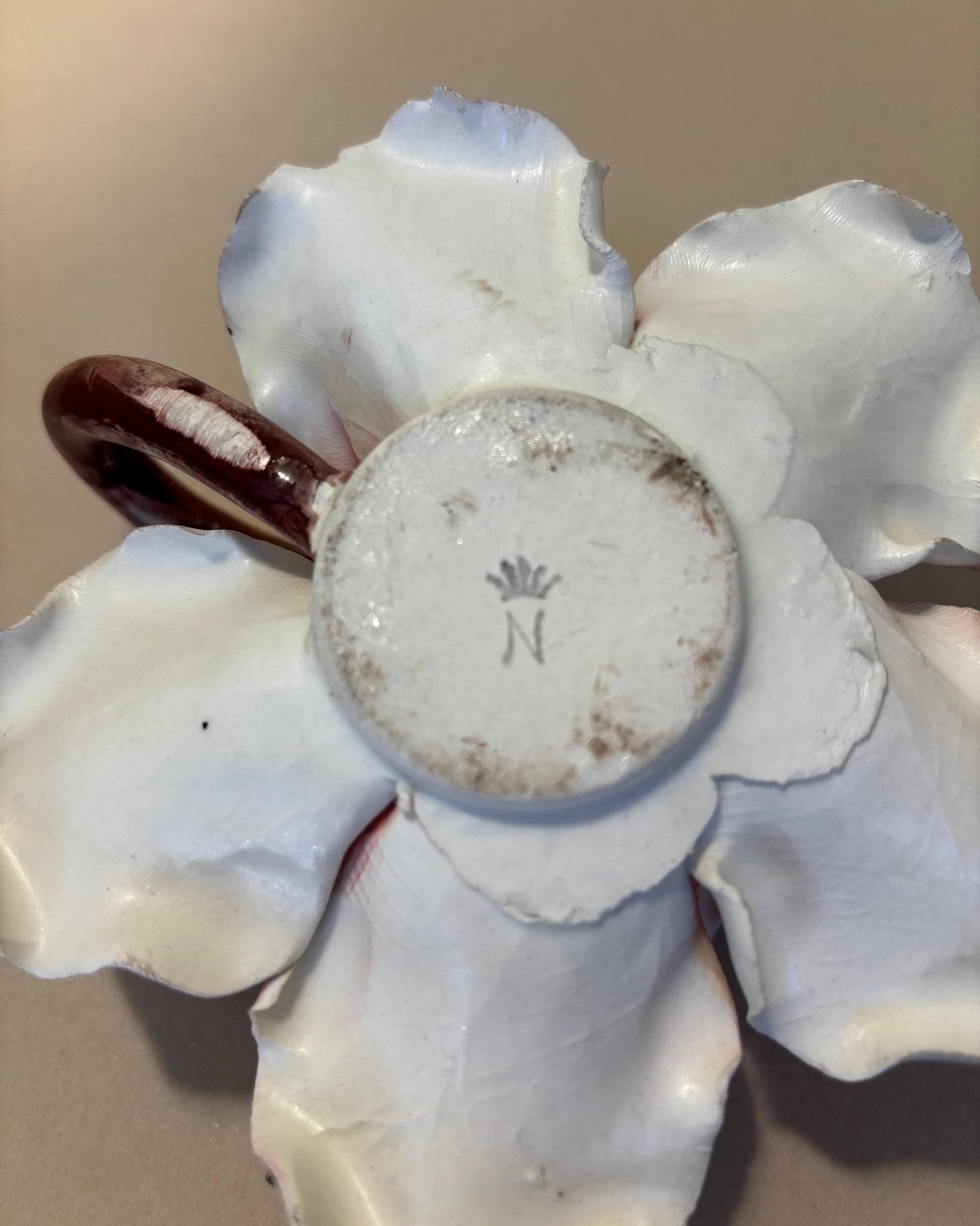 Delicado porta velas vintage de porcelana de Capodimonte realizado con la maestría característica de esta legendaria fabricación italiana. Elaborada manualmente pétalo por pétalo igual que su pintura.