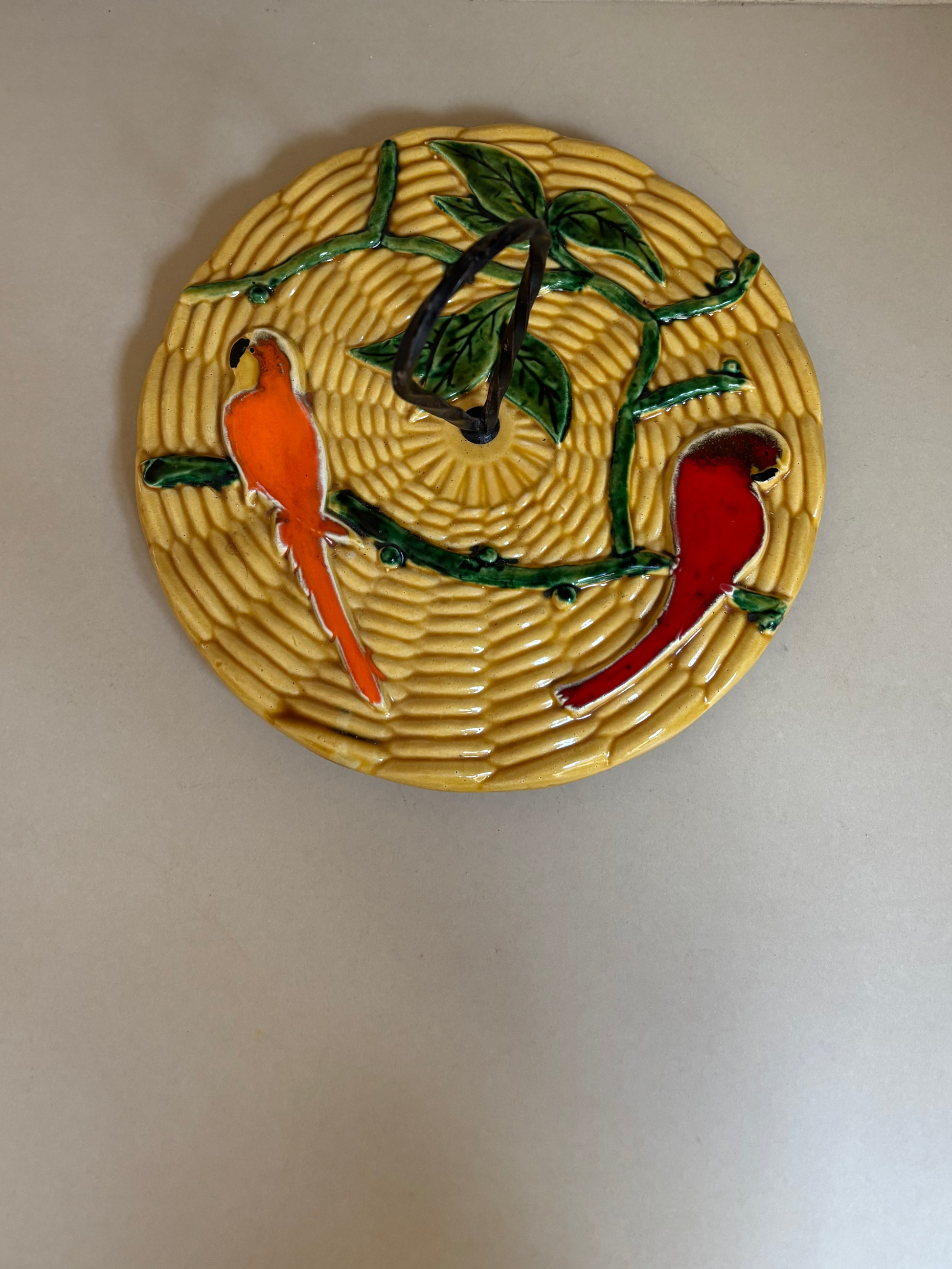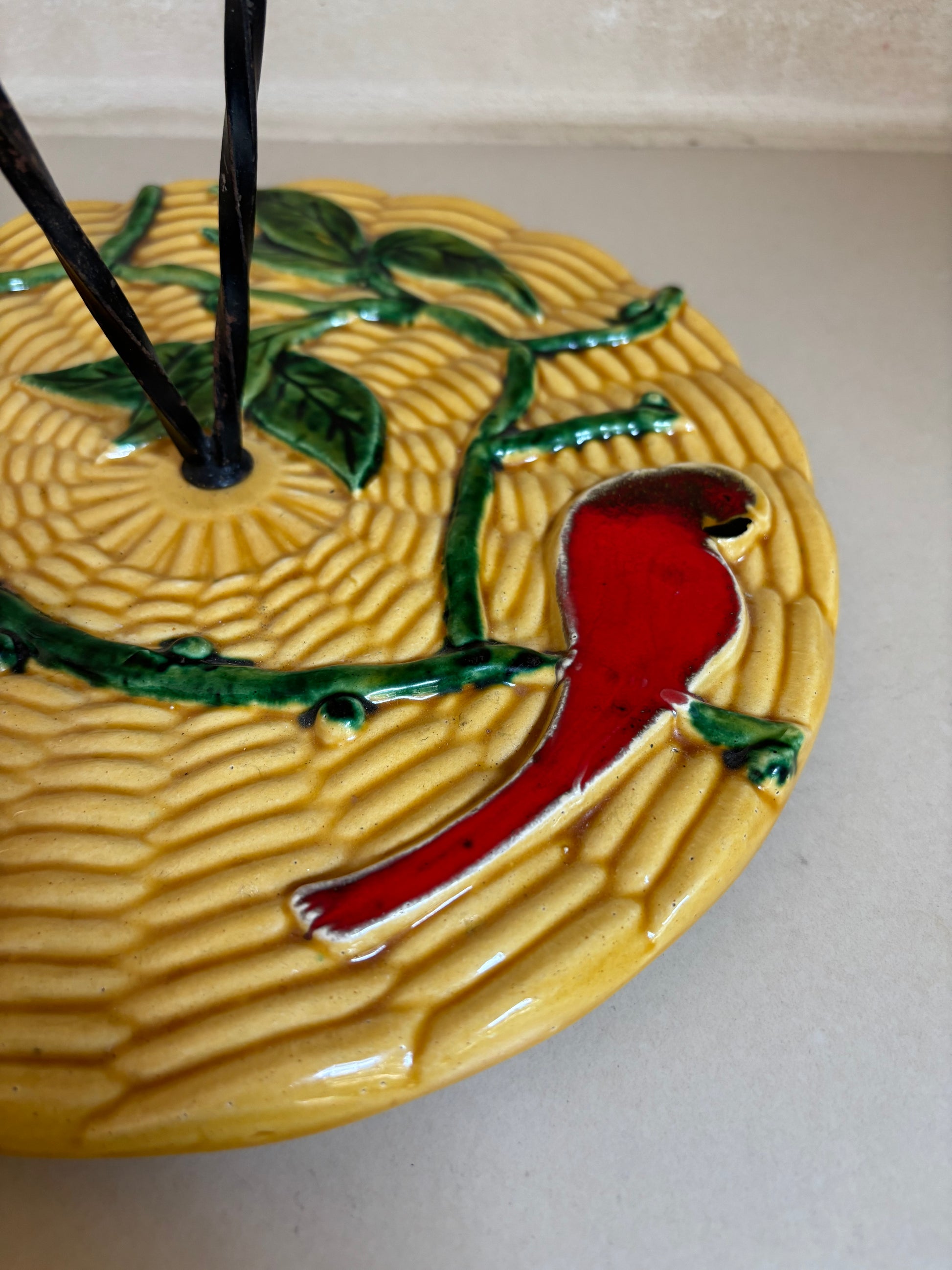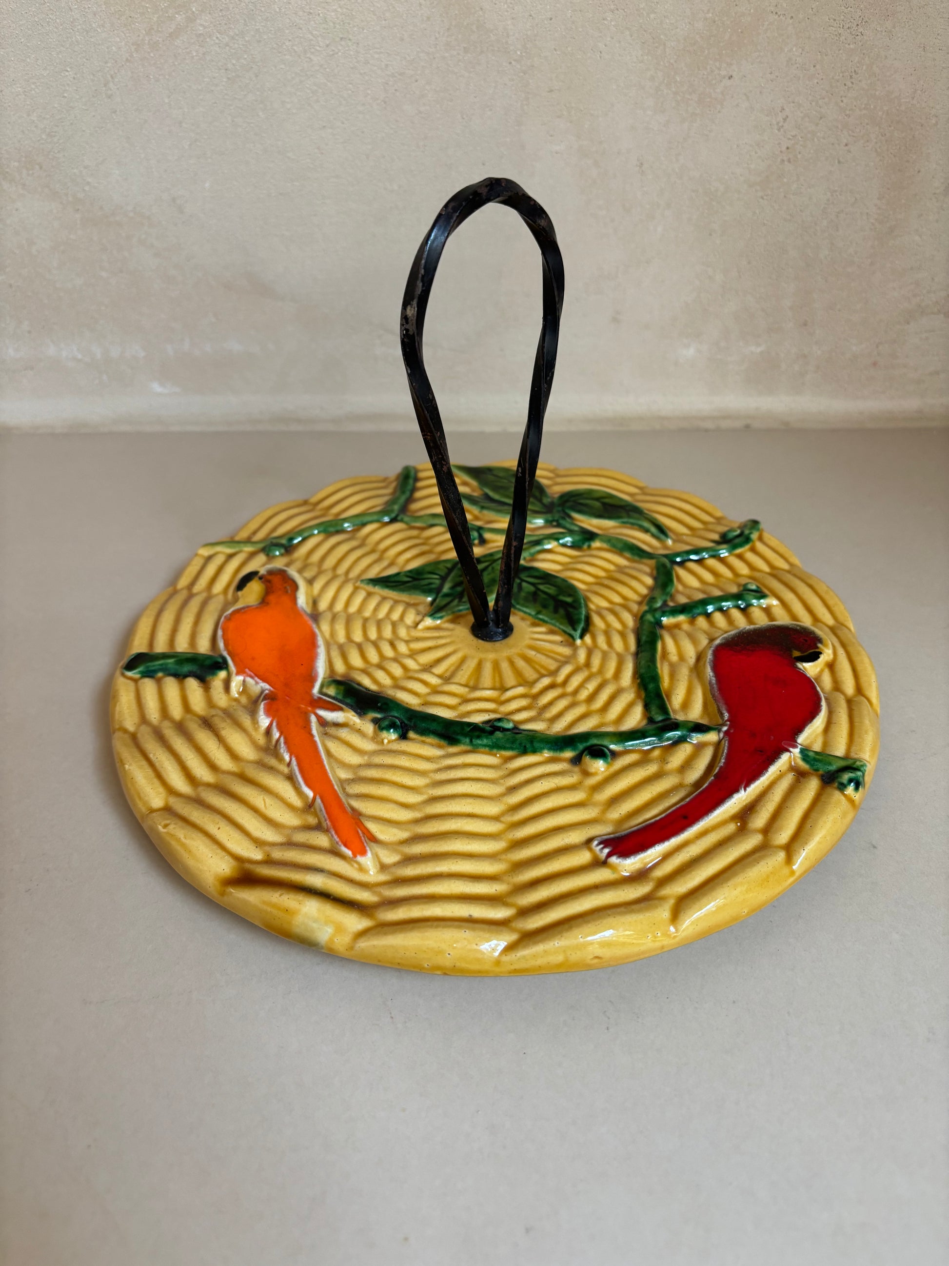 Quesera vintage en barbotine y asa de hierro forjado, motivos de ramas y pájaros, pintados a mano.