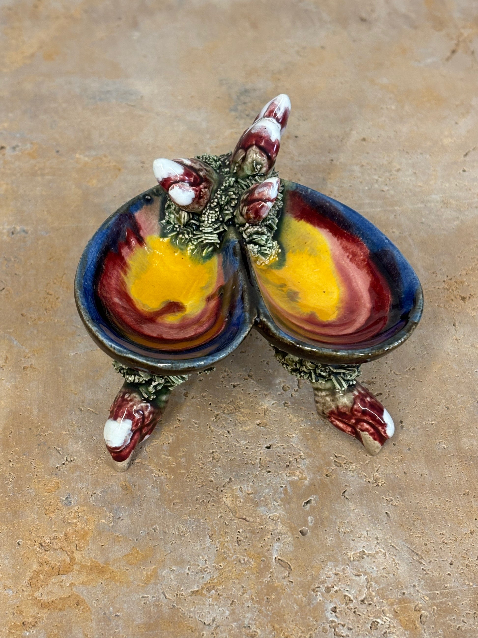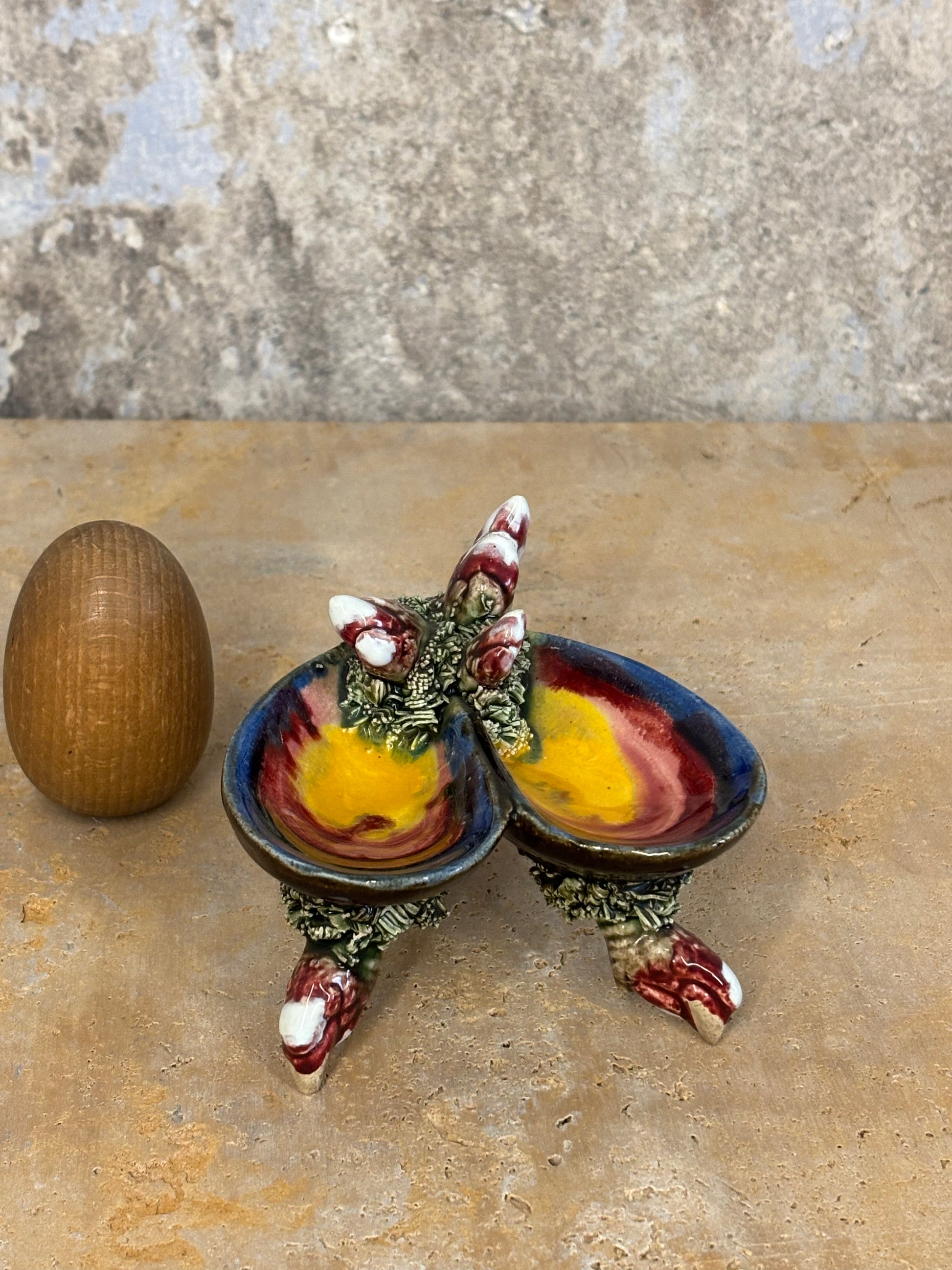 Pequeñas rabaneras o saleros de pellizco en Mayólica portuguesa Palissy en forma de mejillones y percebes.
