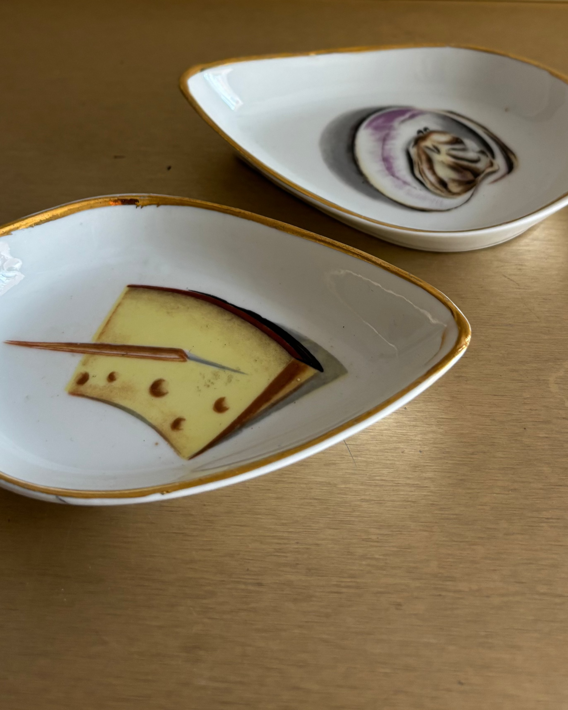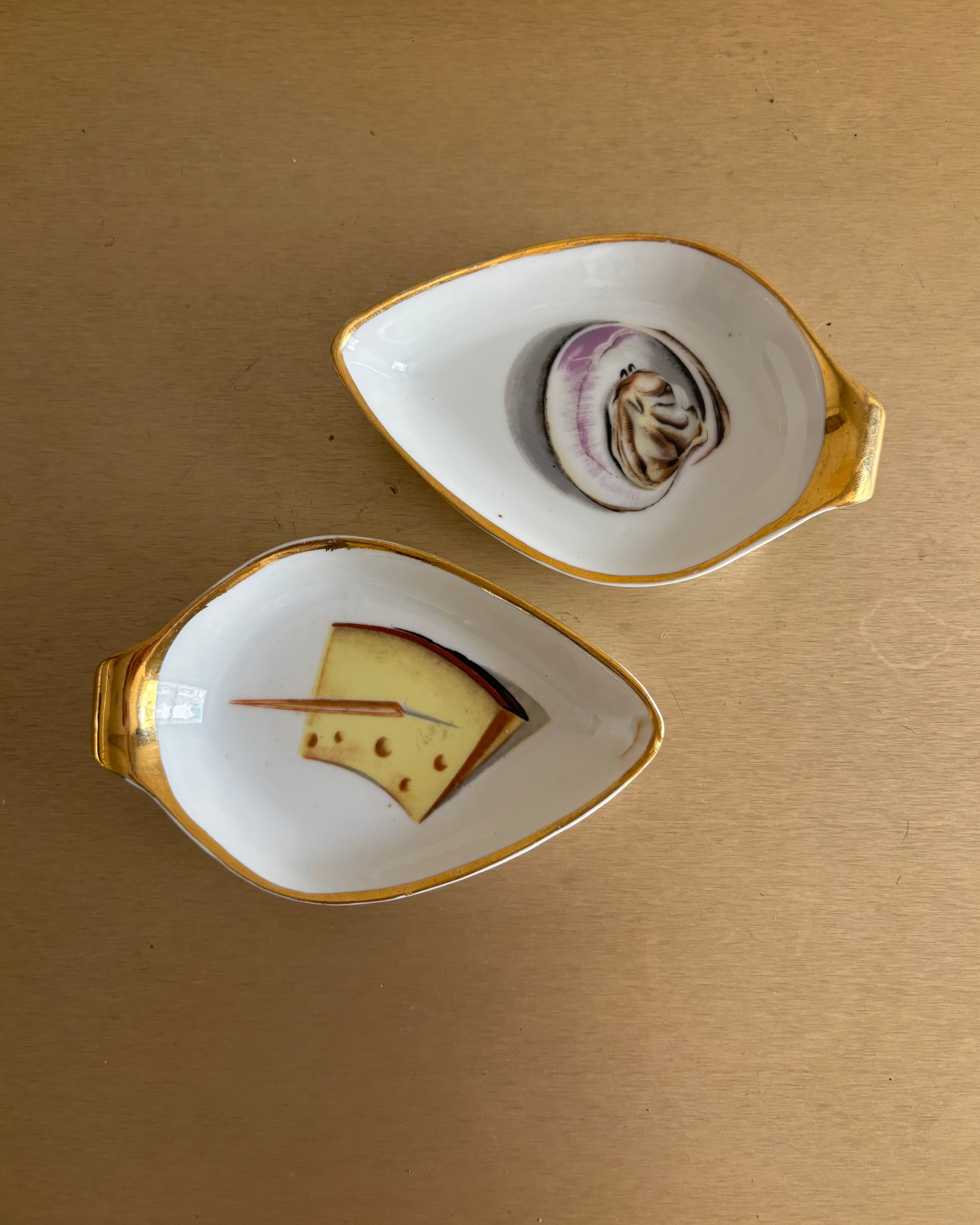 Set de 2 rabaneras en porcelana vintage en forma ovalada. El borde en hilo dorado.